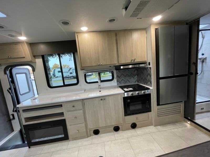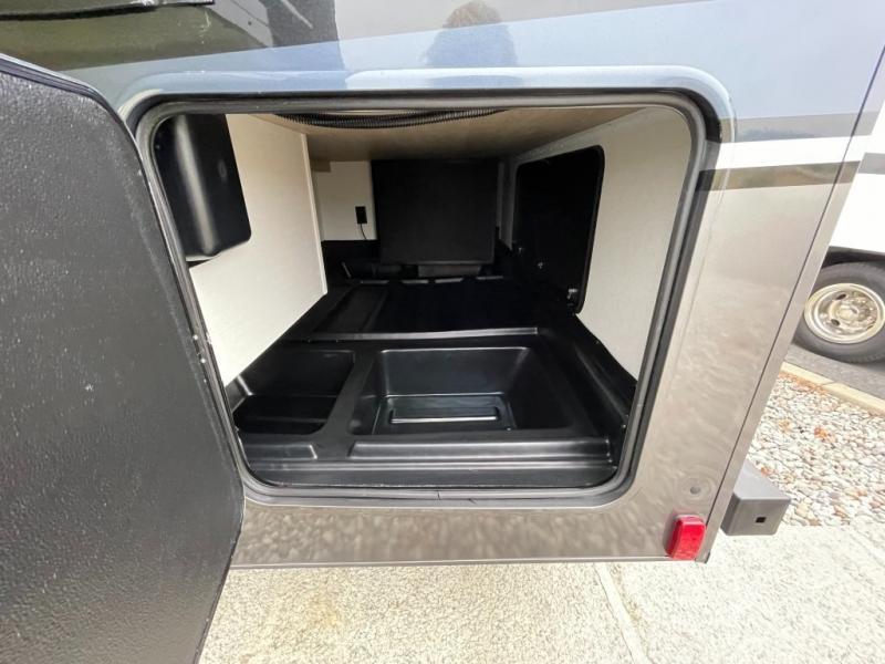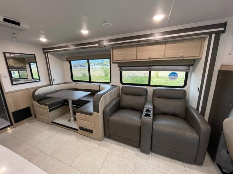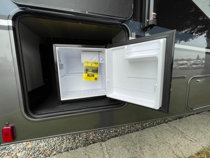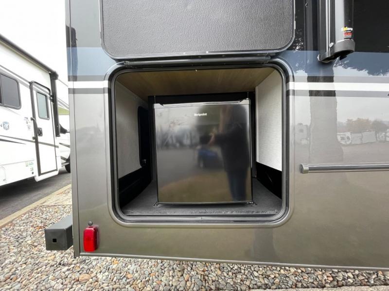 You'll have the time of your life in this Leprechaun Class C gas motorhome! There is a rear private bedroom with a queen-size bed and a wardrobe slide, and the bedroom is right next to the bathroom for convenience. Here you'll find a private toilet and sink with the shower right across the hall, and you can close off this space to make one big bathroom if you want! Out in the main living area, there is a large slide that holds the U-shaped dinette and sofa. These pieces of furniture sit directly across from the kitchen so that you can chat with the chef while preparing meals on the three-burner range or in the microwave. If you enjoy cooking outdoors, you might want to choose the optional camp kitchen!