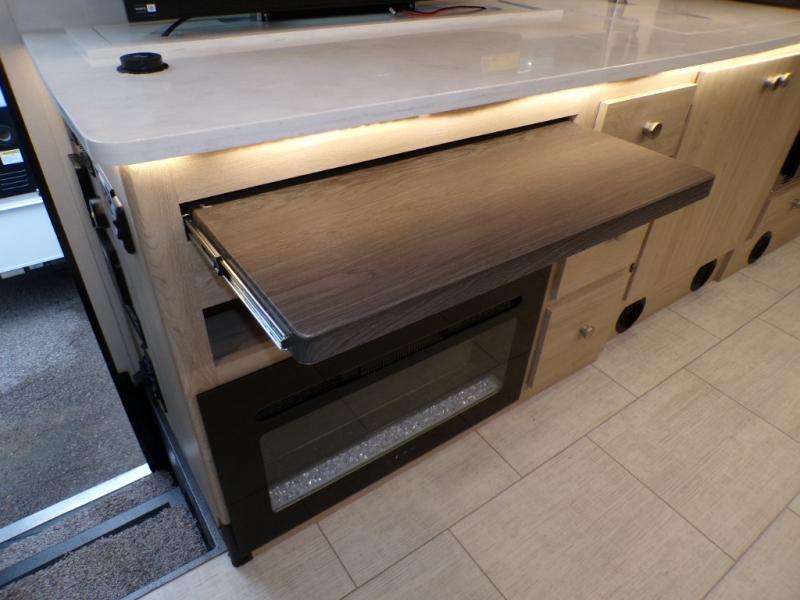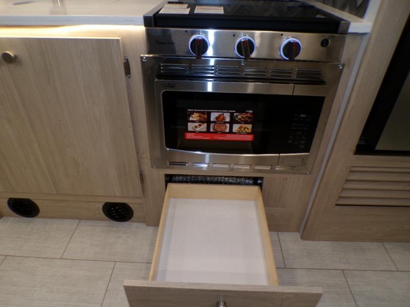 You'll have the time of your life in this Leprechaun Class C gas motorhome! There is a rear private bedroom with a queen-size bed and a wardrobe slide, and the bedroom is right next to the bathroom for convenience. Here you'll find a private toilet and sink with the shower right across the hall, and you can close off this space to make one big bathroom if you want! Out in the main living area, there is a large slide that holds the U-shaped dinette and sofa. These pieces of furniture sit directly across from the kitchen so that you can chat with the chef while preparing meals on the three-burner range or in the microwave. If you enjoy cooking outdoors, you might want to choose the optional camp kitchen!