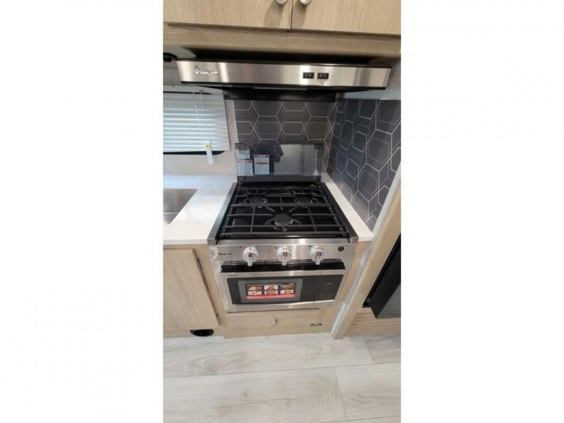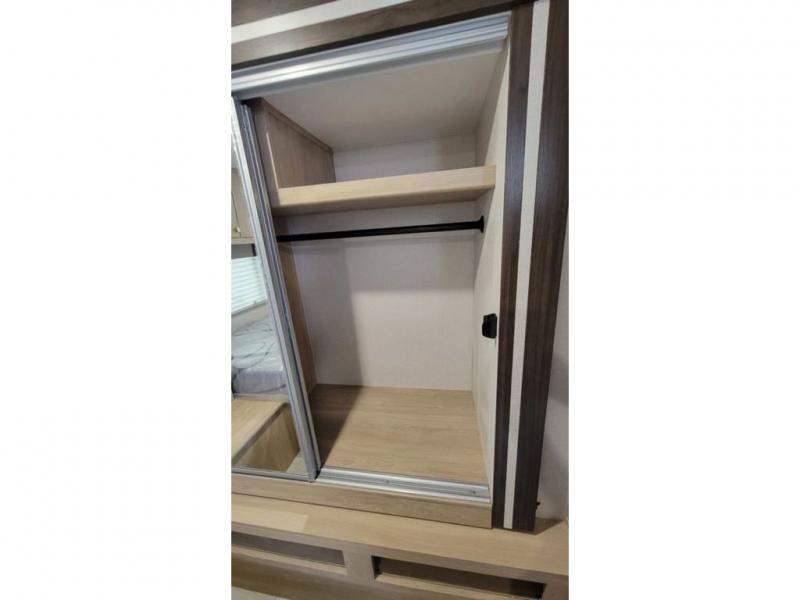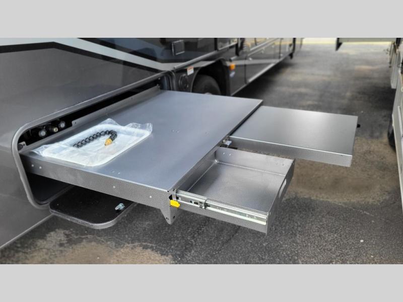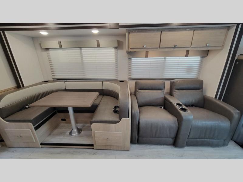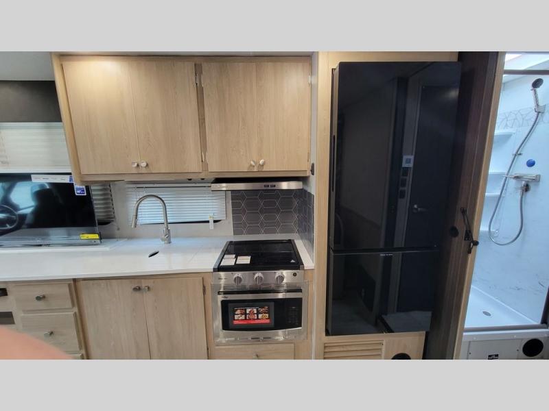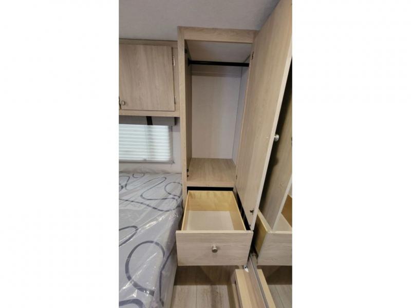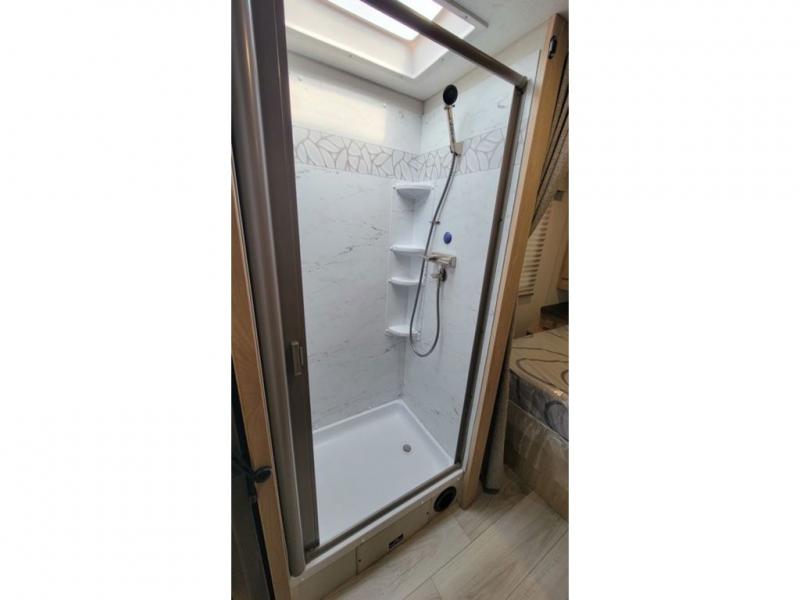 You'll have the time of your life in this Leprechaun Class C gas motorhome! There is a rear private bedroom with a queen-size bed and a wardrobe slide, and the bedroom is right next to the bathroom for convenience. Here you'll find a private toilet and sink with the shower right across the hall, and you can close off this space to make one big bathroom if you want! Out in the main living area, there is a large slide that holds the U-shaped dinette and sofa. These pieces of furniture sit directly across from the kitchen so that you can chat with the chef while preparing meals on the three-burner range or in the microwave. If you enjoy cooking outdoors, you might want to choose the optional camp kitchen!