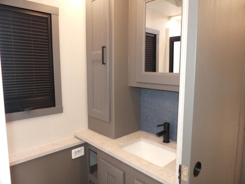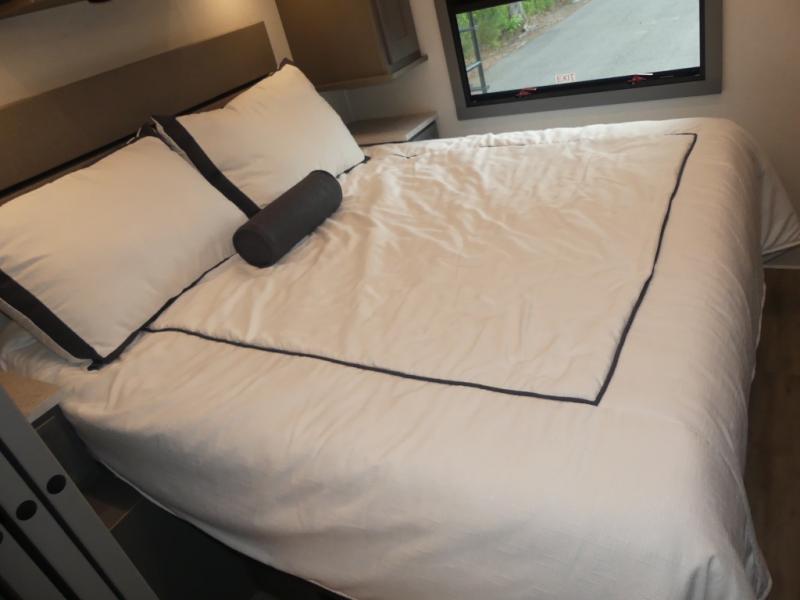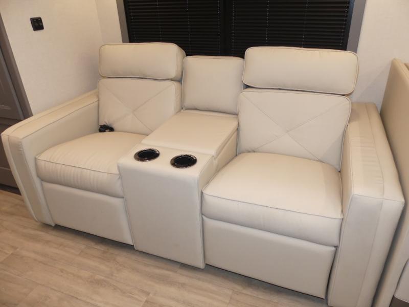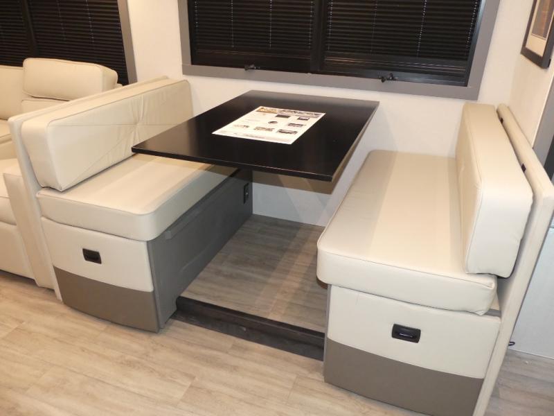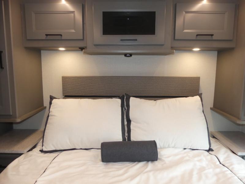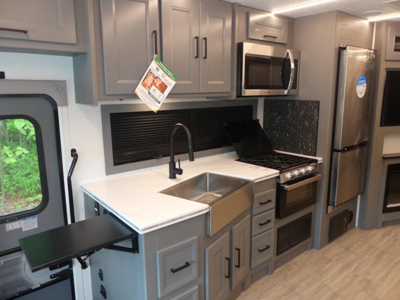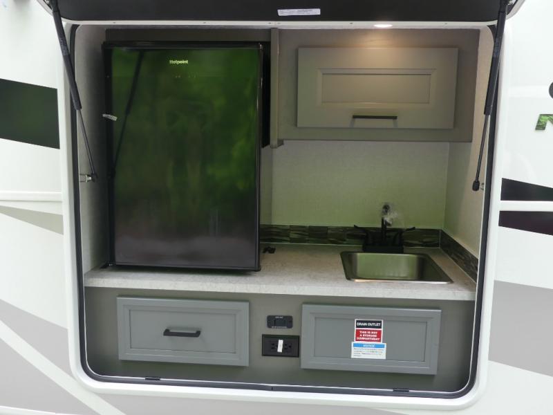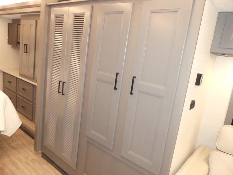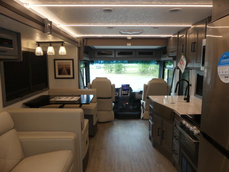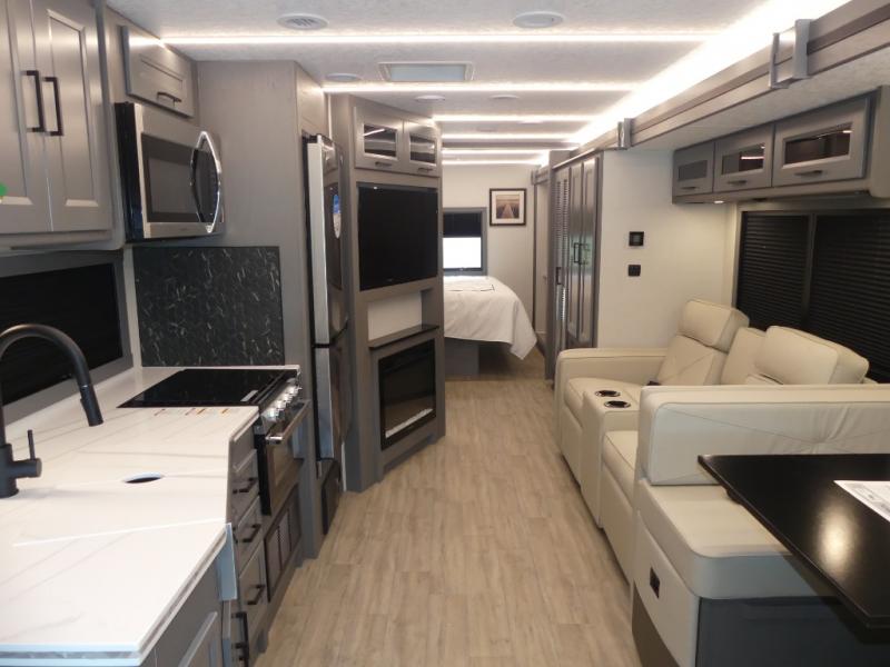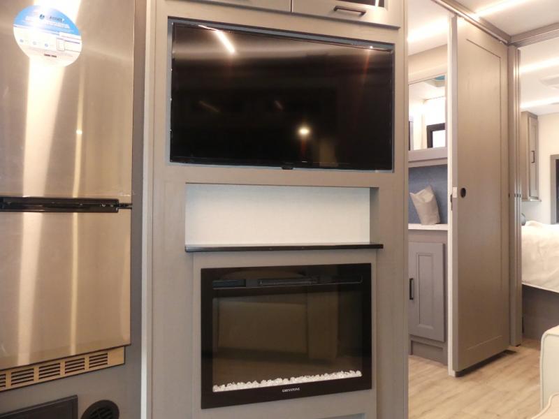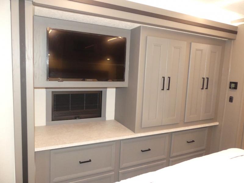 You and your family will be fascinated with this motor home. Perfect for family and guests due to its plenty of room to sleep, like the 70" x 74" king bed for a couple, and the 47" x 81" overhead bunk where two more people can easily fit. This unit is equipped with all the facilities need for a comfortable ride starting with a full bathroom with a 30" x 36" shower, interior kitchen with fridge, farm sink, three cooktop burners, microwave and a 42" x 76" dinette ideal to eat the dinner comfortably. You can also have relaxing and entertaining time whether watching the TV in the living room while enjoying the fireplace or in the 32" bedroom LED TV. In this motorhome, you will also find plenty of space to store your stuff in diverse parts, like wardrobe, dresser, and overhead cabinets in the bedroom area, as well as linen/ pantry and overhead cabinets in the kitchen area. Finally, enjoy the nicest meals in the outdoor kitchen, allowing you to have a great time having food while admiring the surroundings.