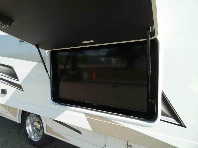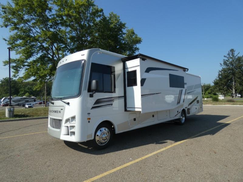 Each Mirada Class A gas motorhome by Coachmen is constructed with a crowned, laminated fiberglass roof with Azdel Superlite composite for added durability, along with high gloss gelcoat sidewalls. There is a 7.3L V8 engine on a Ford F53 chassis for power you can feel, and a 10" touch screen radio with AM/FM radio with Bluetooth capability. The 5.5 kW gas generator, dual coach batteries, and 100W solar panel with a controller will meet all your power needs, and the automatic leveling jacks make setting up camp a breeze. Head inside to find premium linoleum throughout, hardwood cabinet doors, kitchen tile backsplash, and solar privacy shades throughout to name a few comforts. The open road is yours for the taking in a Mirada Class A gas motorhome!