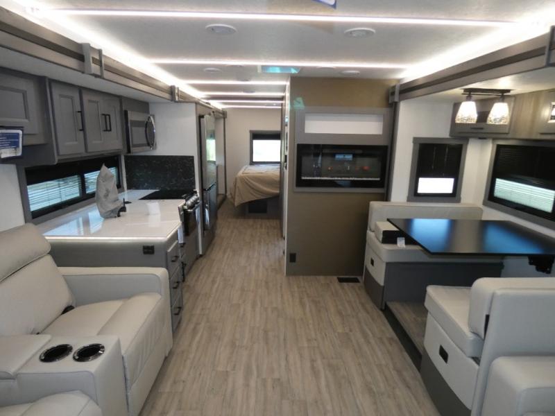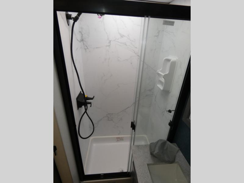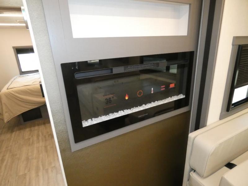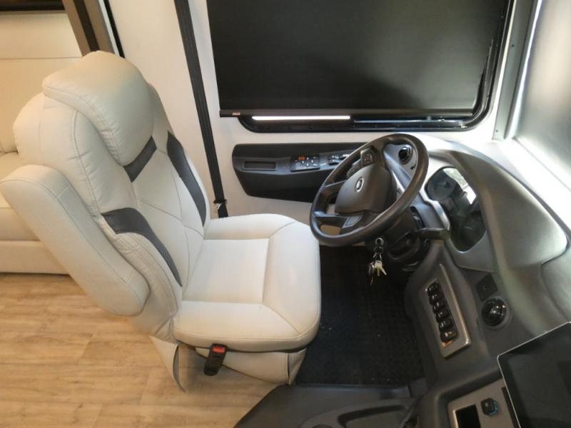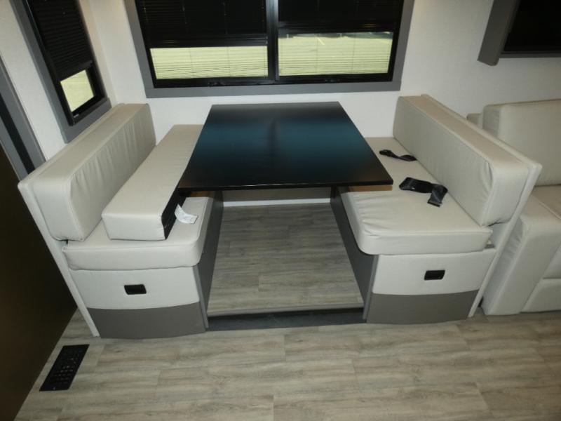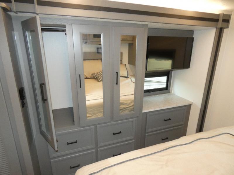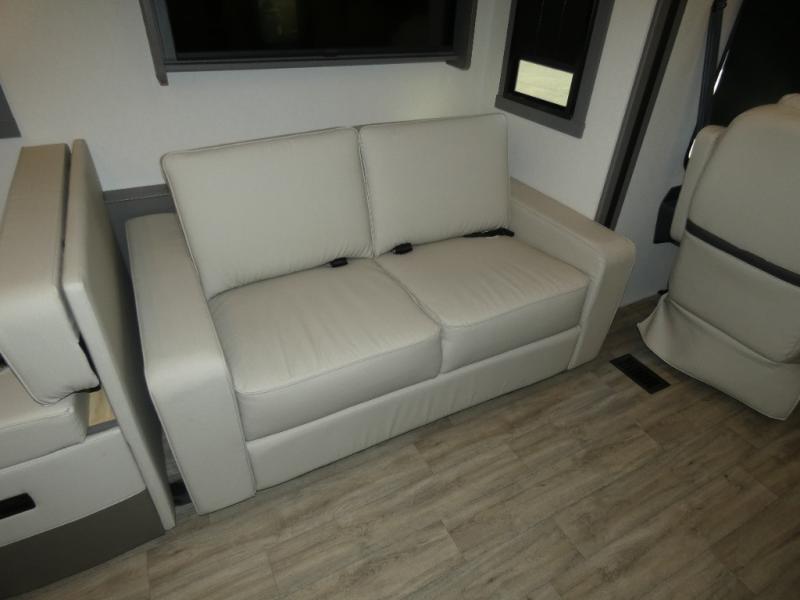 Your family will love this spacious coach for trips across the country or your local state park. The swivel captain's seats provide more seating, along with the sofa bed, theater seating, and booth dinette. There is a 50" Smart TV for rainy day movies and an exterior LED TV under the 20' power awning if the weather is cooperating. The full bath includes a glass shower door, plenty of counter space, and a shower skylight for added light, and the rear bedroom will be your oasis away from it all. Here, you'll find a king bed, a wardrobe for your clothes, plus a 32" LED TV.