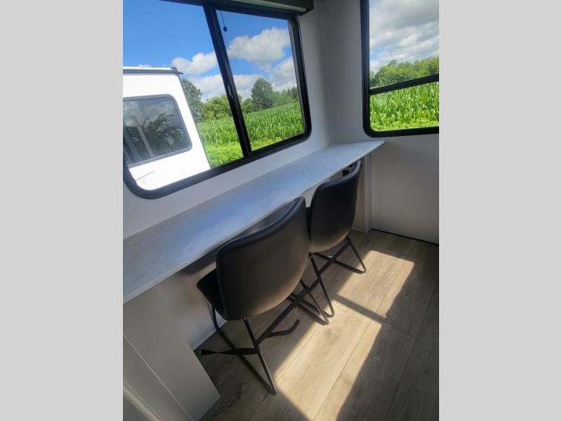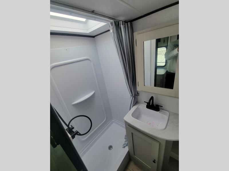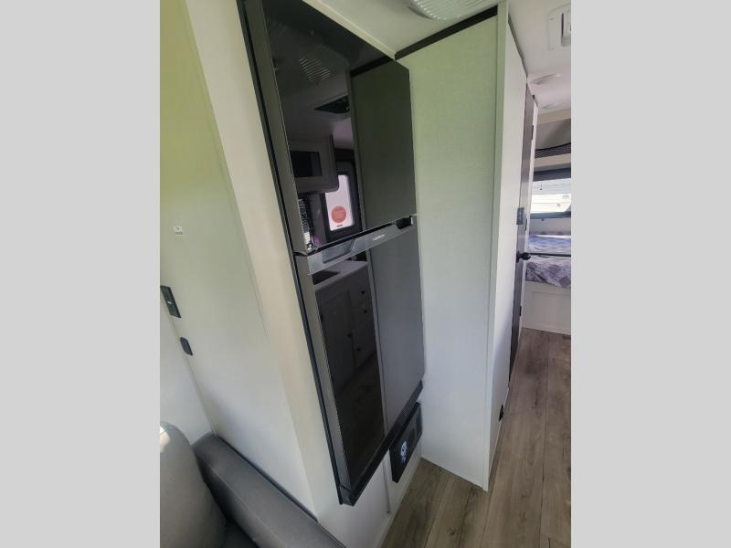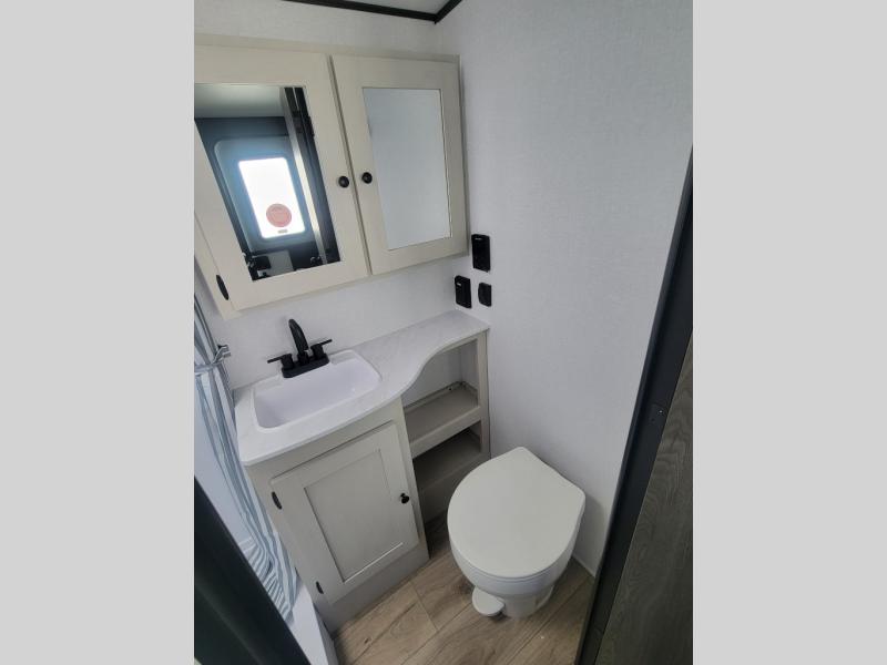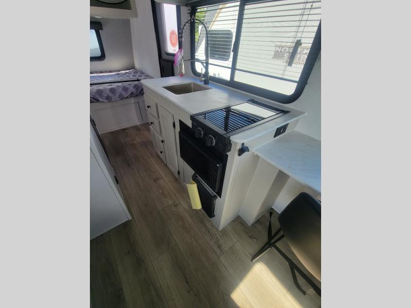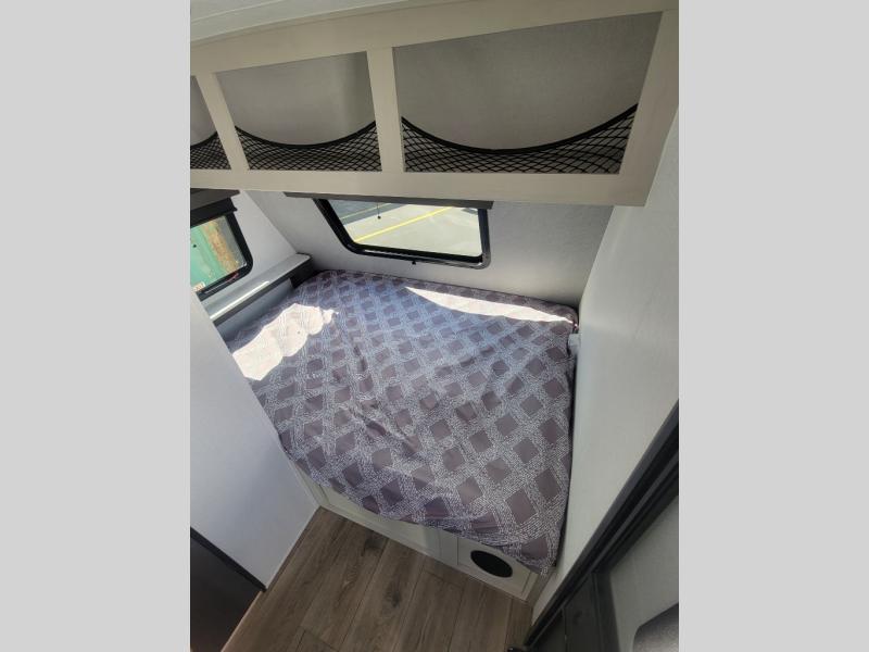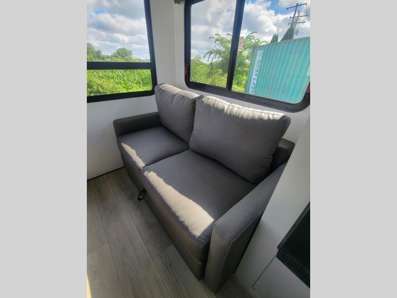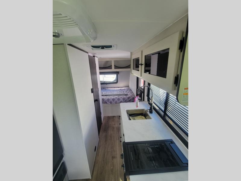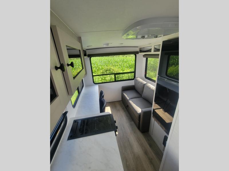 You'll love every minute spent in this travel trailer for three to four. A front bed will provide a great night's rest, while your guest or two little ones take the 60" sofa in the back. There is a full bath onboard to freshen up each day, and the kitchen with a two burner cooktop will let you make breakfast for your crew. You can dine at the bar top across from the sofa, or take your plate outdoors to sit under the 14' power awning.