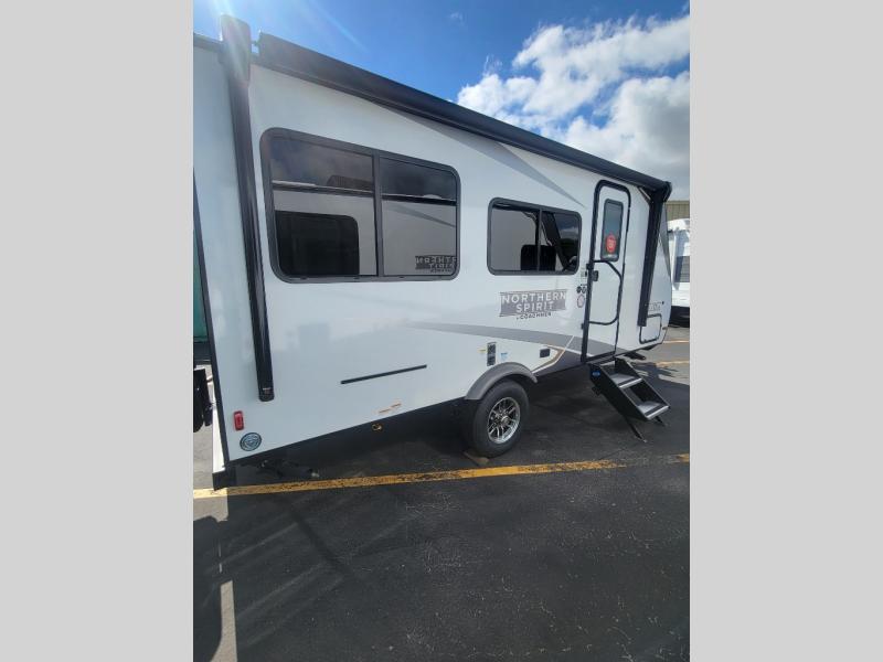 With any Northern Spirit Bijou travel trailer by Coachmen, you will find a solid built RV thanks to the dual Azdel laminated and aluminum framed sidewalls and rear wall, a fully walkable roof, plus a Darco subfloor protective wrap/enclosure. There is also a premium exterior graphics package, Keyed Alike compartment doors, a power awning with an LED light, and fishing pole storage in the front pass-through. The interior will have you feeling right at home with stylish night shades, seamless Thermofoil countertops, Congoleum linoleum flooring, and a stainless steel sink. The USB ports throughout will help you keep your electronics charged, and the TV prep will give you the option to add a television for entertainment.