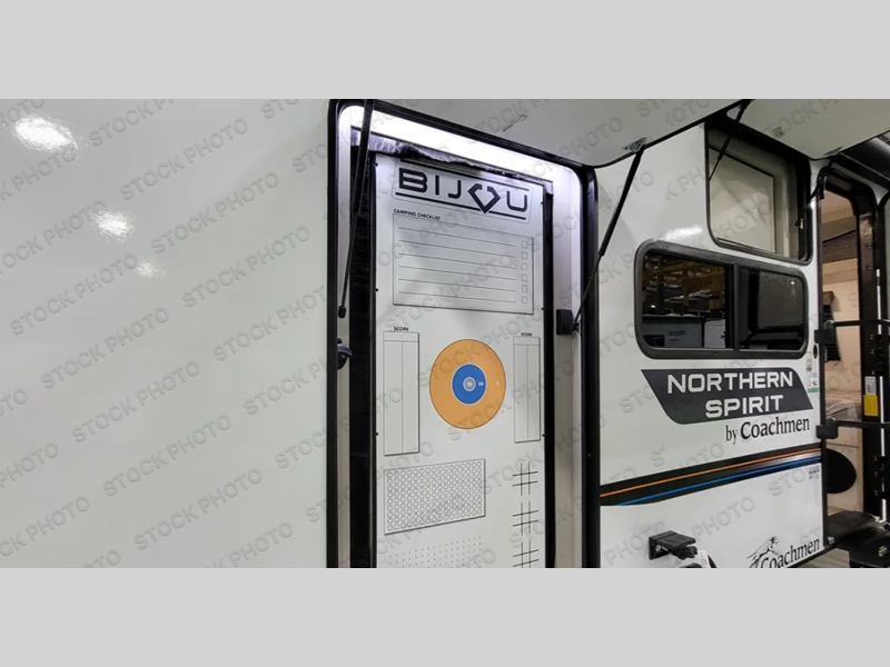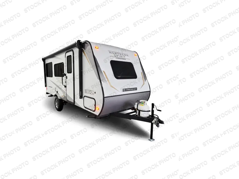 With any Northern Spirit Bijou travel trailer by Coachmen, you will find a solid built RV thanks to the dual Azdel laminated and aluminum framed sidewalls and rear wall, a fully walkable roof, plus a Darco subfloor protective wrap/enclosure. There is also a premium exterior graphics package, Keyed Alike compartment doors, a power awning with an LED light, and fishing pole storage in the front pass-through. The interior will have you feeling right at home with stylish night shades, seamless Thermofoil countertops, Congoleum linoleum flooring, and a stainless steel sink. The USB ports throughout will help you keep your electronics charged, and the TV prep will give you the option to add a television for entertainment.