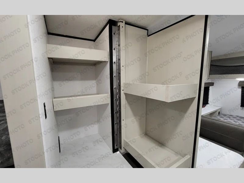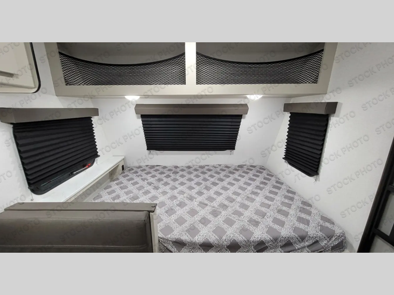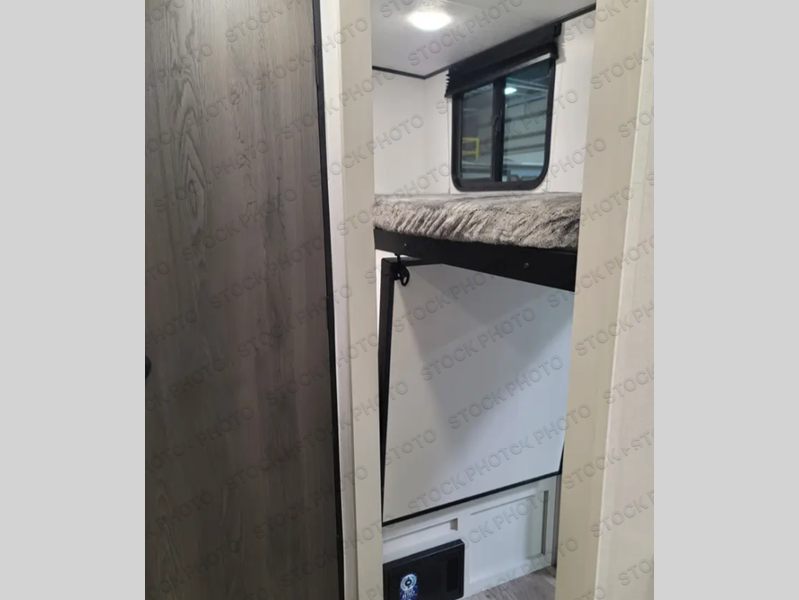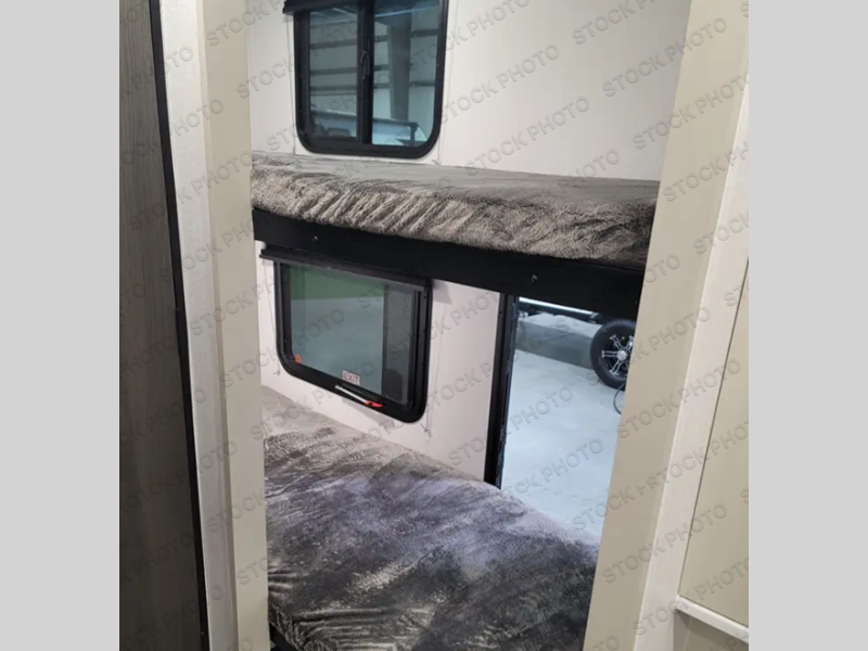 The Bijou bunkhouse model is perfect for your family of four or five! The children will love the 74" x 30" bunks in the rear roadside corner conveniently located next to the rear corner bath making nighttime use easy for little ones. The booth dinette with a table can also be transformed into added sleeping if you have one more guest. Up front, a 54" x 74" bed with overhead storage and a 40" x 22" windshield for a view. This is also where your front pass-through storage will be located beneath for tons of easy storage for outdoor rugs, camp chairs, games and more. For cooking, you'll find a microwave under the cooktop and a refrigerator to store leftovers.