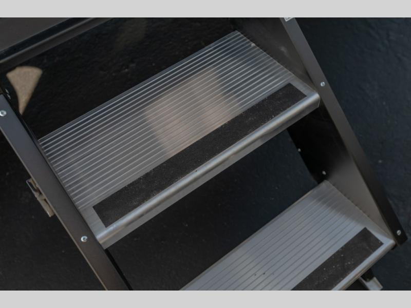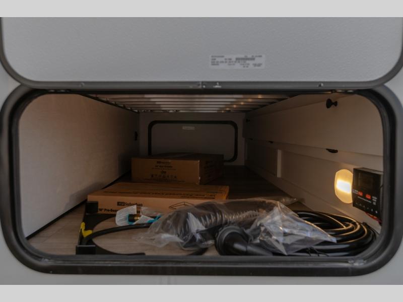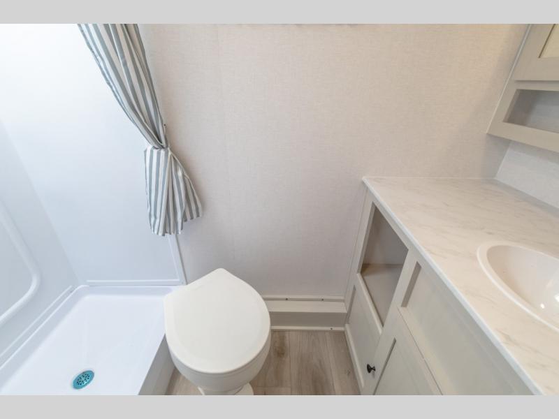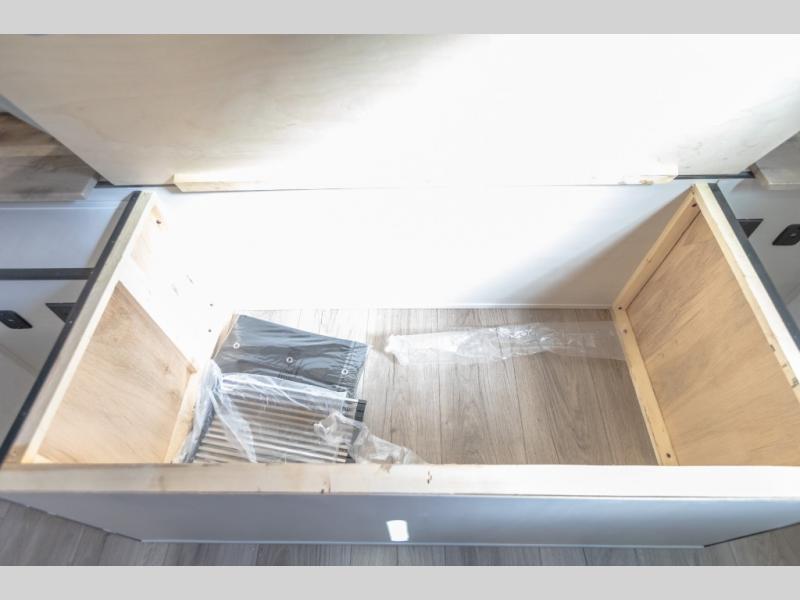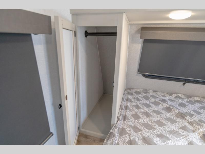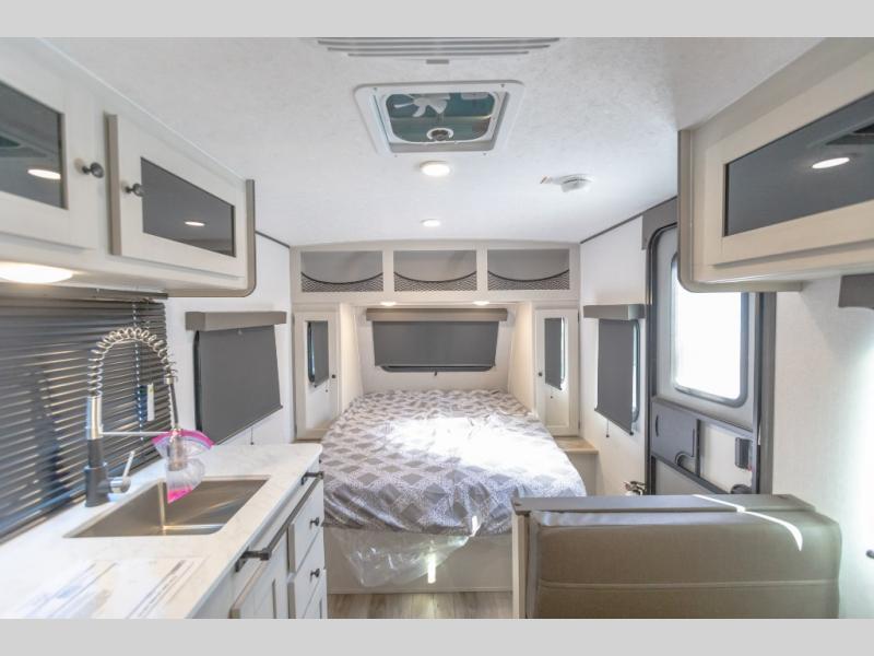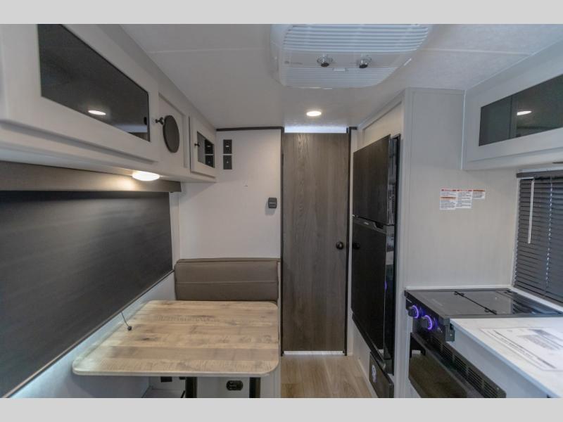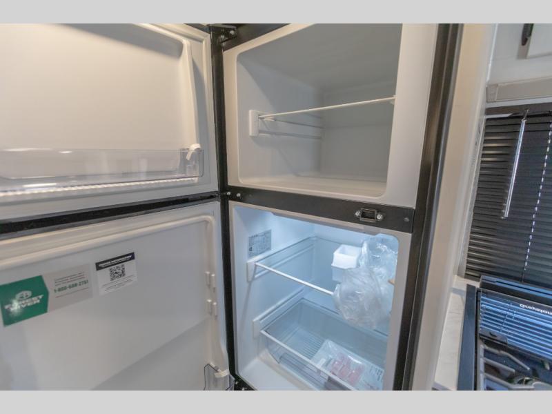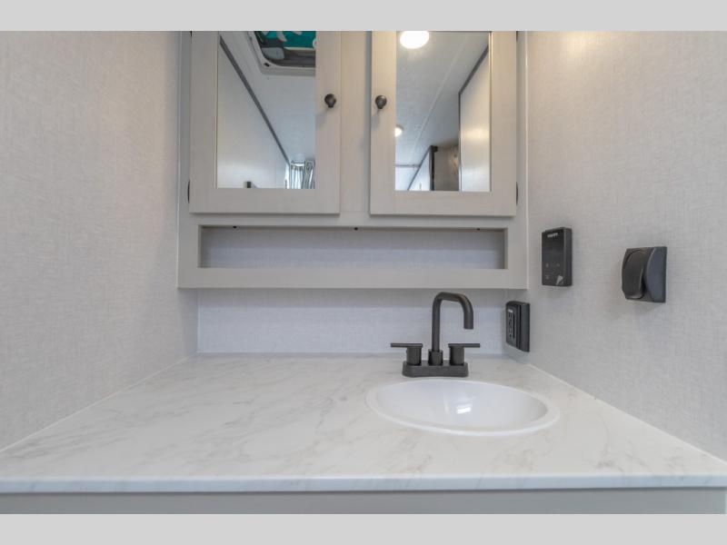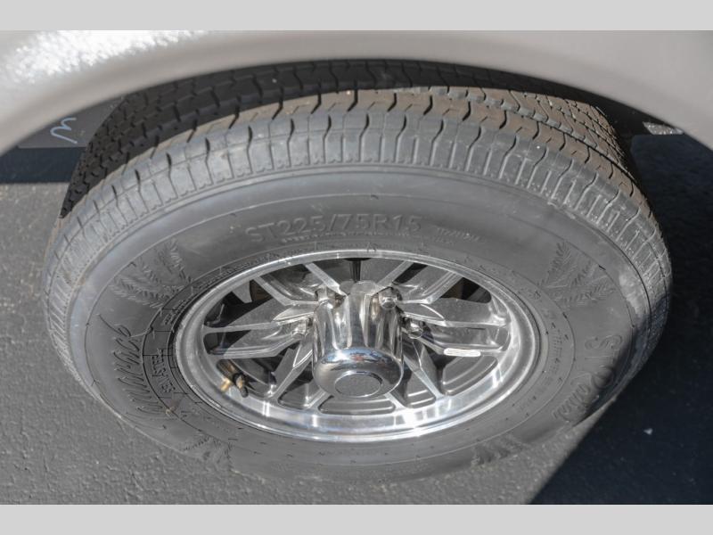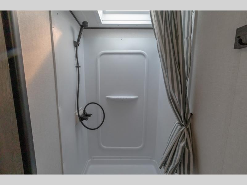 Enjoy fun camping experiences in this cozy camper for two to four depending on size! You will love the full rear bath with a nice vanity and sink including a medicine cabinet, toilet, and shower. There is a booth dinette for dining and games, and it can also be transformed into sleeping for one or two depending on size. Opposite the dinette, you will find your functional kitchen with a refrigerator, cooktop, and round single sink. Overhead cabinets plus drawers and cupboards below allow for ample storage of your dishes and dry goods. In front, there is a comfortable bed for two with wardrobes on either side and overhead cabinets for your personal belongings. There is also storage beneath the bed for larger items like extra blankets or your suitcases. There is also an exterior pass-thru storage compartment in front for your camp chairs and games!