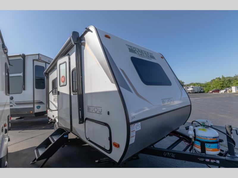 With any Northern Spirit Bijou travel trailer by Coachmen, you will find a solid built RV thanks to the dual Azdel laminated and aluminum framed sidewalls and rear wall, a fully walkable roof, plus a Darco subfloor protective wrap/enclosure. There is also a premium exterior graphics package, Keyed Alike compartment doors, a power awning with an LED light, and fishing pole storage in the front pass-through. The interior will have you feeling right at home with stylish night shades, seamless Thermofoil countertops, Congoleum linoleum flooring, and a stainless steel sink. The USB ports throughout will help you keep your electronics charged, and the TV prep will give you the option to add a television for entertainment.