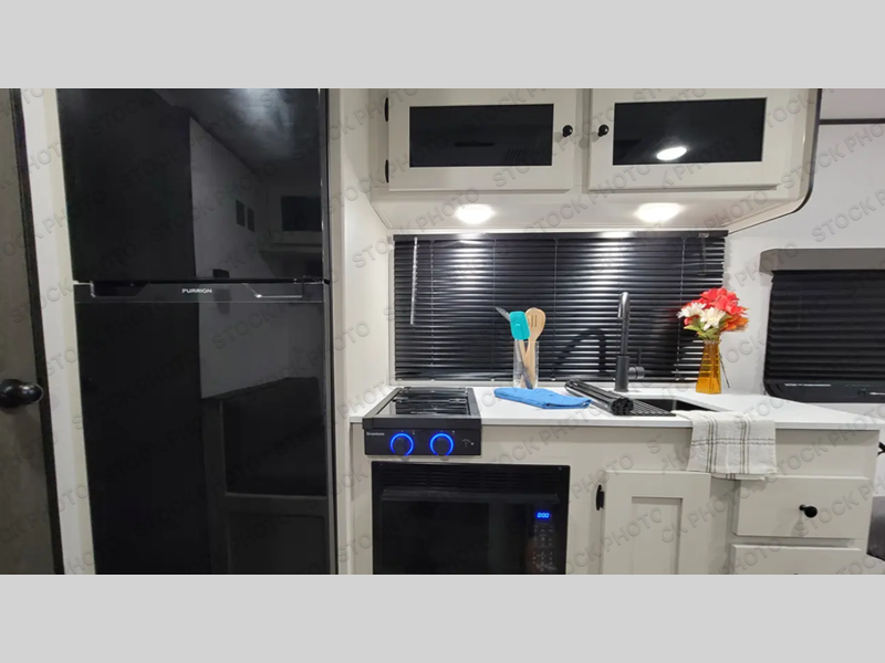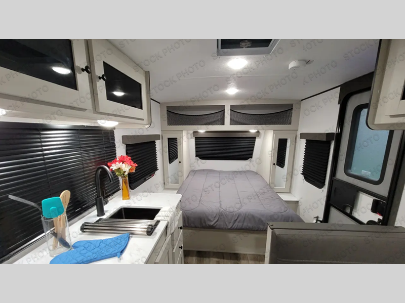 Enjoy fun camping experiences in this cozy camper for two to four depending on size! You will love the full rear bath with a nice vanity and sink including a medicine cabinet, toilet, and shower. There is a booth dinette for dining and games, and it can also be transformed into sleeping for one or two depending on size. Opposite the dinette, you will find your functional kitchen with a refrigerator, cooktop, and round single sink. Overhead cabinets plus drawers and cupboards below allow for ample storage of your dishes and dry goods. In front, there is a comfortable bed for two with wardrobes on either side and overhead cabinets for your personal belongings. There is also storage beneath the bed for larger items like extra blankets or your suitcases. There is also an exterior pass-thru storage compartment in front for your camp chairs and games!