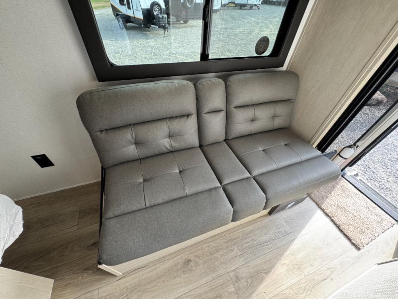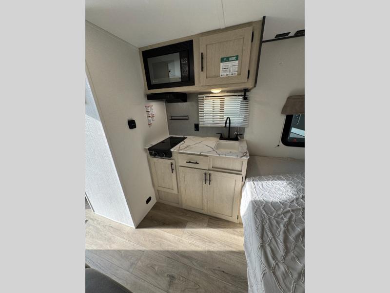 This trailer is perfect for couples or weekend trips to the lake with your buddy. There is a front queen bed with an overhead cabinet, a wardrobe, plus a bed shelf to keep valuables close by, and the sofa will provide seating and sleeping space for guests. There is a private bathroom with a toilet and a shower so you won't have to use the camp's facilities in the middle of the night. You will love having a two burner cooktop and microwave oven to cook meals each day, plus there is a 8 cu. ft. refrigerator for cold items!