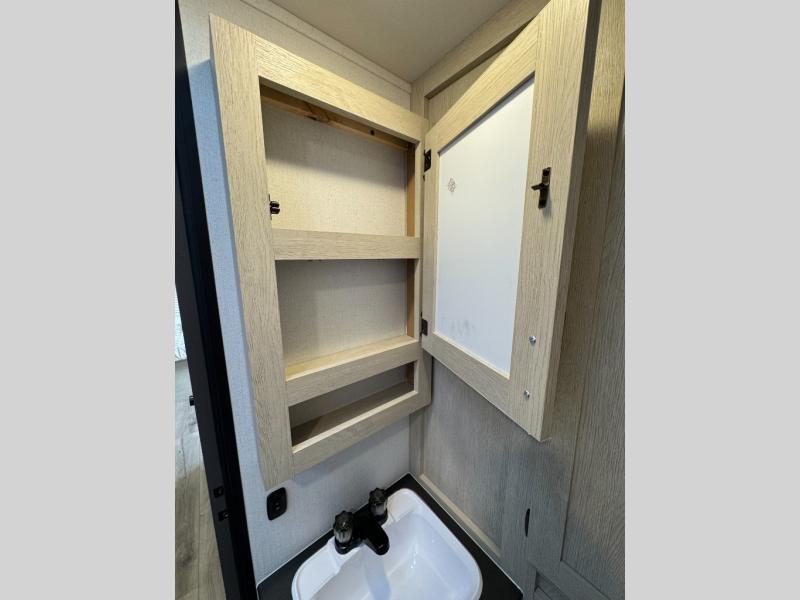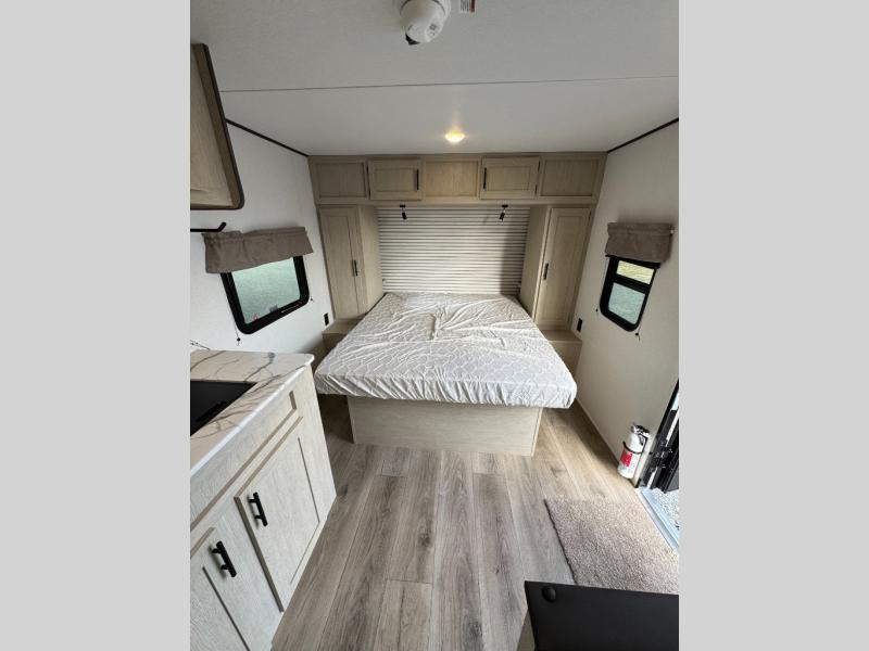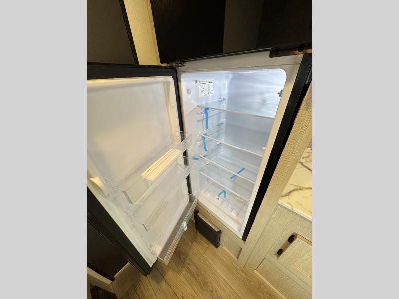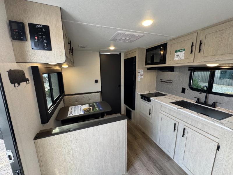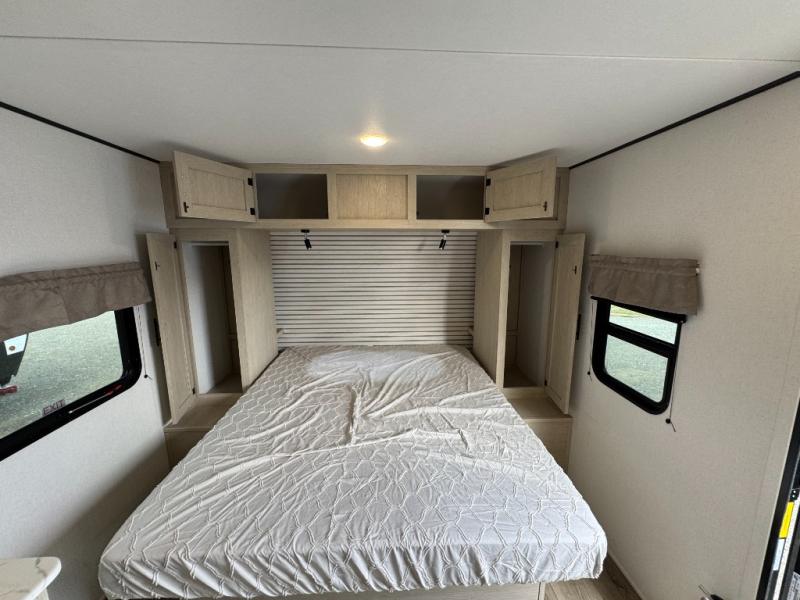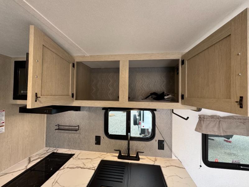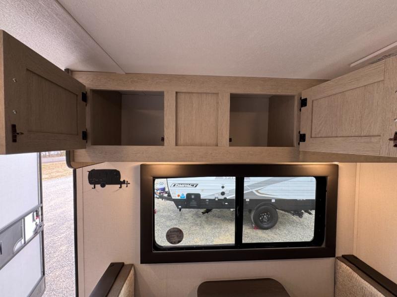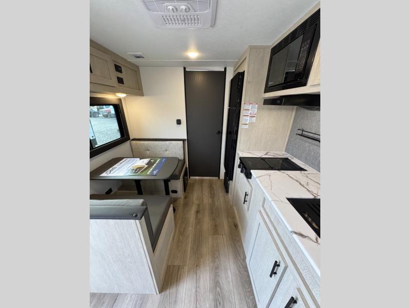 This travel trailer will feel just like home since there is a front bedroom with a Queen bed, dual wardrobes to keep your clothes tidy, plus a spacious full rear bath. There is a spacious shower, plus a medicine cabinet and a spacious bath linen closet to keep clean towels close by. Head to the kitchen to prepare lunch on the cooktop or use the microwave cabinet to heat up leftovers. There is a booth dinette where you can dine together and even let an overnight guest or two little ones sleep on!