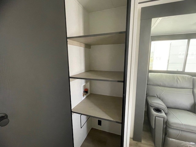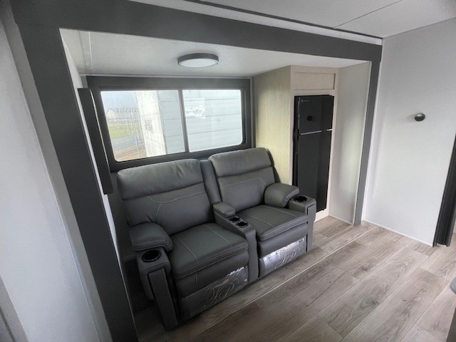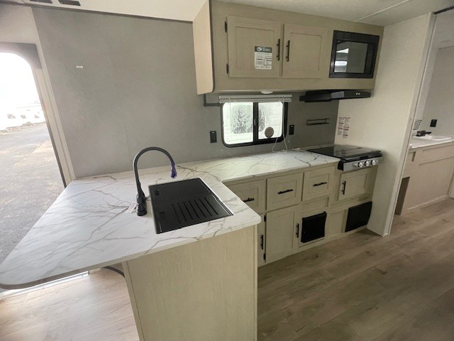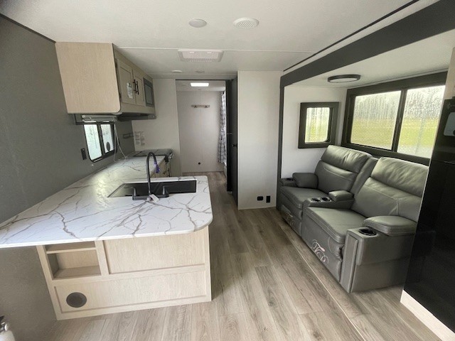You'll feel right at home in this spacious travel trailer thanks to the large slide out, front bedroom, and full rear bath. There is a 24" x 40" tub, a toilet with partitions, and dual bath sinks with a mirror which allow you both to get ready for bed at once. The fully-equipped interior kitchen includes generous counter space to prep meals, and the outside kitchen will be perfect when the weather is nice. A large pantry will give you a place to store food, paper products, and more, plus this space is washer/dryer ready if you choose to add those appliances.