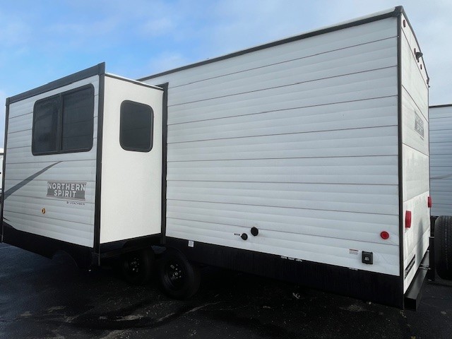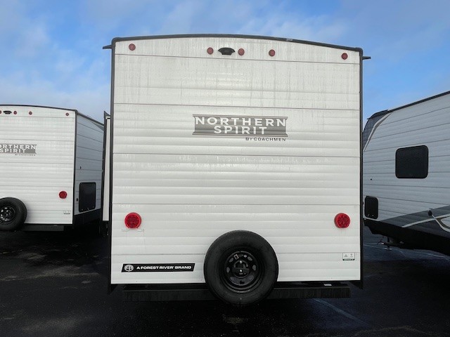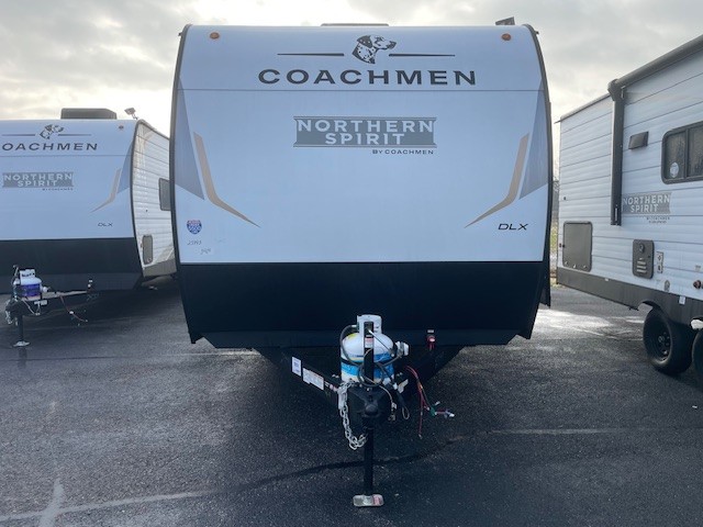 In any Northern Spirit DLX travel trailer by Coachmen, you will find quality craftsmanship along with an affordable price tag. These units each feature a straight axle with electric breaks to make setting up easier and an enclosed underbelly for added protection as you travel. The Base Camp Package provides each unit with black tank flush, a monitor panel for quick access to the functions of your unit, a 13.5K A/C unit, and a tankless water heater for added convenience. Inside, you'll find USB charging stations throughout, skylights, LED interior lights and more comforts!