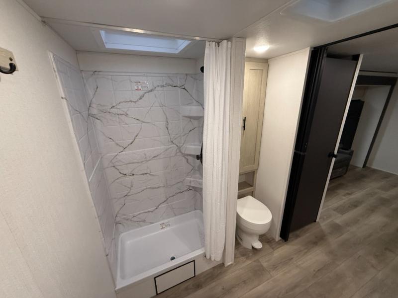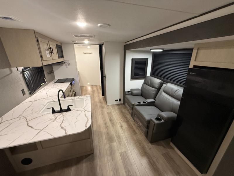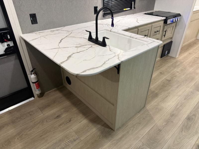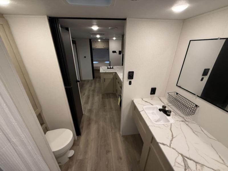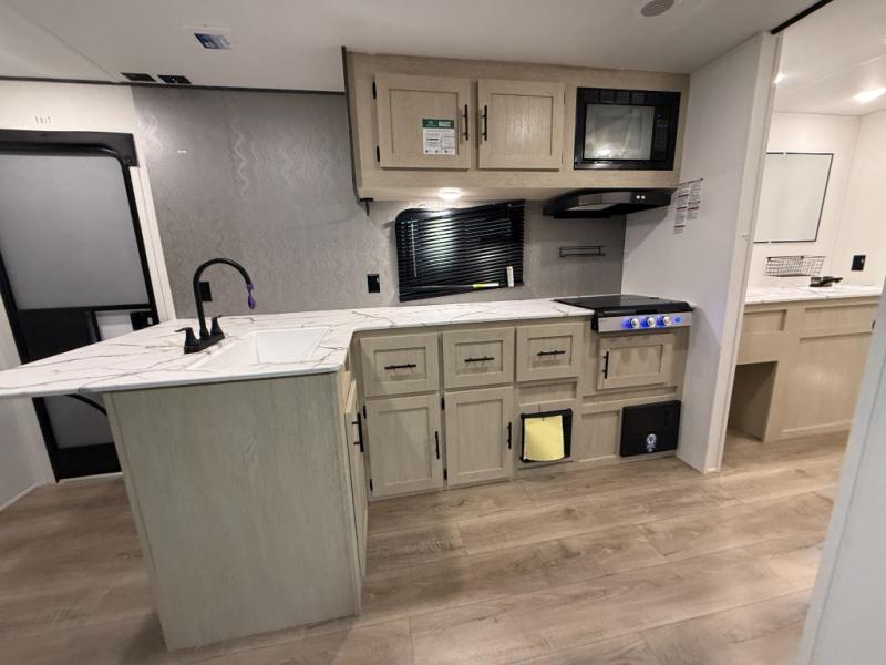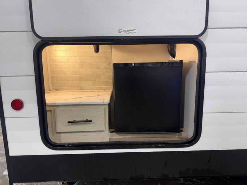 You'll feel right at home in this spacious travel trailer thanks to the large slide out, front bedroom, and full rear bath. There is a 24" x 40" tub, a toilet with partitions, and dual bath sinks with a mirror which allow you both to get ready for bed at once. The fully-equipped interior kitchen includes generous counter space to prep meals, and the outside kitchen will be perfect when the weather is nice. A large pantry will give you a place to store food, paper products, and more, plus this space is washer/dryer ready if you choose to add those appliances.