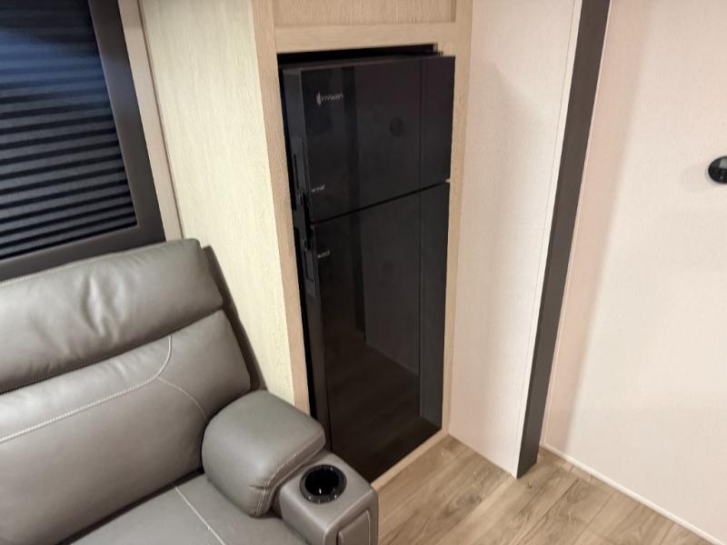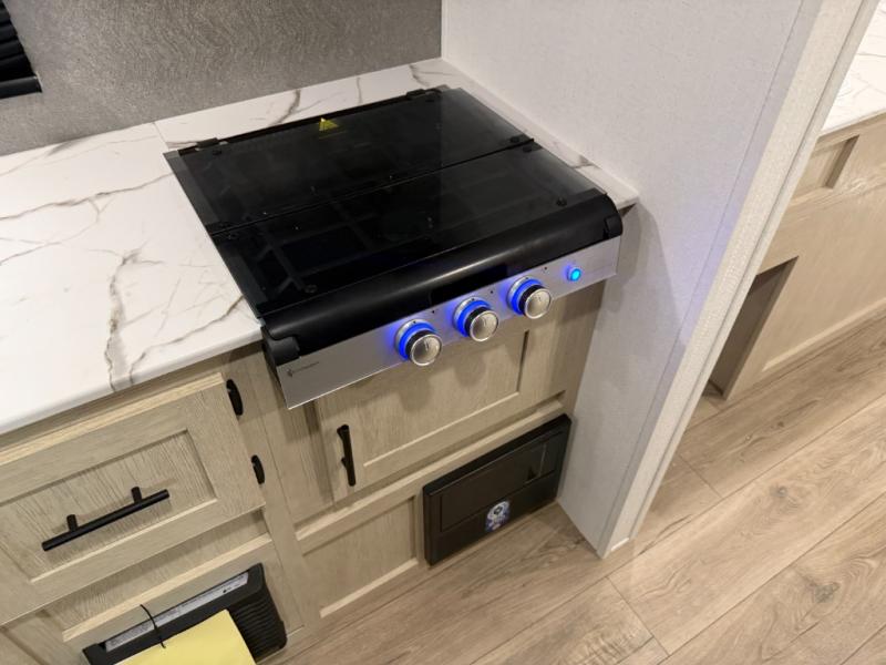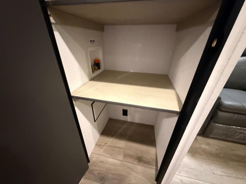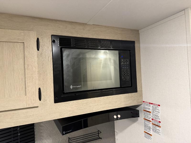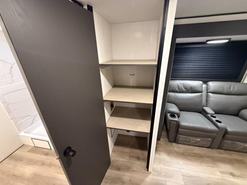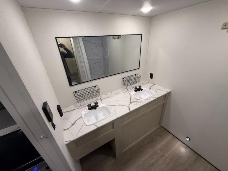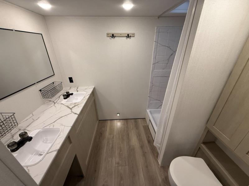 You'll feel right at home in this spacious travel trailer thanks to the large slide out, front bedroom, and full rear bath. There is a 24" x 40" tub, a toilet with partitions, and dual bath sinks with a mirror which allow you both to get ready for bed at once. The fully-equipped interior kitchen includes generous counter space to prep meals, and the outside kitchen will be perfect when the weather is nice. A large pantry will give you a place to store food, paper products, and more, plus this space is washer/dryer ready if you choose to add those appliances.