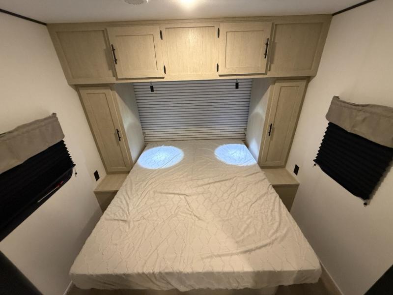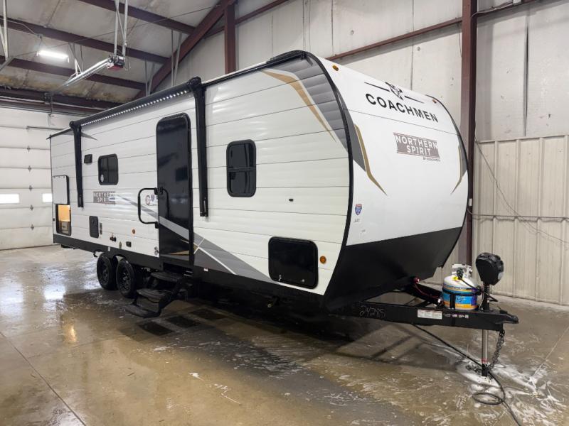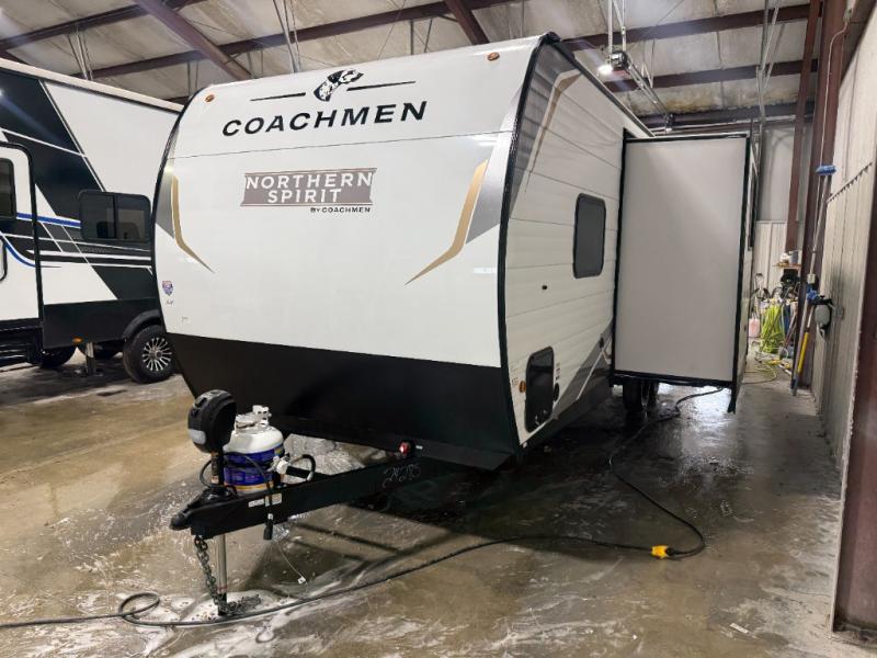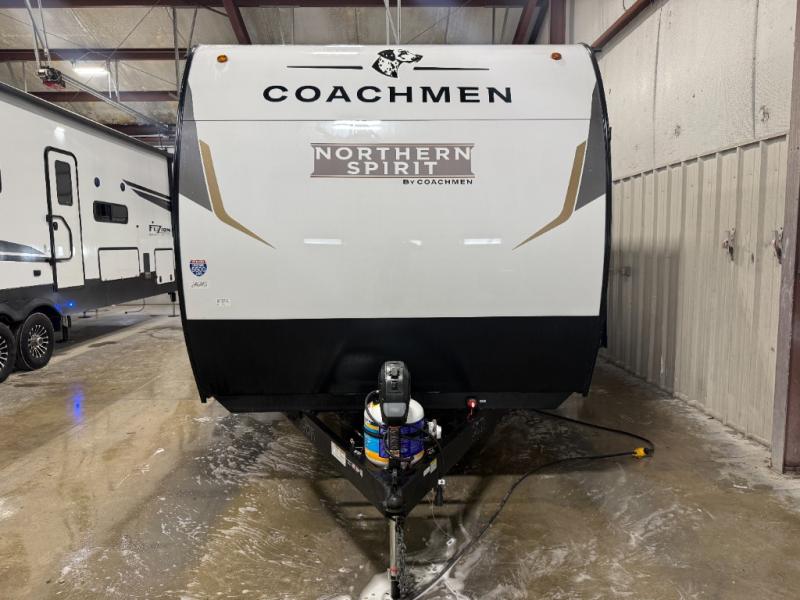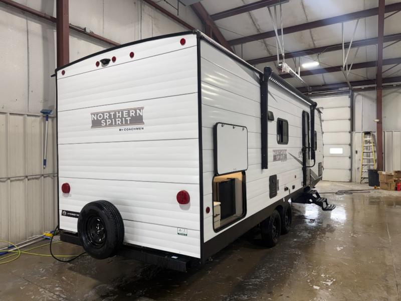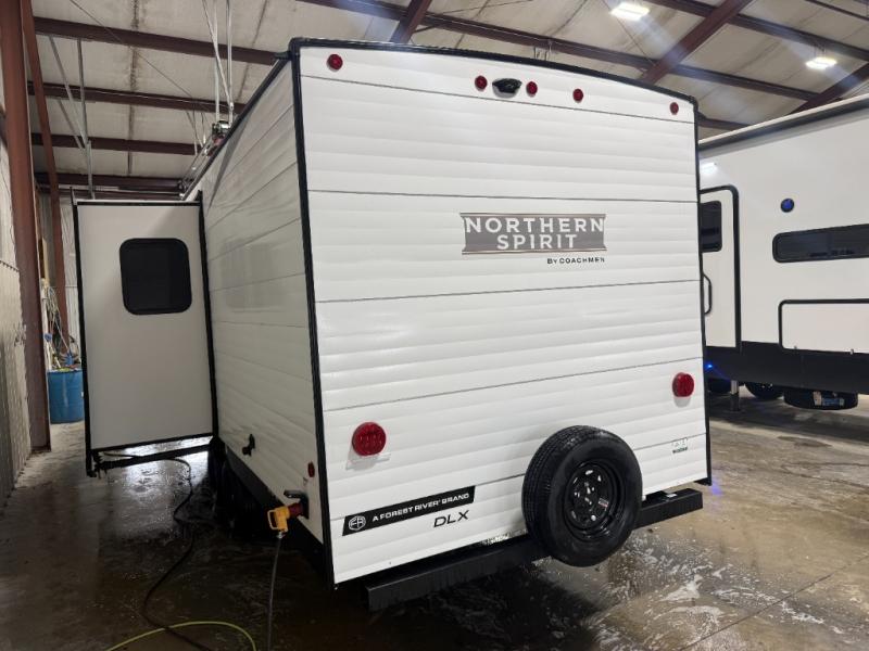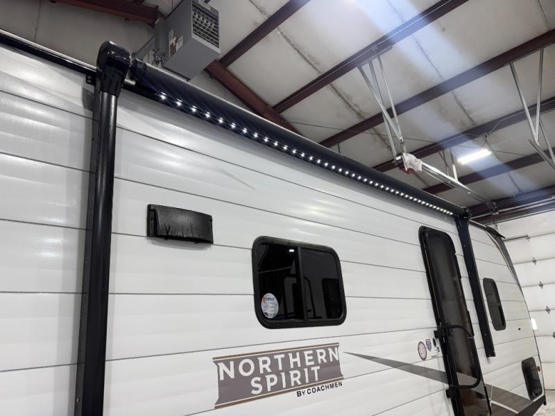 In any Northern Spirit DLX travel trailer by Coachmen, you will find quality craftsmanship along with an affordable price tag. These units each feature a straight axle with electric breaks to make setting up easier and an enclosed underbelly for added protection as you travel. The Base Camp Package provides each unit with black tank flush, a monitor panel for quick access to the functions of your unit, a 13.5K A/C unit, and a tankless water heater for added convenience. Inside, you'll find USB charging stations throughout, skylights, LED interior lights and more comforts!