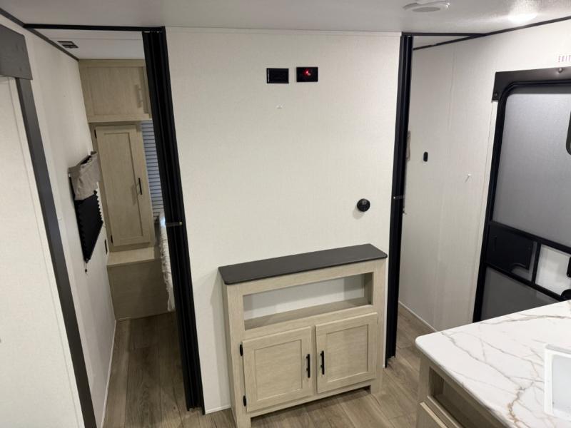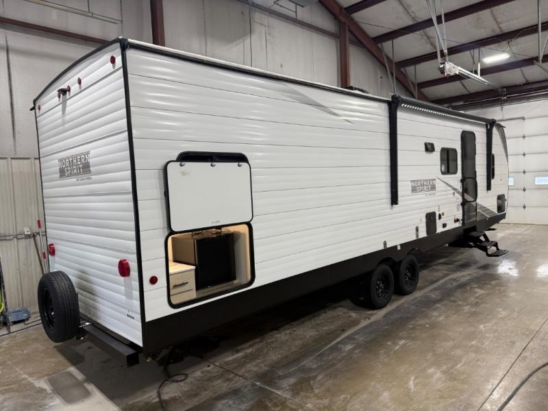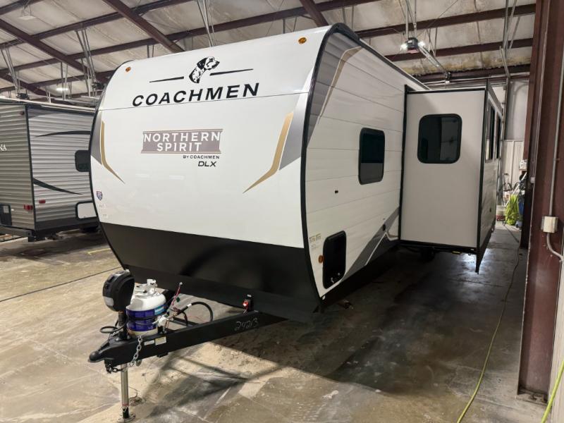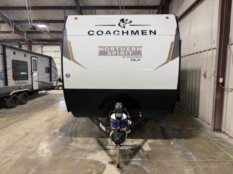 In any Northern Spirit DLX travel trailer by Coachmen, you will find quality craftsmanship along with an affordable price tag. These units each feature a straight axle with electric breaks to make setting up easier and an enclosed underbelly for added protection as you travel. The Base Camp Package provides each unit with black tank flush, a monitor panel for quick access to the functions of your unit, a 13.5K A/C unit, and a tankless water heater for added convenience. Inside, you'll find USB charging stations throughout, skylights, LED interior lights and more comforts!
