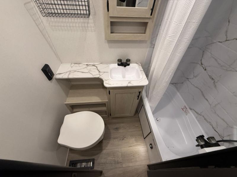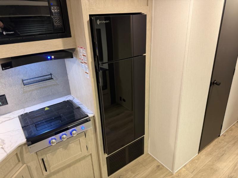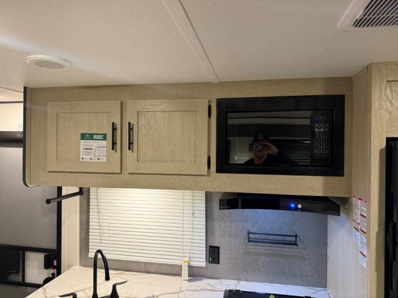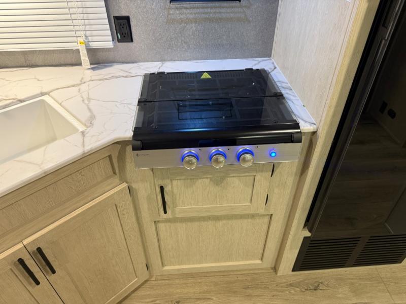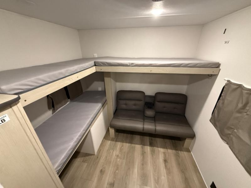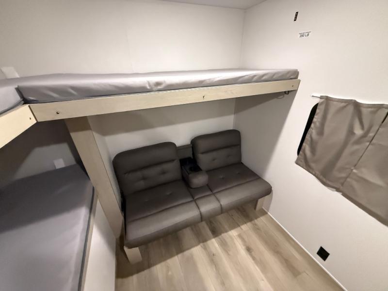 The little ones or your guests will love the bunkhouse in this spacious trailer. There area a set of 26" x 74" bunks, along with a flip-up bunk above a sofa they can sleep and relax. You'll find your own space in the front bedroom that includes a walk-around queen bed and dual wardrobes. Everyone can meet in the middle living area and kitchen to dine at the booth dinette or relax on the sofa. The chef will be able to create delicious meals each day on the three burner cooktop, and there is a residential style refrigerator for perishables. This model also includes a pantry with washer/dryer prep plus an outside kitchen to cook outdoors when the weather is nice