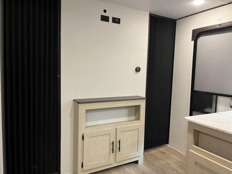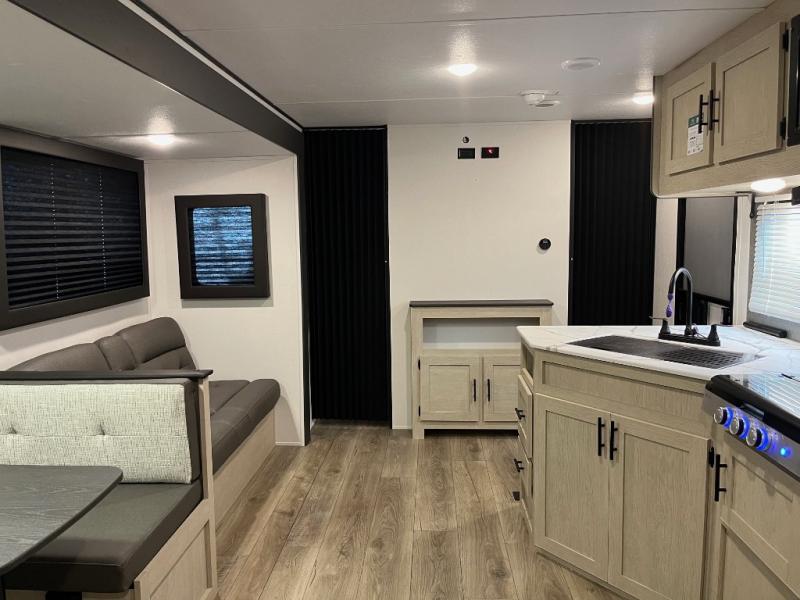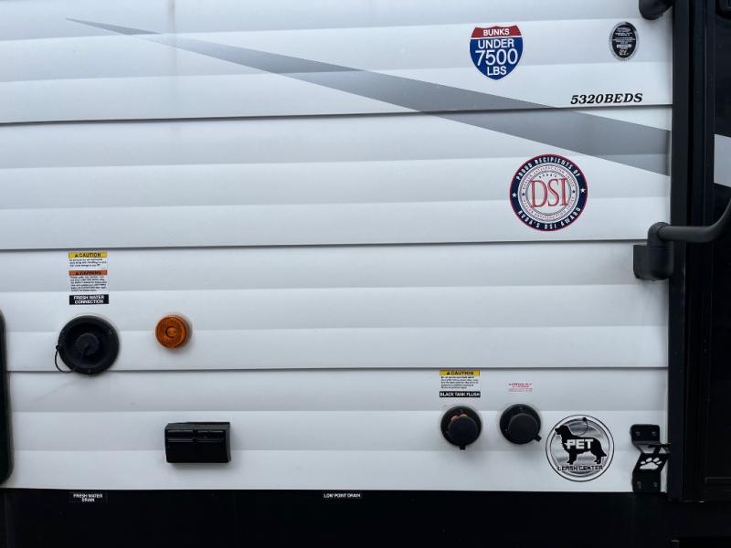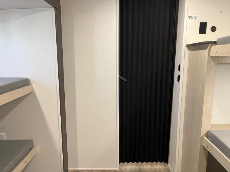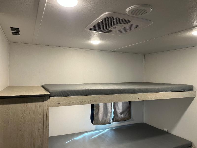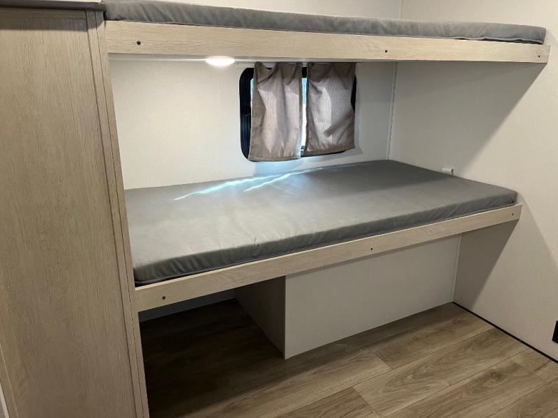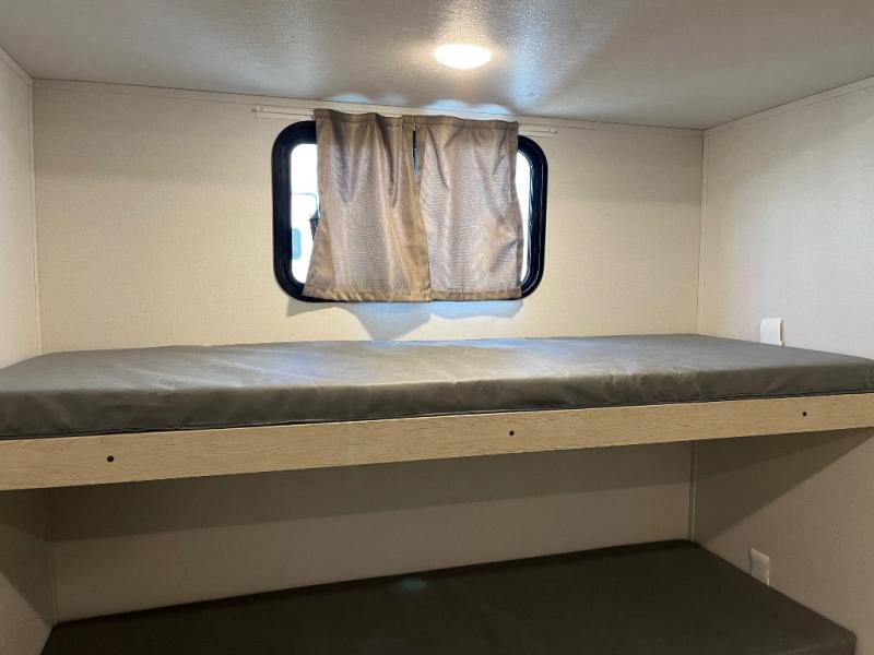 There are a set of 38" x 74" bunks and a set of 26" x 74" bunks in this trailer for lots of sleeping space! This bunkroom also includes a slide out for more space, and you can choose the optional double suite with a 54" x 74" bed if you don't need the bunks. The kitchen is fully equipped for your camping trips featuring a three burner cooktop, an overhead microwave oven, a large sink, and plenty of storage space. You will also love the pantry for all of your canned goods and snacks. The bath features a 24" x 40" shower, toilet, and vanity/sink. In the front of this unit, a private bedroom provides a quiet retreat from the rest of the unit with dual entry doors, and you'll appreciate having dual bedroom wardrobes to keep your clothes organized. Outside, enjoy pass-through storage for all of your outdoor camping gear plus more.