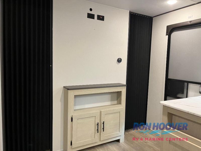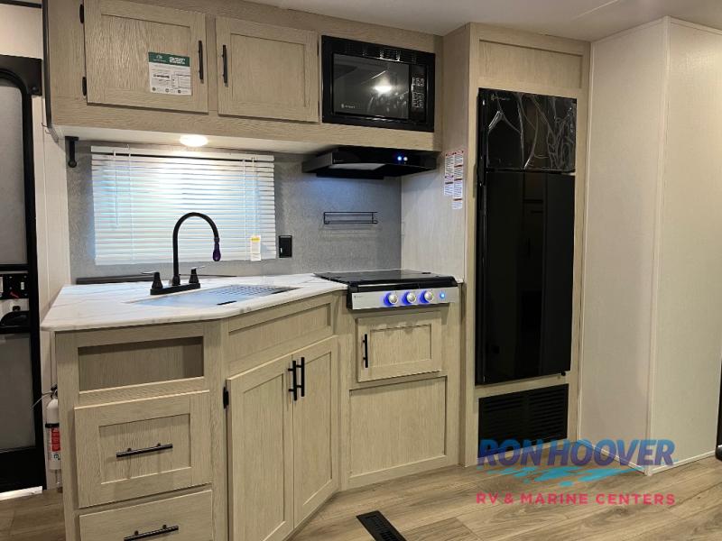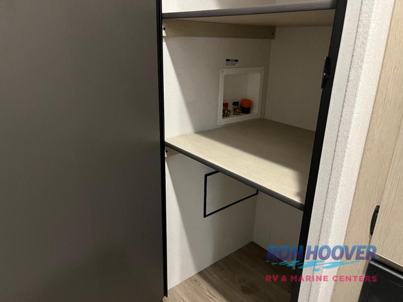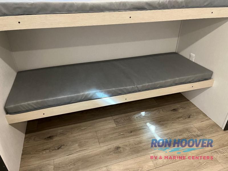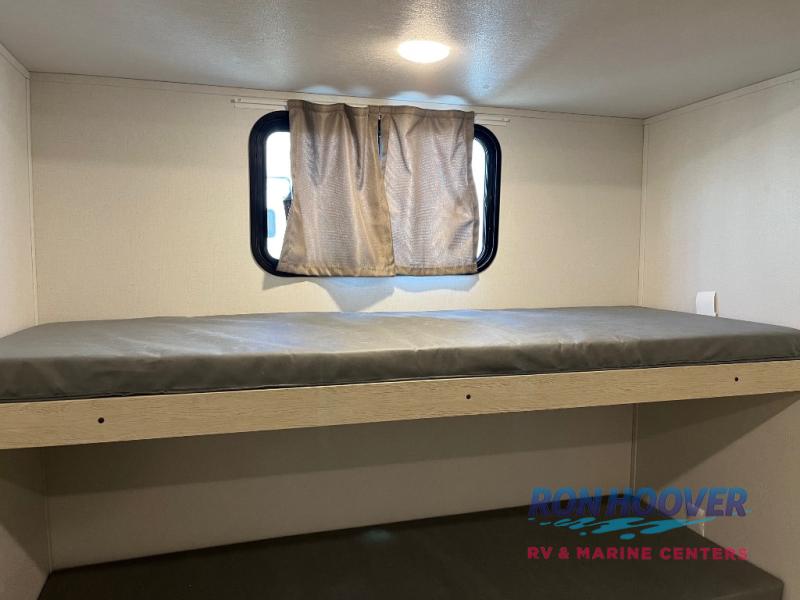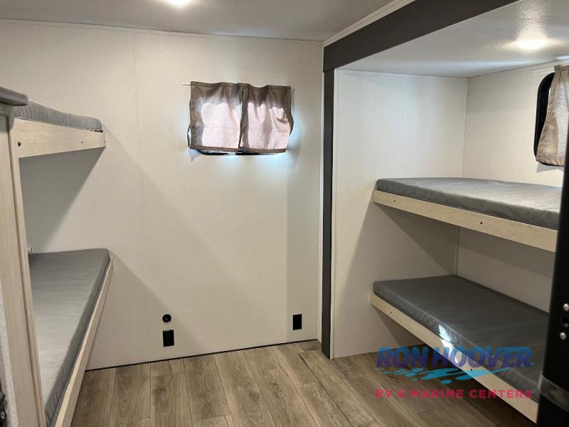 There are a set of 38" x 74" bunks and a set of 26" x 74" bunks in this trailer for lots of sleeping space! This bunkroom also includes a slide out for more space, and you can choose the optional double suite with a 54" x 74" bed if you don't need the bunks. The kitchen is fully equipped for your camping trips featuring a three burner cooktop, an overhead microwave oven, a large sink, and plenty of storage space. You will also love the pantry for all of your canned goods and snacks. The bath features a 24" x 40" shower, toilet, and vanity/sink. In the front of this unit, a private bedroom provides a quiet retreat from the rest of the unit with dual entry doors, and you'll appreciate having dual bedroom wardrobes to keep your clothes organized. Outside, enjoy pass-through storage for all of your outdoor camping gear plus more.