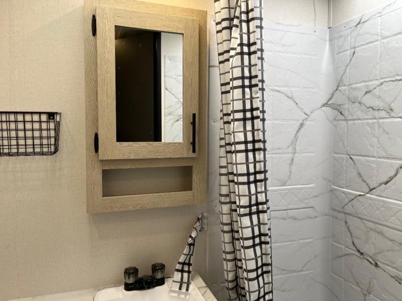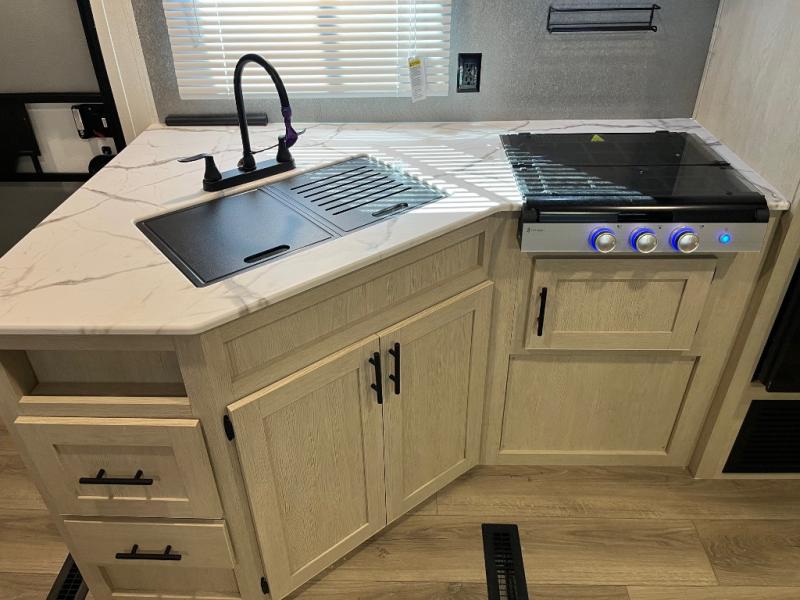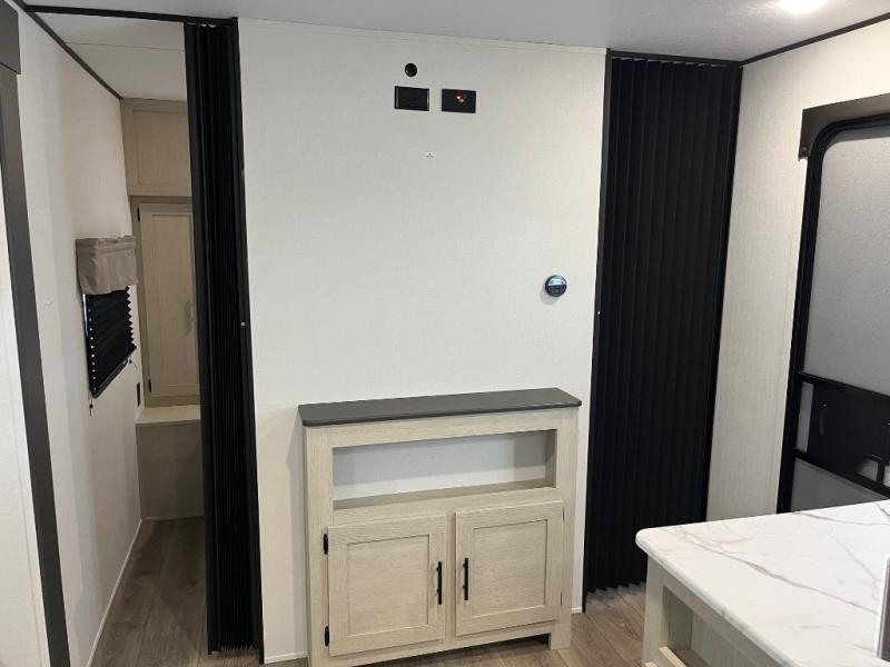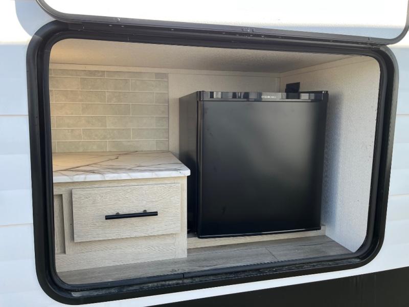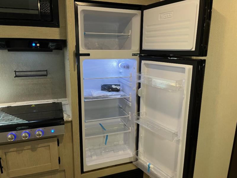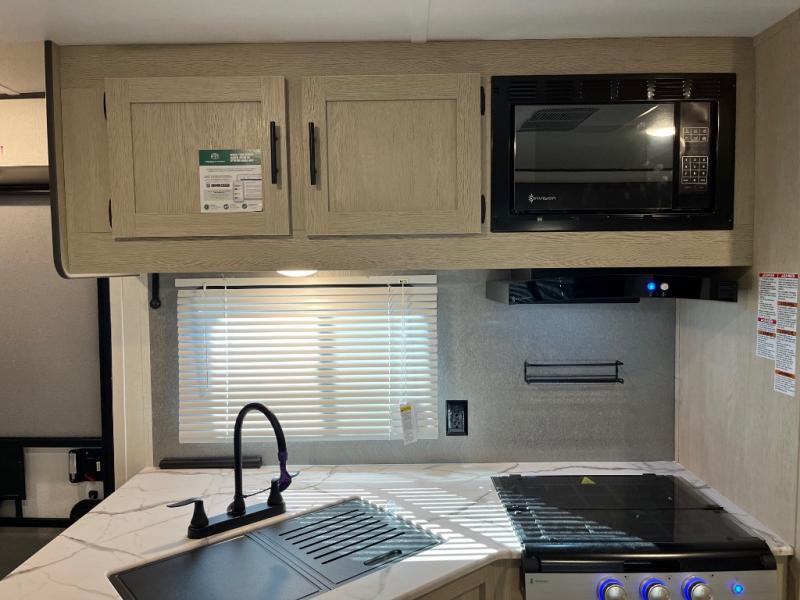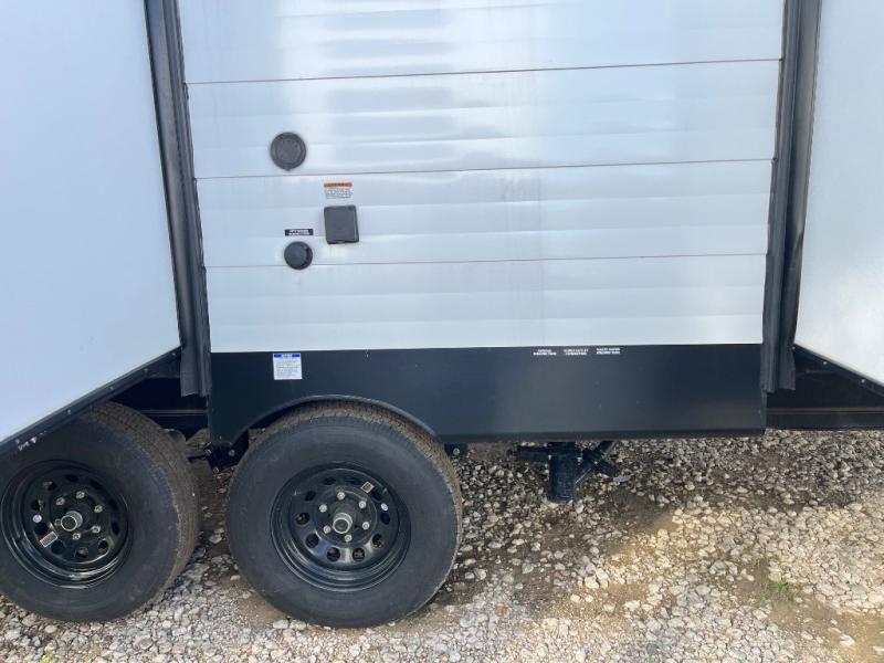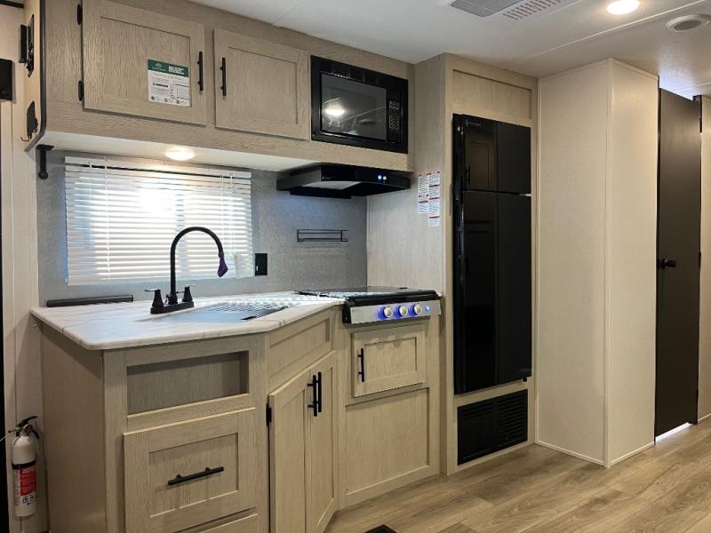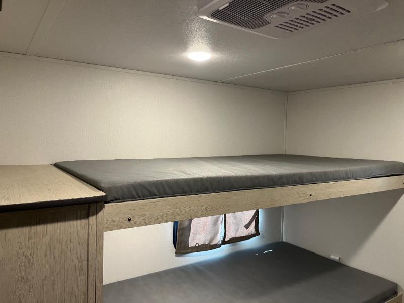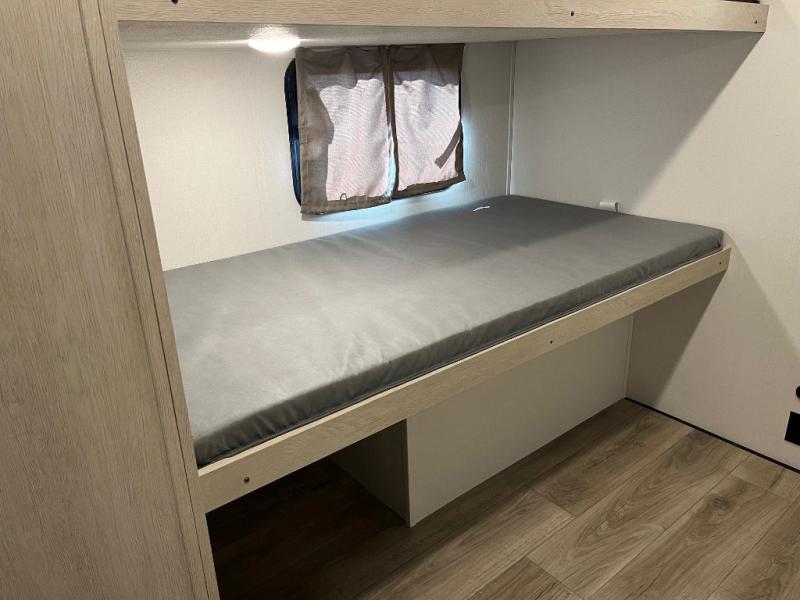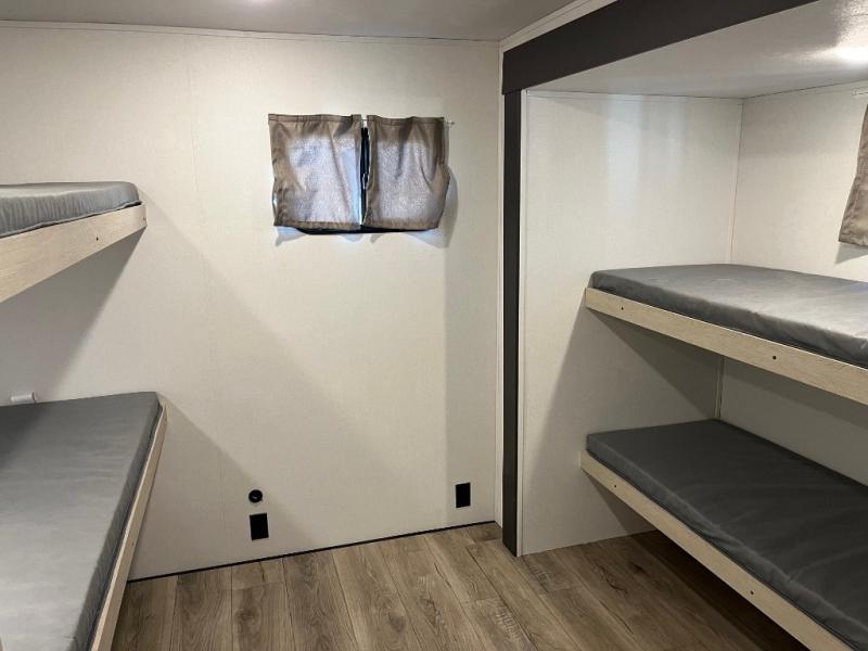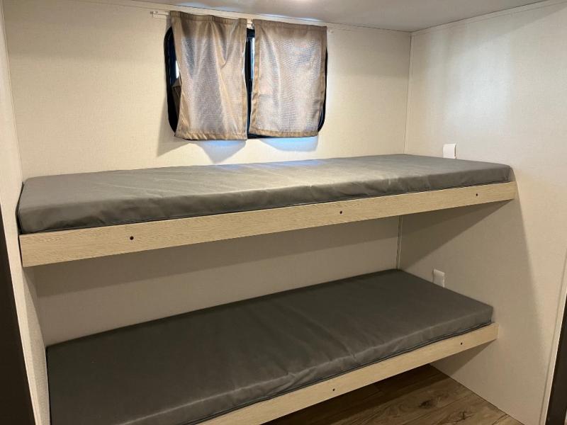 There are a set of 38" x 74" bunks and a set of 26" x 74" bunks in this trailer for lots of sleeping space! This bunkroom also includes a slide out for more space, and you can choose the optional double suite with a 54" x 74" bed if you don't need the bunks. The kitchen is fully equipped for your camping trips featuring a three burner cooktop, an overhead microwave oven, a large sink, and plenty of storage space. You will also love the pantry for all of your canned goods and snacks. The bath features a 24" x 40" shower, toilet, and vanity/sink. In the front of this unit, a private bedroom provides a quiet retreat from the rest of the unit with dual entry doors, and you'll appreciate having dual bedroom wardrobes to keep your clothes organized. Outside, enjoy pass-through storage for all of your outdoor camping gear plus more.