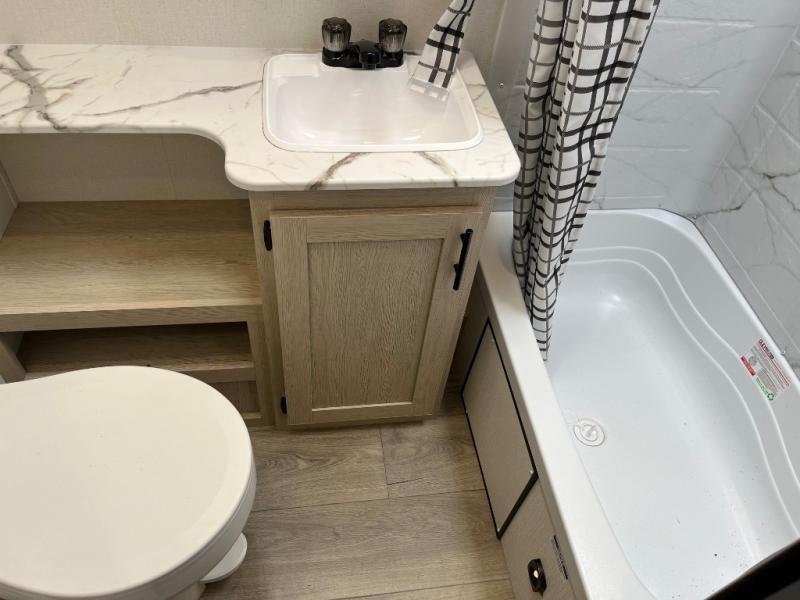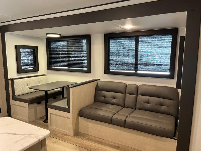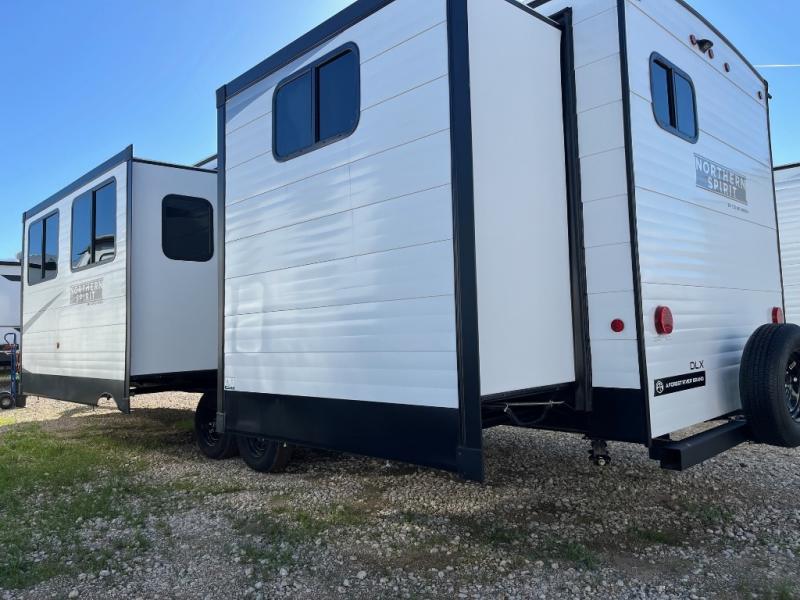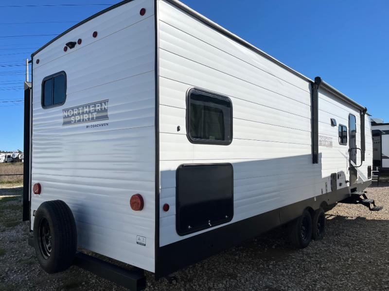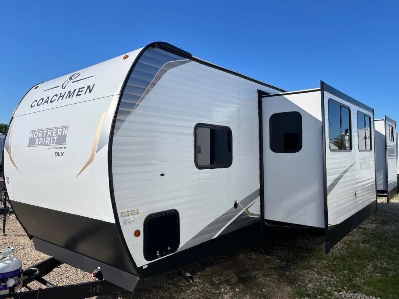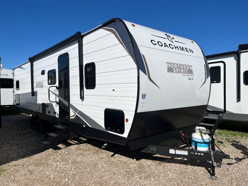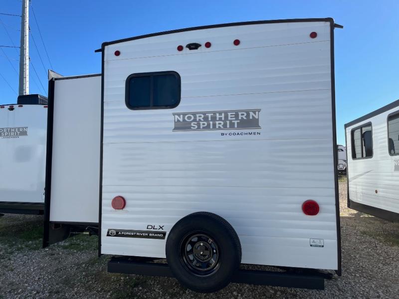In any Northern Spirit DLX travel trailer by Coachmen, you will find quality craftsmanship along with an affordable price tag. These units each feature a straight axle with electric breaks to make setting up easier and an enclosed underbelly for added protection as you travel. The Base Camp Package provides each unit with black tank flush, a monitor panel for quick access to the functions of your unit, a 13.5K A/C unit, and a tankless water heater for added convenience. Inside, you'll find USB charging stations throughout, skylights, LED interior lights and more comforts!