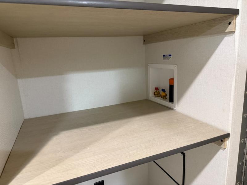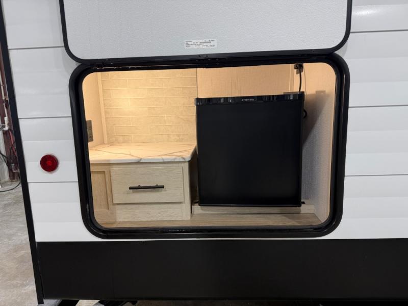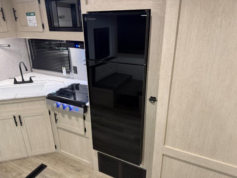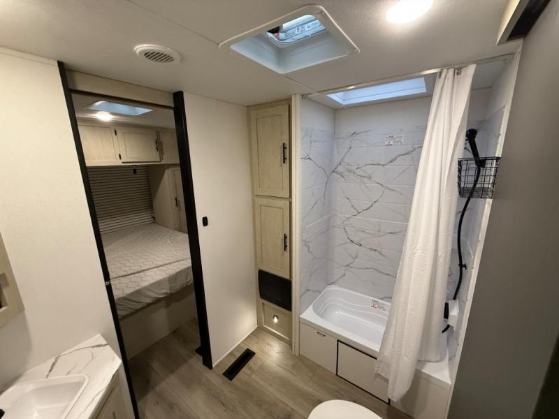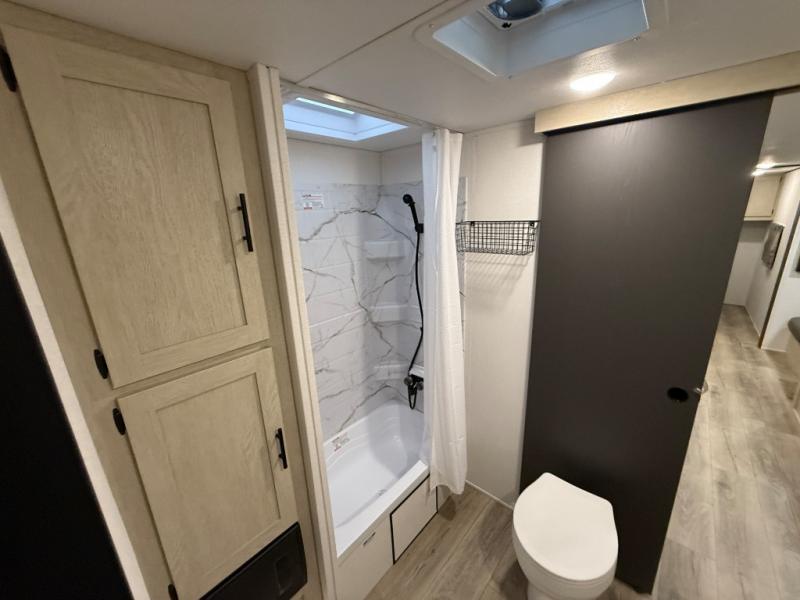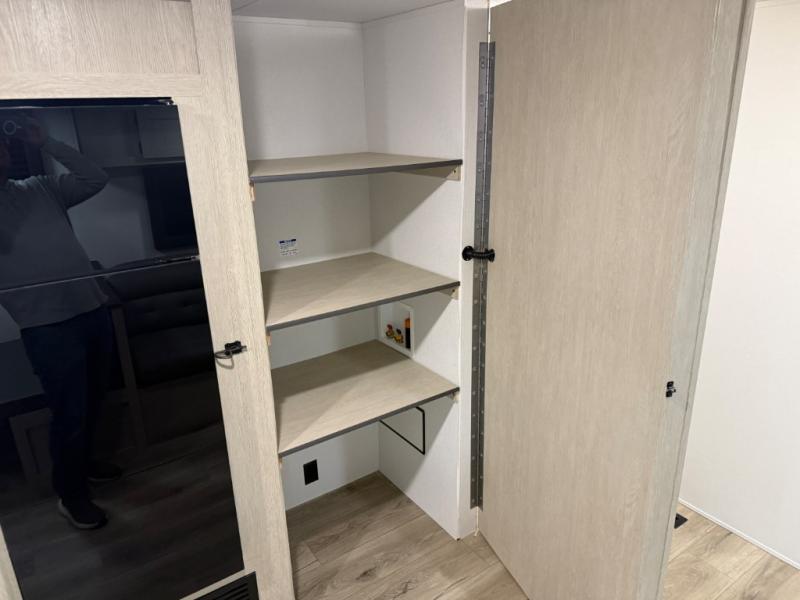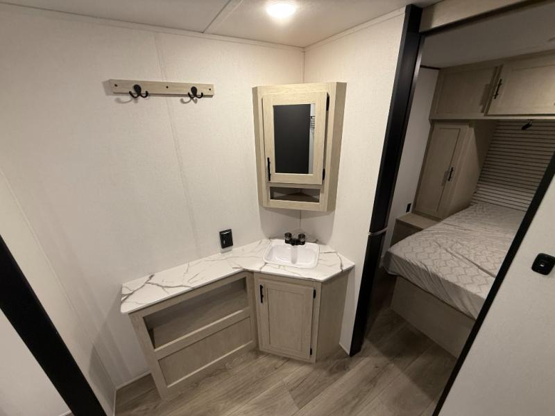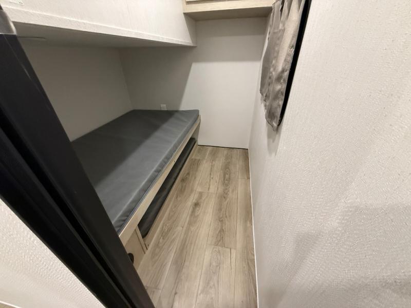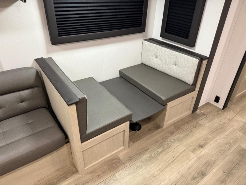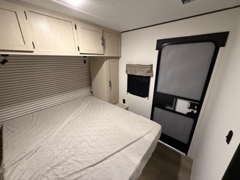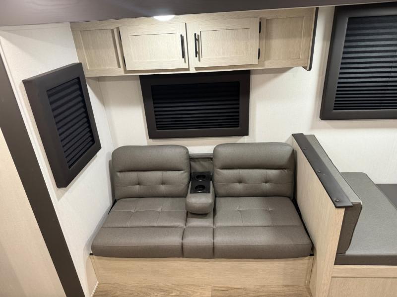 The front bedroom offers a peaceful retreat with a queen bed, perfect for restful nights after a day of adventure. Overhead cabinets provide convenient storage for personal belongings and travel essentials. The walk-through bathroom ensures easy accessibility and flow. Further, in the combined kitchen/living area, a booth dinette creates a cozy space ideal for sharing travel stories and enjoying companionship, and a sofa offers comfortable seating for relaxation and unwinding, adaptable to the rhythms of travel. The kitchen features a hidden pantry, and a refrigerator complemented by a sink that provides essential functionality for meal prep and cleanup. Plus, the rear private bunk beds deliver additional cozy sleeping quarters, perfect for families or travelers seeking flexible accommodation options.