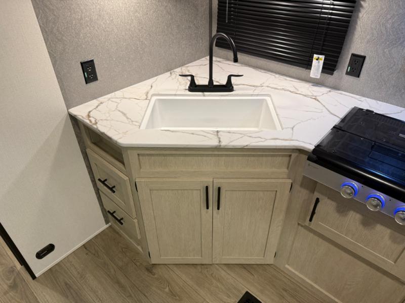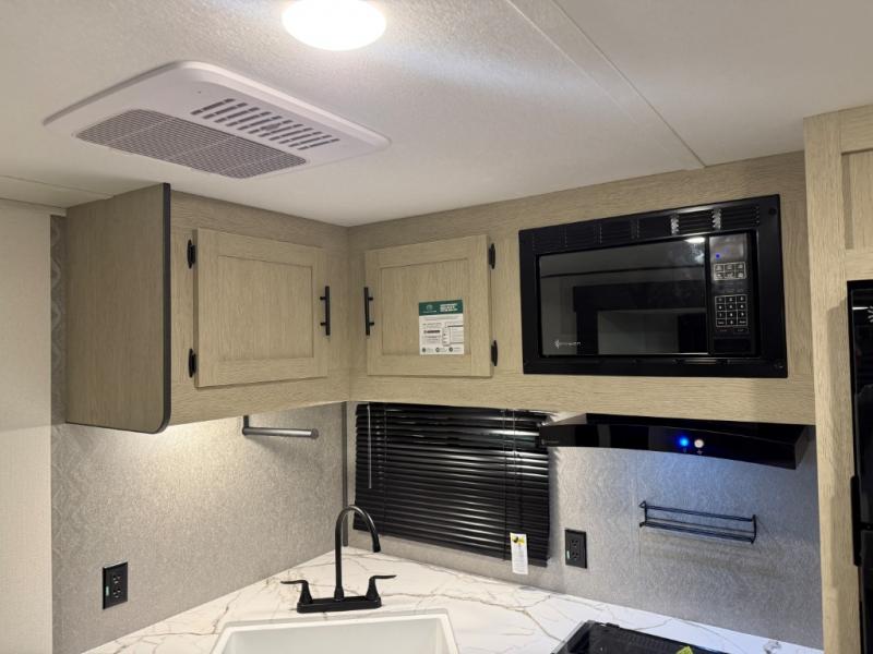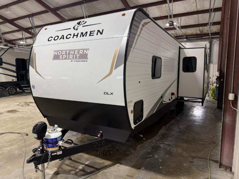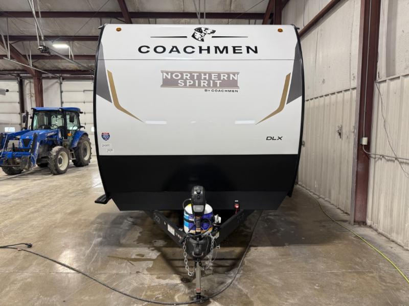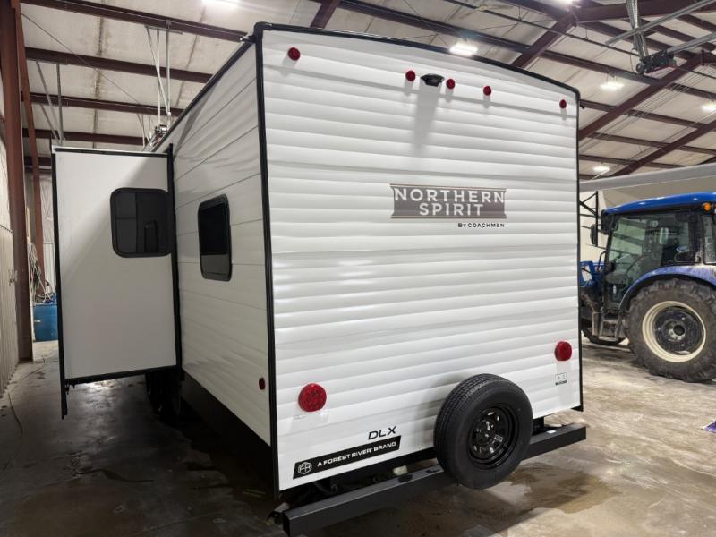 In any Northern Spirit DLX travel trailer by Coachmen, you will find quality craftsmanship along with an affordable price tag. These units each feature a straight axle with electric breaks to make setting up easier and an enclosed underbelly for added protection as you travel. The Base Camp Package provides each unit with black tank flush, a monitor panel for quick access to the functions of your unit, a 13.5K A/C unit, and a tankless water heater for added convenience. Inside, you'll find USB charging stations throughout, skylights, LED interior lights and more comforts!