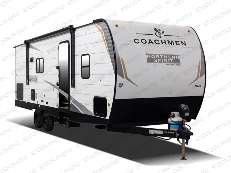 In any Northern Spirit DLX travel trailer by Coachmen, you will find quality craftsmanship along with an affordable price tag. These units each feature a straight axle with electric breaks to make setting up easier and an enclosed underbelly for added protection as you travel. The Base Camp Package provides each unit with black tank flush, a monitor panel for quick access to the functions of your unit, a 13.5K A/C unit, and a tankless water heater for added convenience. Inside, you'll find USB charging stations throughout, skylights, LED interior lights and more comforts!