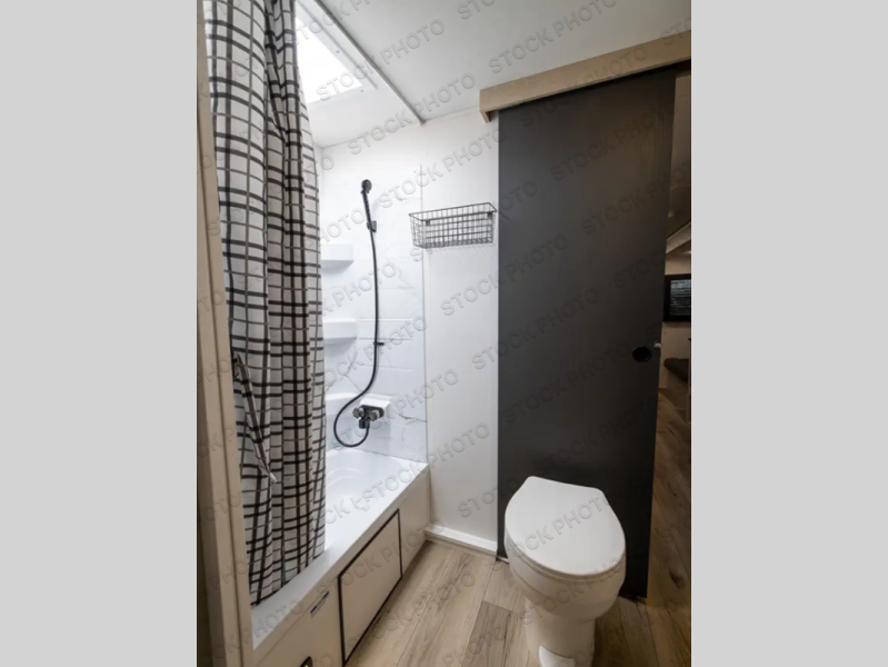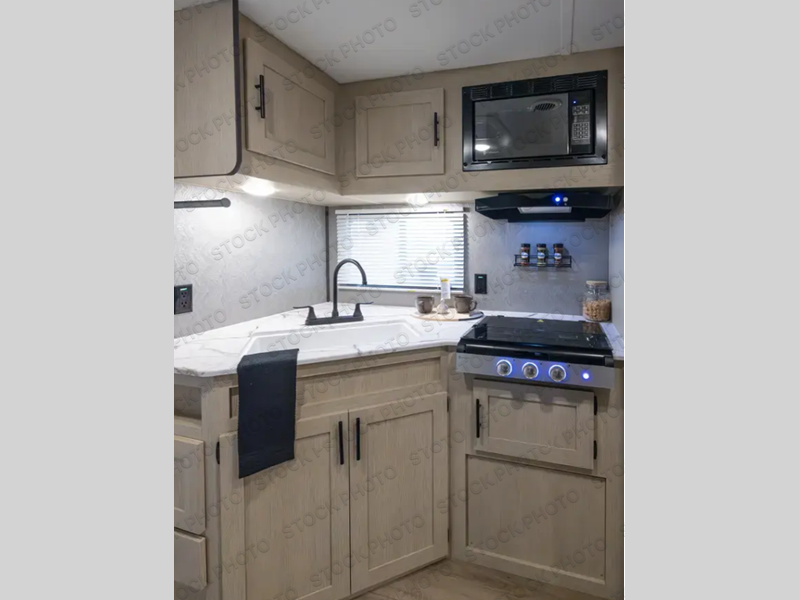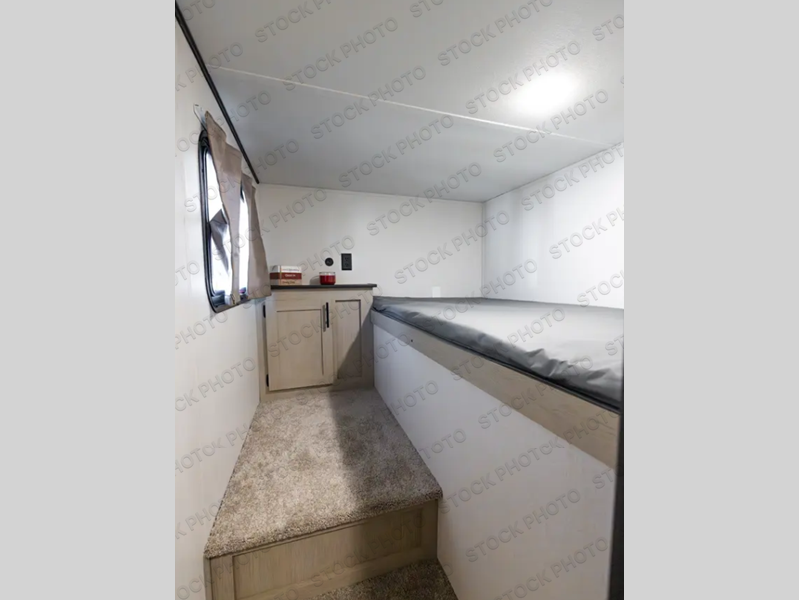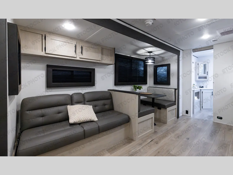 The front bedroom offers a peaceful retreat with a queen bed, perfect for restful nights after a day of adventure. Overhead cabinets provide convenient storage for personal belongings and travel essentials. The walk-through bathroom ensures easy accessibility and flow. Further, in the combined kitchen/living area, a booth dinette creates a cozy space ideal for sharing travel stories and enjoying companionship, and a sofa offers comfortable seating for relaxation and unwinding, adaptable to the rhythms of travel. The kitchen features a hidden pantry, and a refrigerator complemented by a sink that provides essential functionality for meal prep and cleanup. Plus, the rear private bunk beds deliver additional cozy sleeping quarters, perfect for families or travelers seeking flexible accommodation options.
