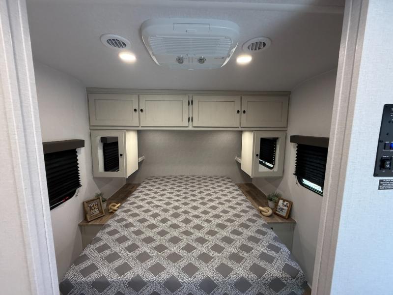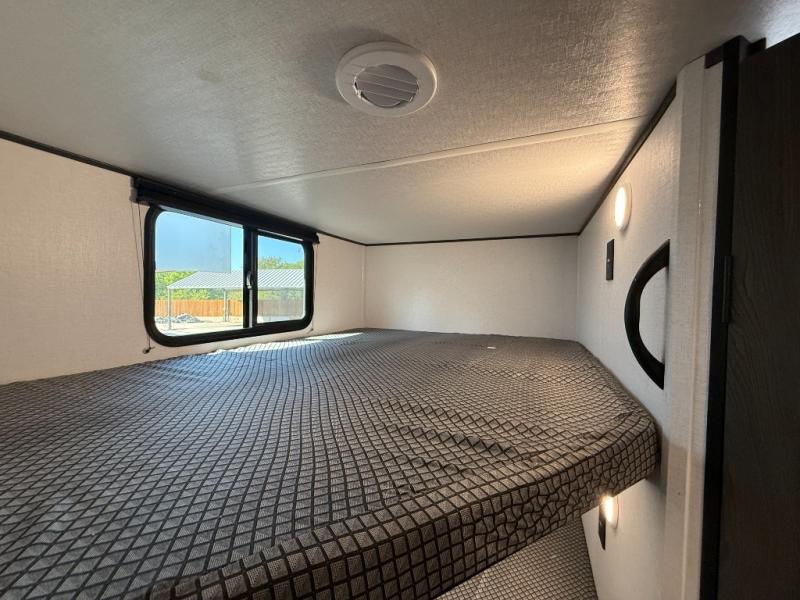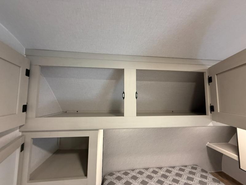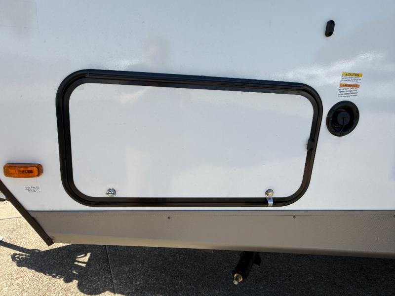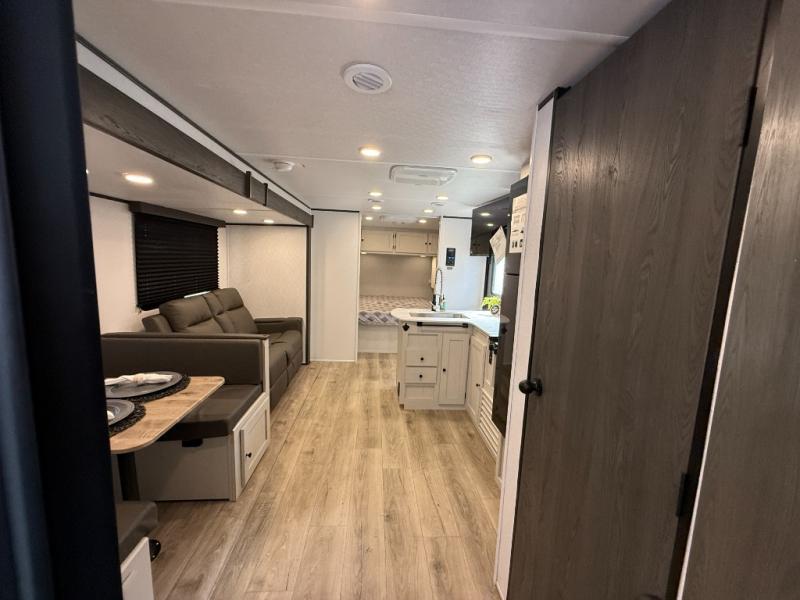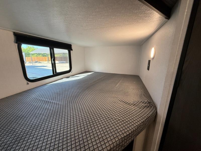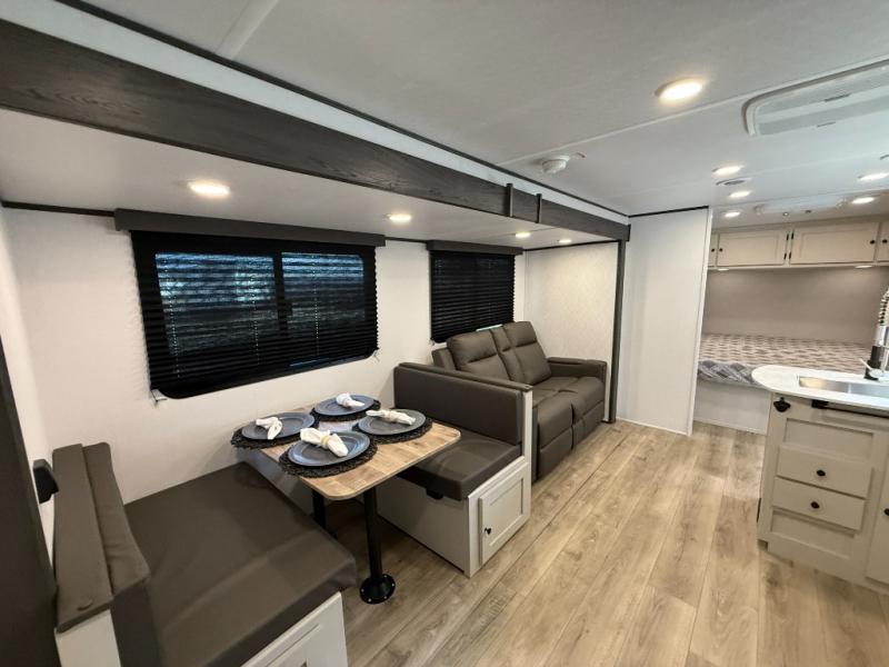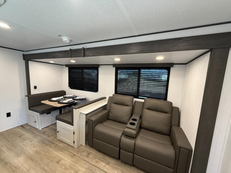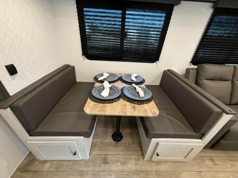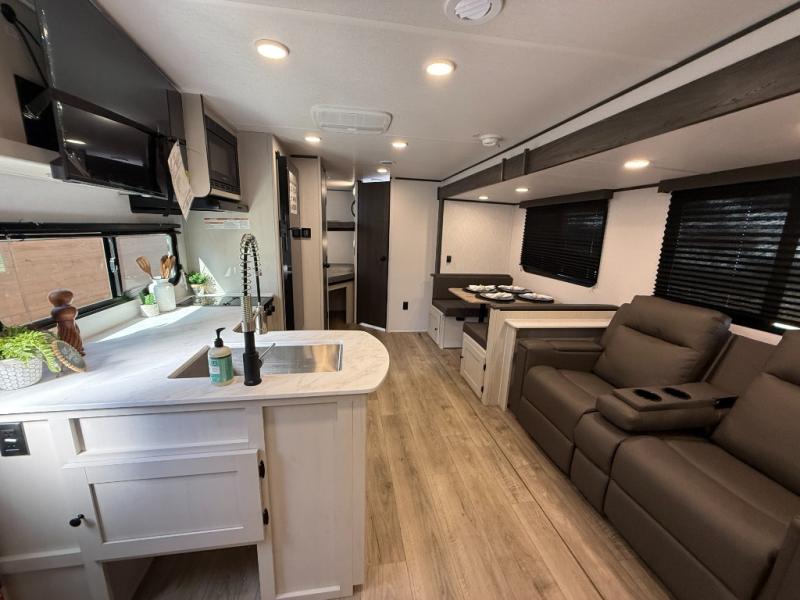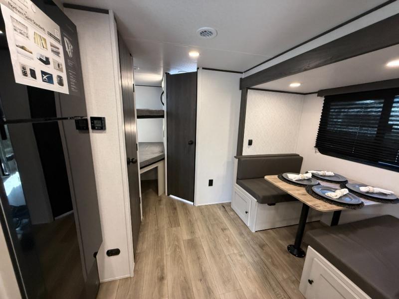 Camping trips are made complete in this spacious travel trailer! You can wake up feeling refreshed each morning in the front private bedroom that includes a queen bed and underbed storage, and there is a full bath towards the back to get ready for your day. The double-size bunks are sure to be a hit with the little ones or your guests, and the large pantry beside the bunks include washer/dryer hookups if you want to add these appliances. An L-shaped counter in the kitchen will provide more space as you prep breakfast on the two burner cooktop, and there is a 12V refrigerator to keep the eggs and milk cold. Your crew can dine at the booth dinette, relax on the sofa with a theater seating option, or take your plates outdoors under the 20' power awning!