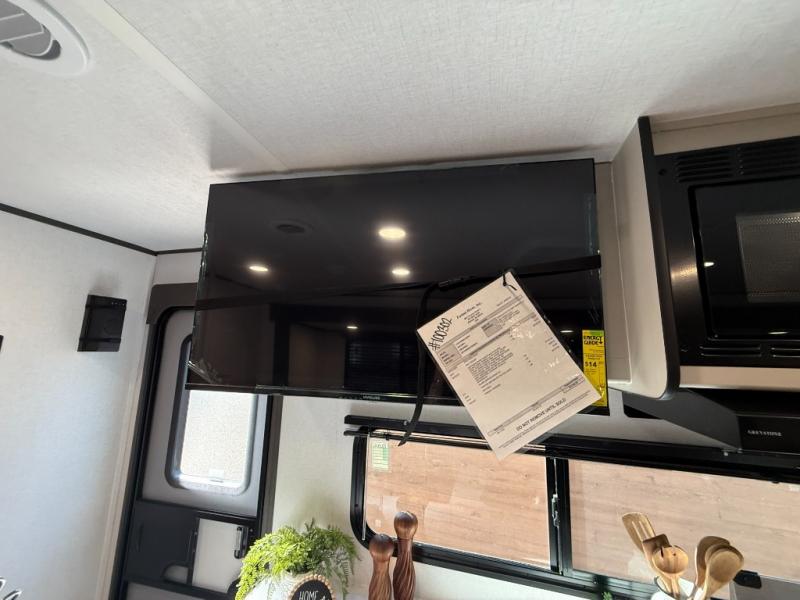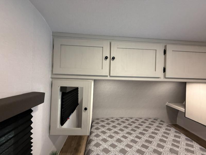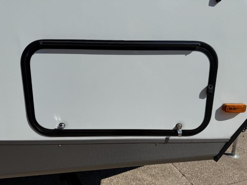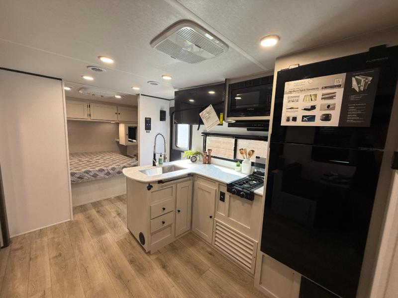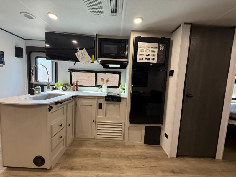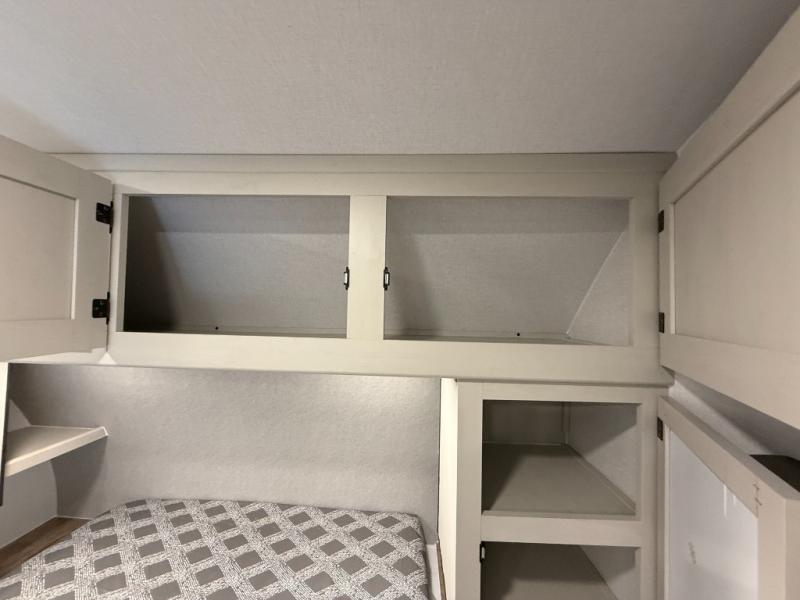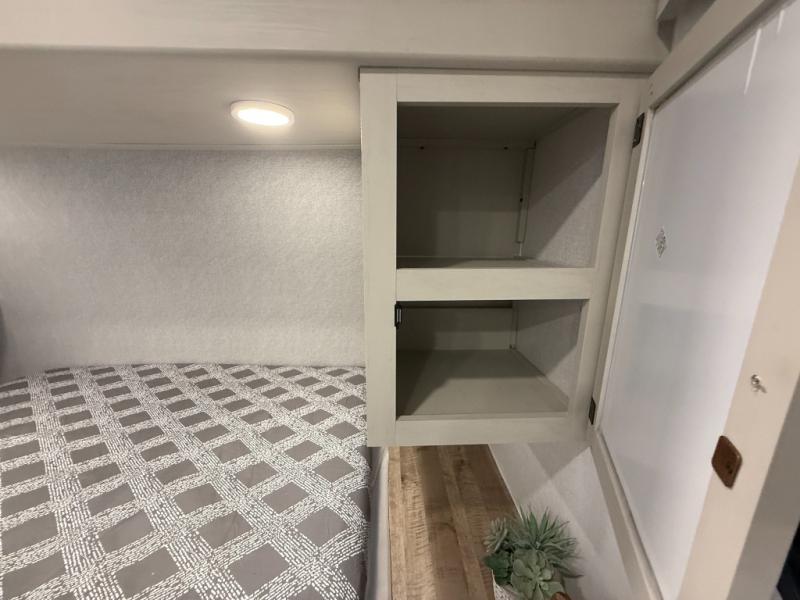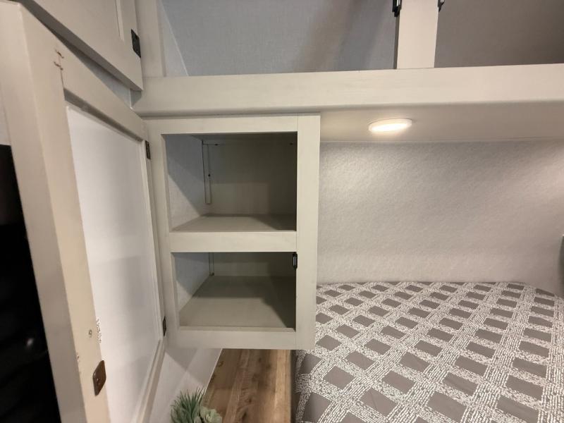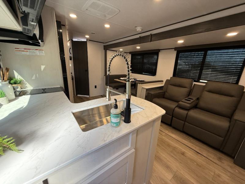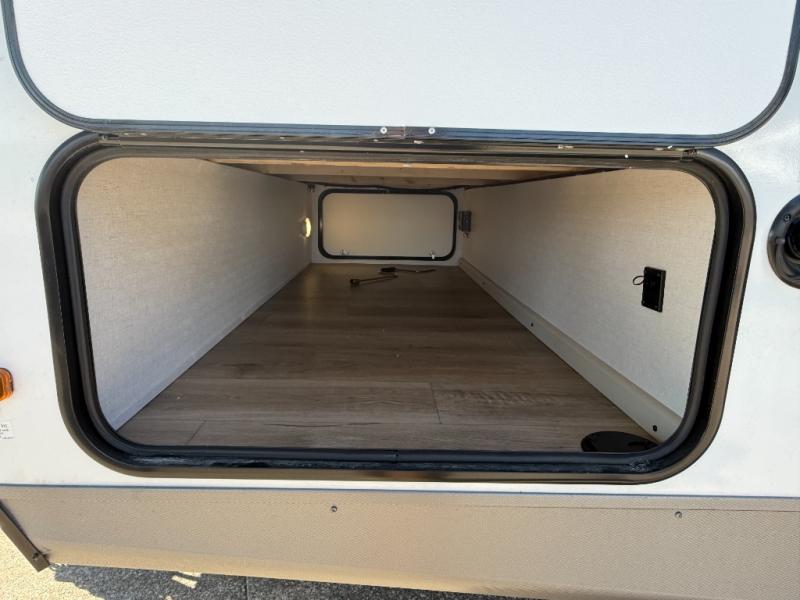 Camping trips are made complete in this spacious travel trailer! You can wake up feeling refreshed each morning in the front private bedroom that includes a queen bed and underbed storage, and there is a full bath towards the back to get ready for your day. The double-size bunks are sure to be a hit with the little ones or your guests, and the large pantry beside the bunks include washer/dryer hookups if you want to add these appliances. An L-shaped counter in the kitchen will provide more space as you prep breakfast on the two burner cooktop, and there is a 12V refrigerator to keep the eggs and milk cold. Your crew can dine at the booth dinette, relax on the sofa with a theater seating option, or take your plates outdoors under the 20' power awning!