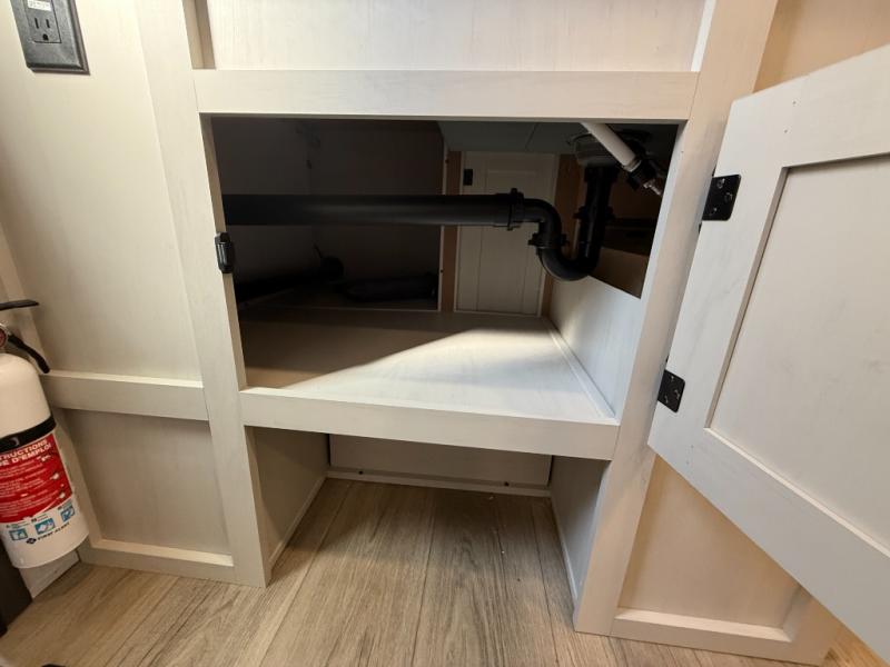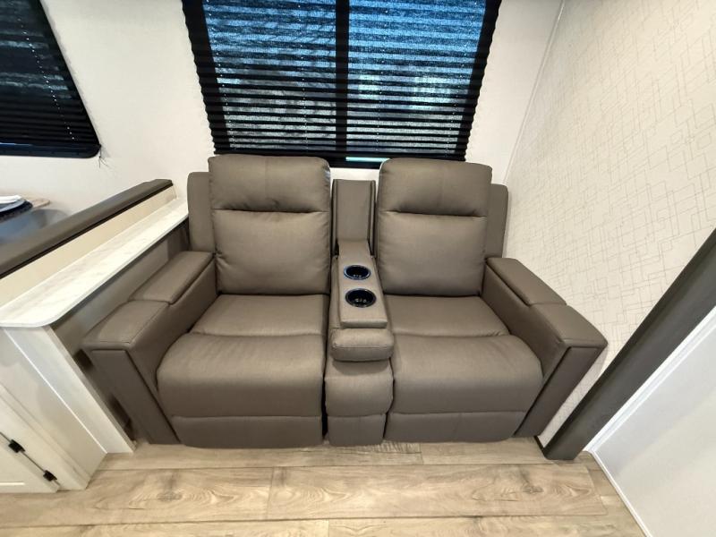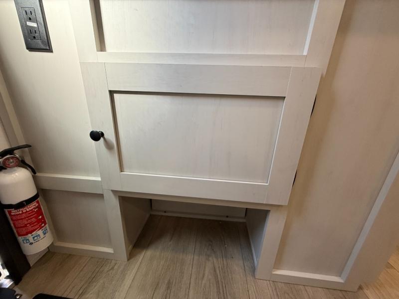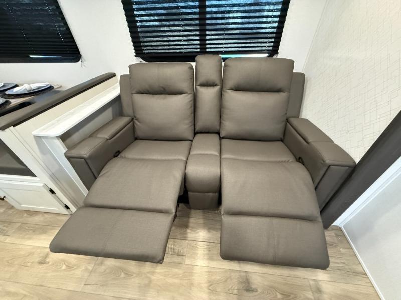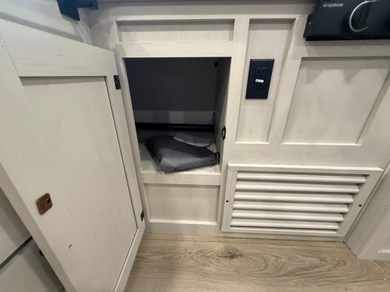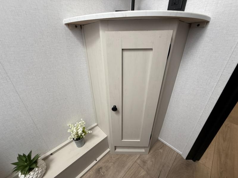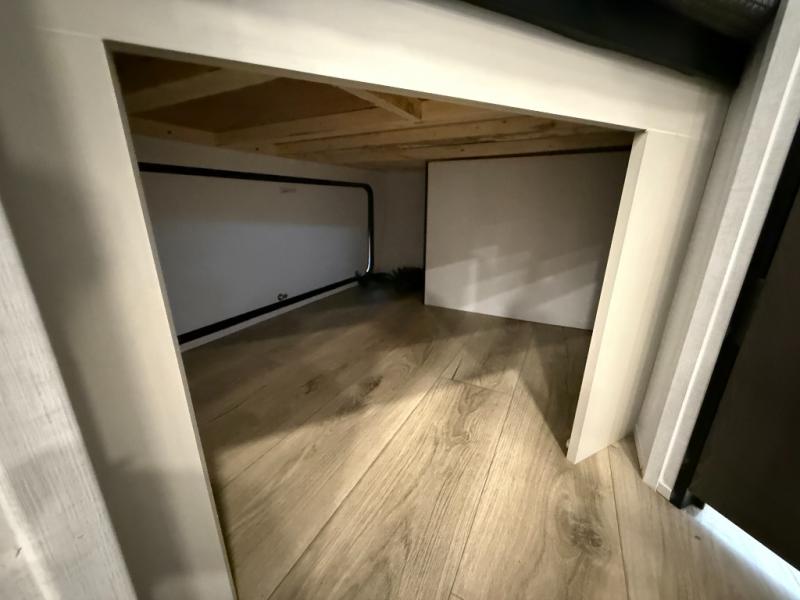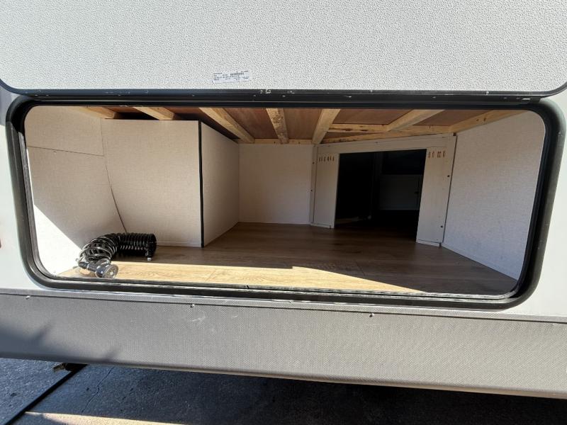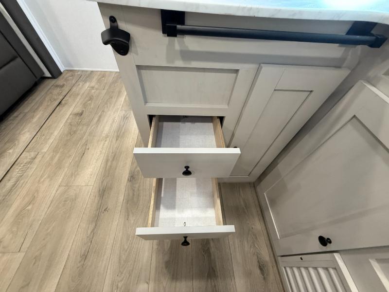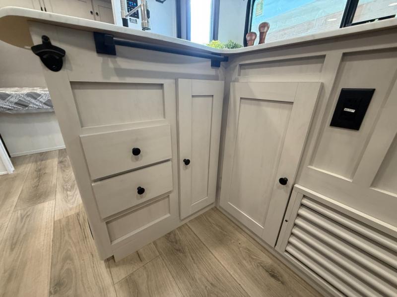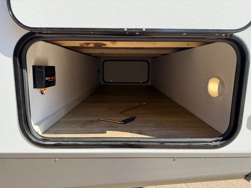 Camping trips are made complete in this spacious travel trailer! You can wake up feeling refreshed each morning in the front private bedroom that includes a queen bed and underbed storage, and there is a full bath towards the back to get ready for your day. The double-size bunks are sure to be a hit with the little ones or your guests, and the large pantry beside the bunks include washer/dryer hookups if you want to add these appliances. An L-shaped counter in the kitchen will provide more space as you prep breakfast on the two burner cooktop, and there is a 12V refrigerator to keep the eggs and milk cold. Your crew can dine at the booth dinette, relax on the sofa with a theater seating option, or take your plates outdoors under the 20' power awning!