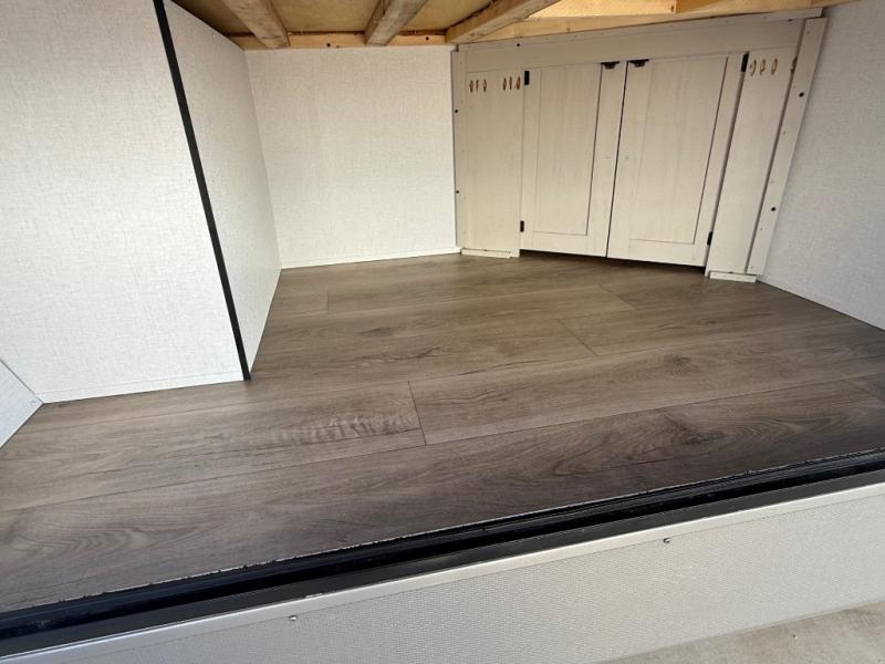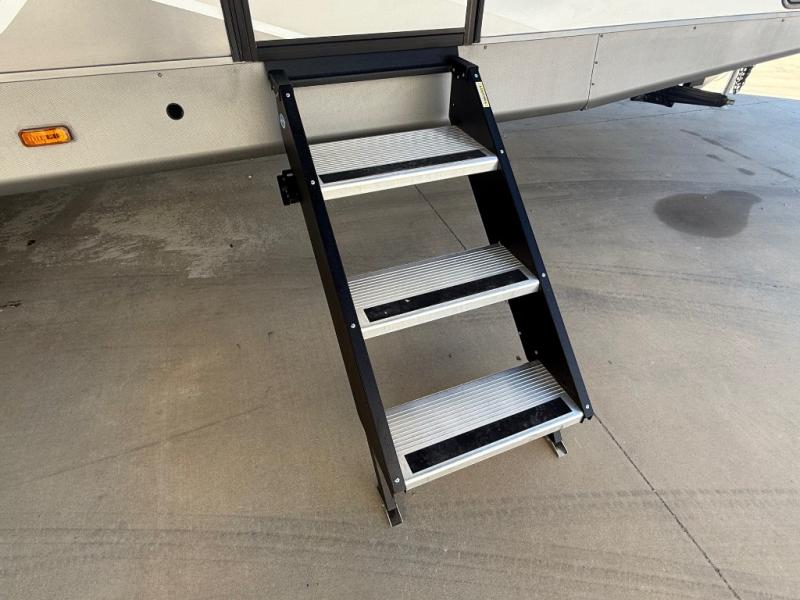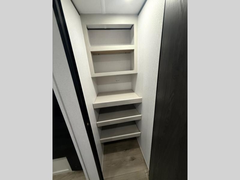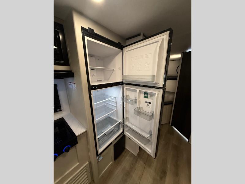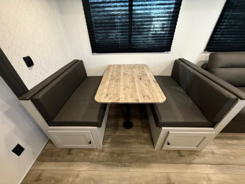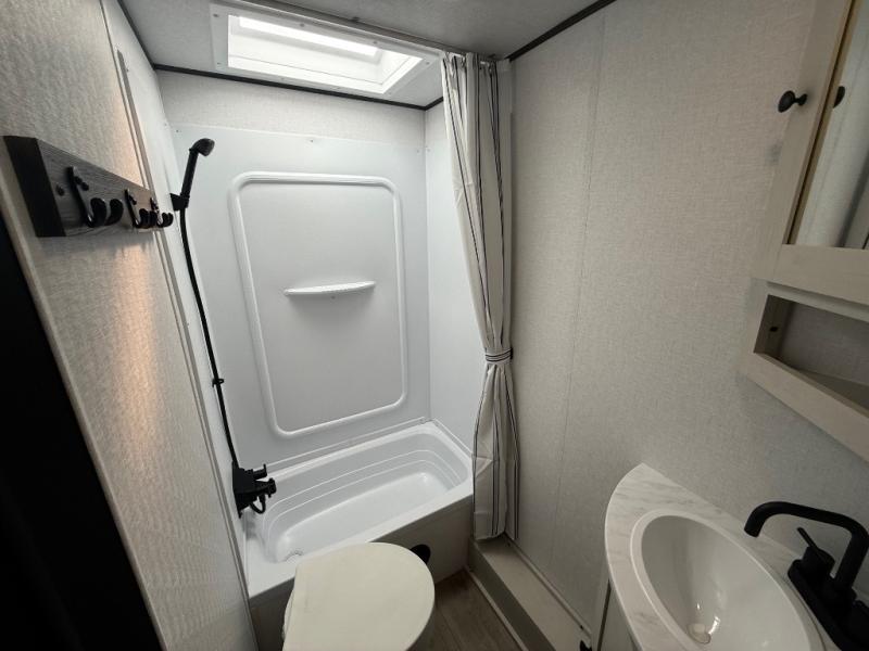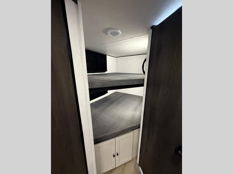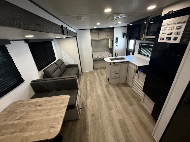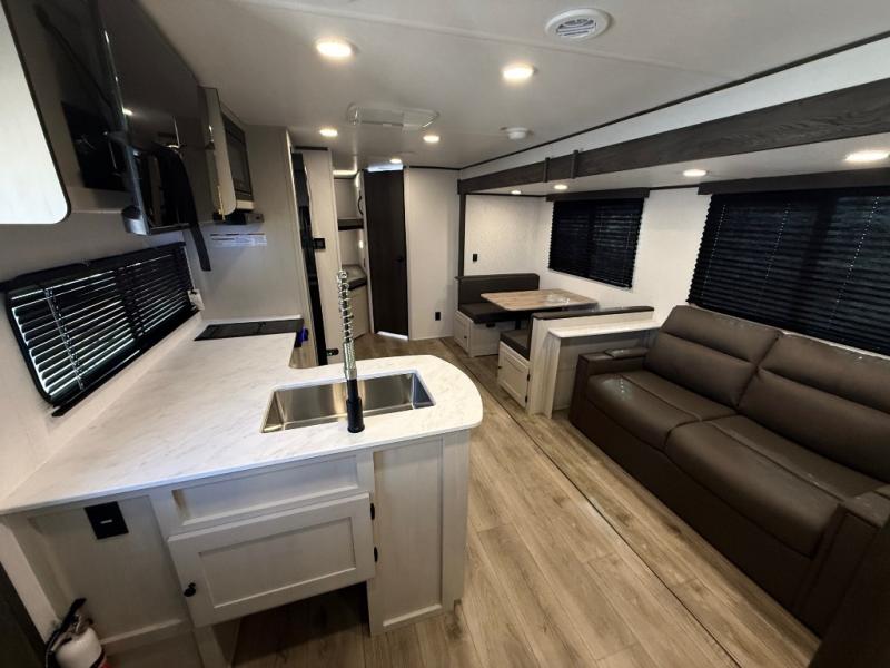 Camping trips are made complete in this spacious travel trailer! You can wake up feeling refreshed each morning in the front private bedroom that includes a queen bed and underbed storage, and there is a full bath towards the back to get ready for your day. The double-size bunks are sure to be a hit with the little ones or your guests, and the large pantry beside the bunks include washer/dryer hookups if you want to add these appliances. An L-shaped counter in the kitchen will provide more space as you prep breakfast on the two burner cooktop, and there is a 12V refrigerator to keep the eggs and milk cold. Your crew can dine at the booth dinette, relax on the sofa with a theater seating option, or take your plates outdoors under the 20' power awning!