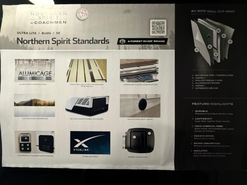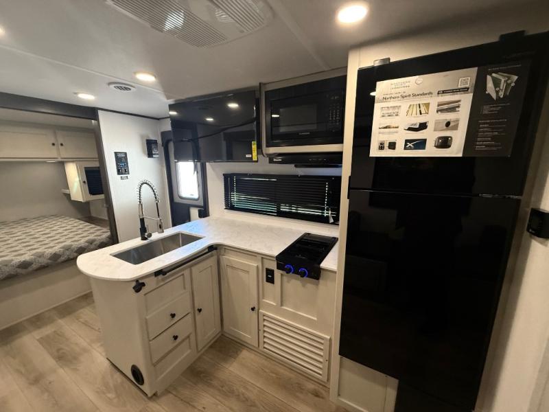 With any Northern Spirit SE travel trailer by Coachmen RV, you will enjoy affordable luxury at every turn! The durable construction includes dual Azdel sidewalls and rear wall, a Darco subfloor protective wrap/enclosure, plus a fully walkable roof with seamless Tufflex PVC covering. Each travel trailer includes Congoleum linoleum flooring, seamless Thermofoil countertops throughout, USB ports throughout to keep your gadgets charged, and night shades for added protection and privacy. And the on-demand tankless water heater, Twice Cool dual ducted A/C system, and 25,000 BTU ducted furnace will ensure your comfort wherever you decide to roam!