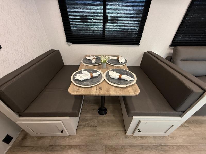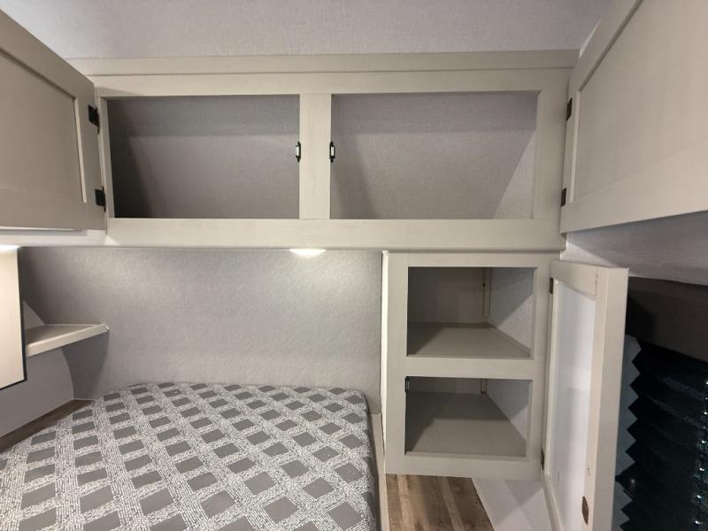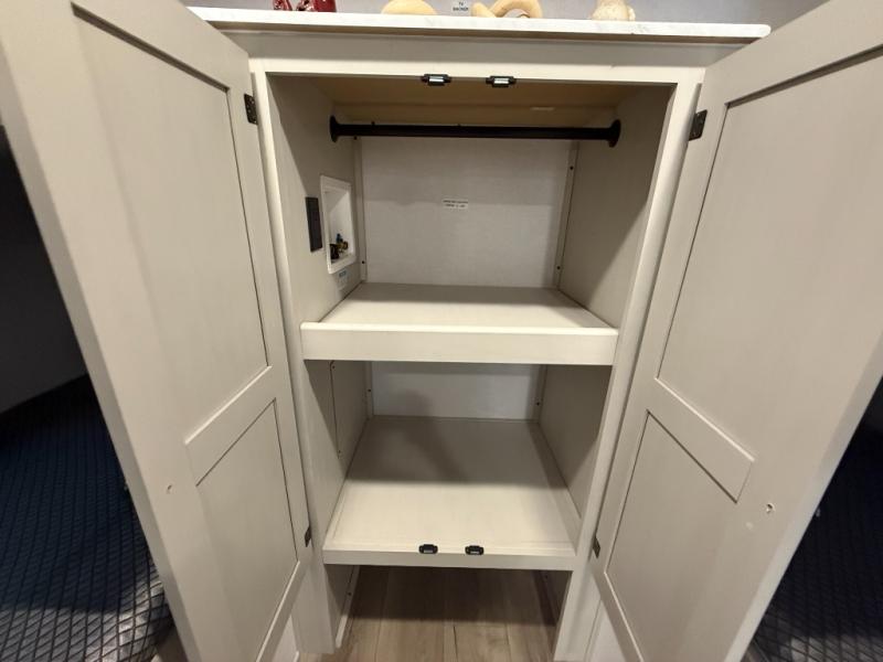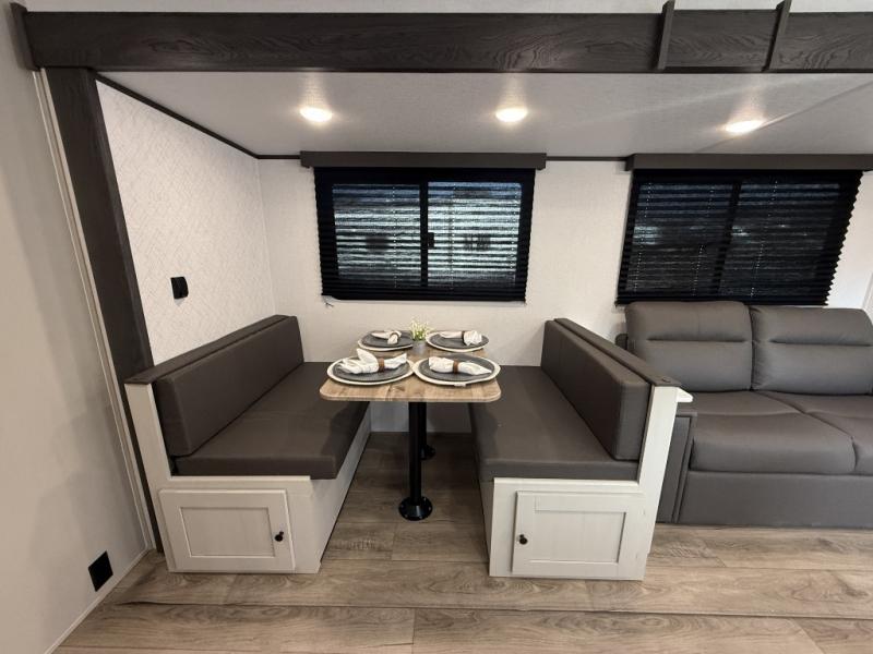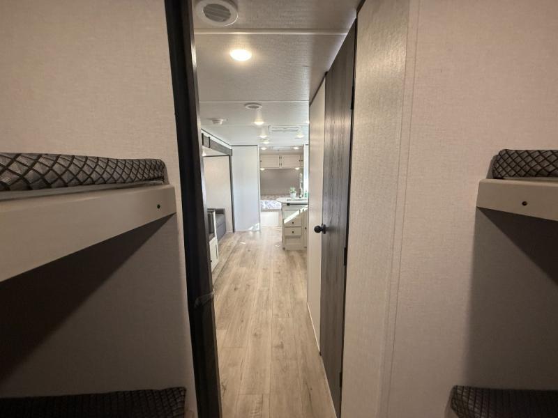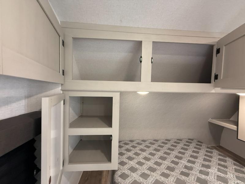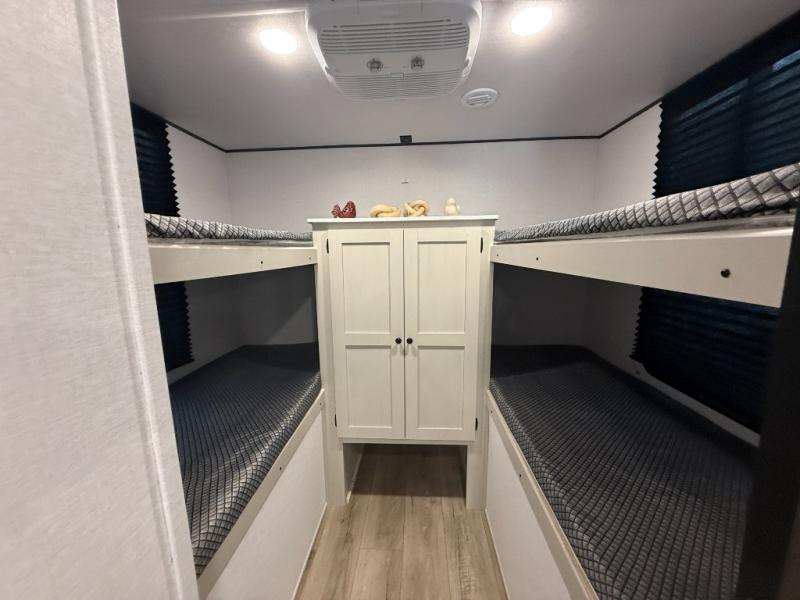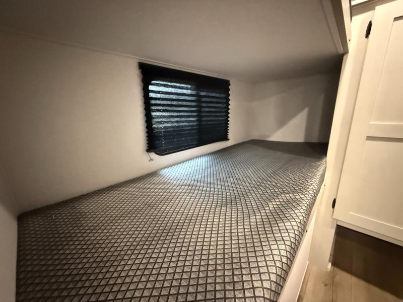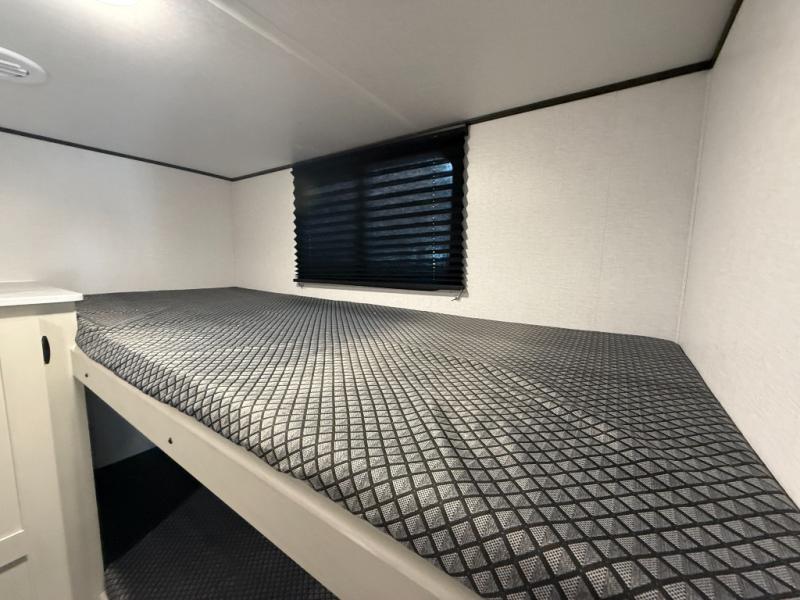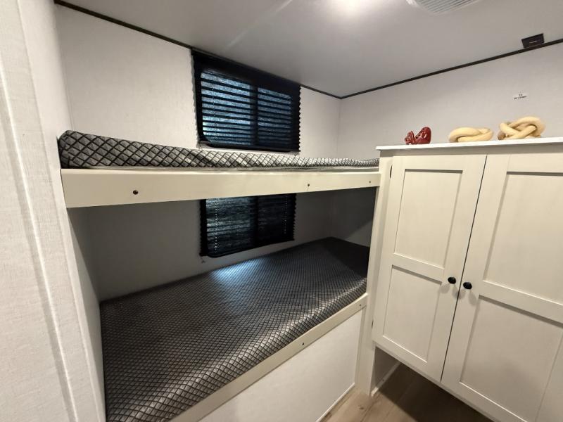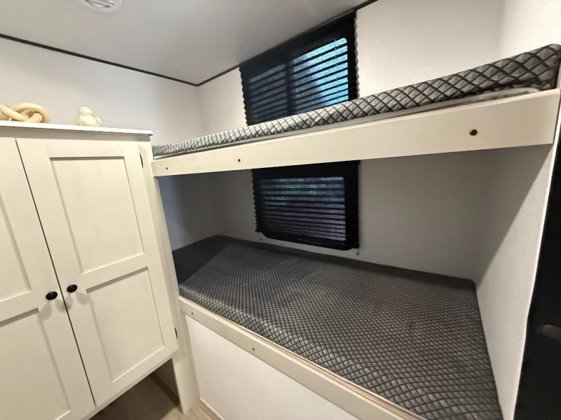 If you enjoy camping with a larger group, this travel trailer will be the perfect fit! There are quad bunks in the rear bunkhouse plus washer and dryer prep if you choose to add these appliances. You'll enjoy your own space up front in the private bedroom, which features a walk-around queen bed, dual bedside wardrobes and nightstands, plus underbed storage for extra blankets! Everyone can meet in the combined kitchen and living area while the chef makes breakfast on the two burner cooktop. There is also a microwave here, plus a 12V refrigerator and large pantry for food storage. Your crew can dine at the booth dinette, relax on the sofa with a theater seating option, or head outdoors to sit under the 16' power awning!