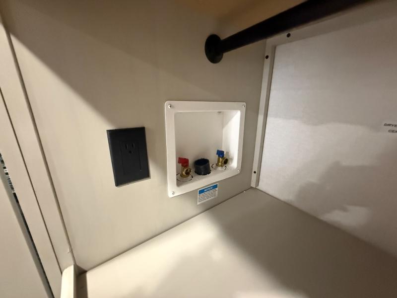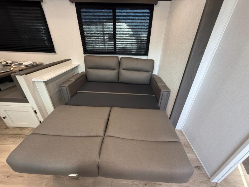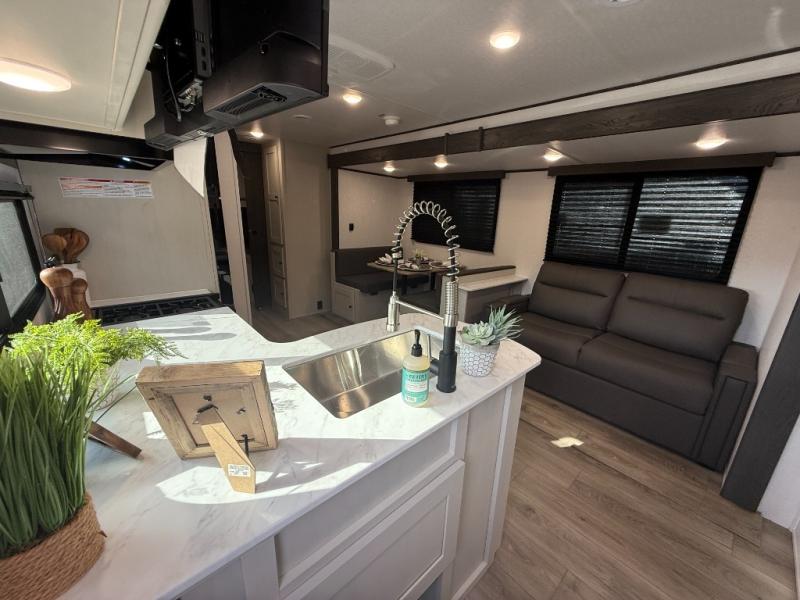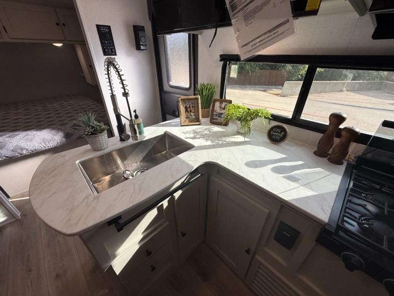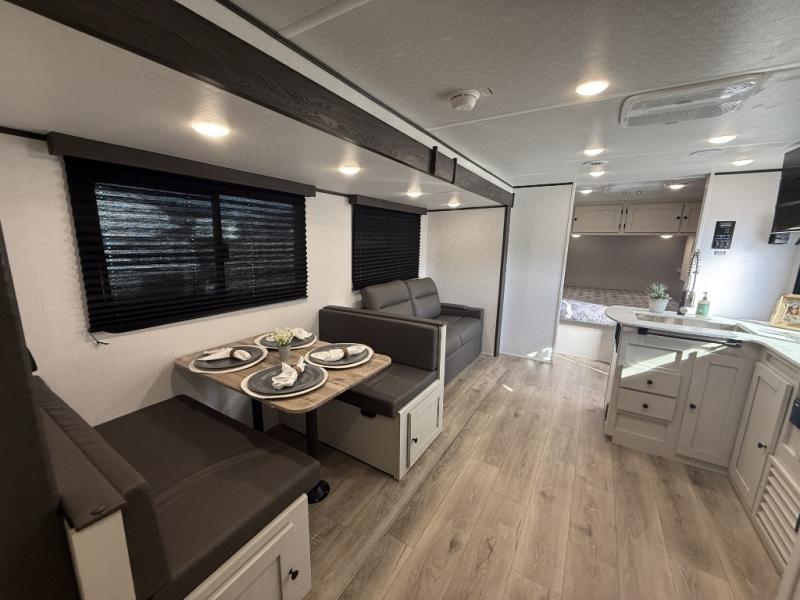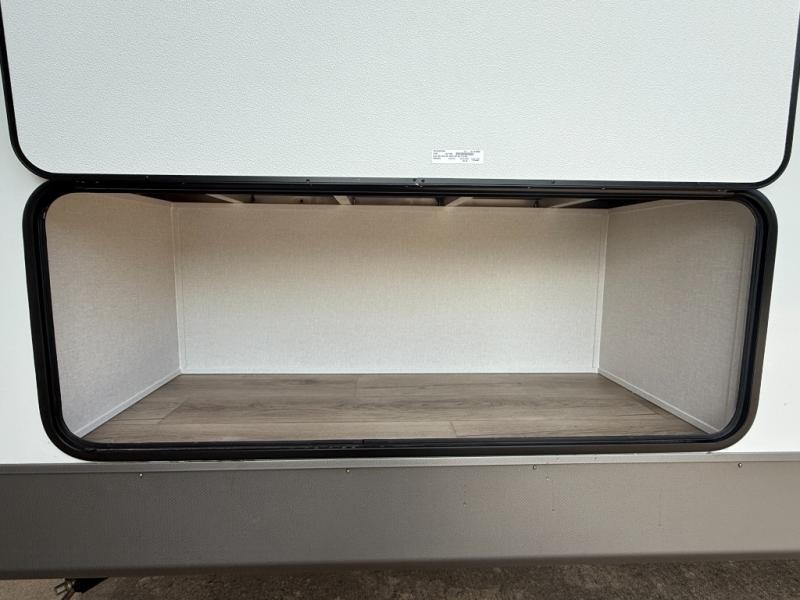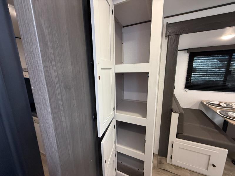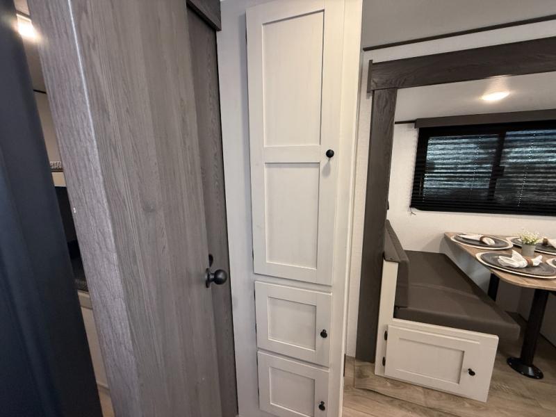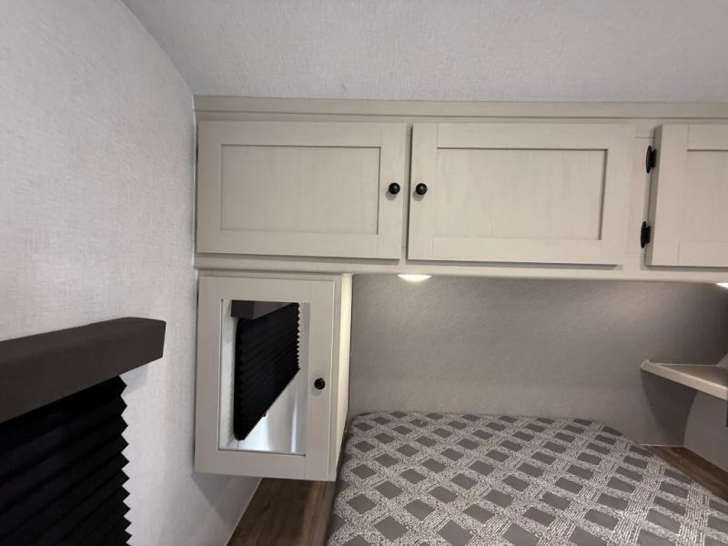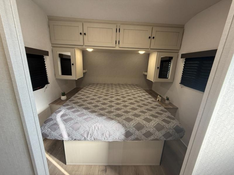 If you enjoy camping with a larger group, this travel trailer will be the perfect fit! There are quad bunks in the rear bunkhouse plus washer and dryer prep if you choose to add these appliances. You'll enjoy your own space up front in the private bedroom, which features a walk-around queen bed, dual bedside wardrobes and nightstands, plus underbed storage for extra blankets! Everyone can meet in the combined kitchen and living area while the chef makes breakfast on the two burner cooktop. There is also a microwave here, plus a 12V refrigerator and large pantry for food storage. Your crew can dine at the booth dinette, relax on the sofa with a theater seating option, or head outdoors to sit under the 16' power awning!