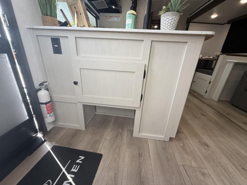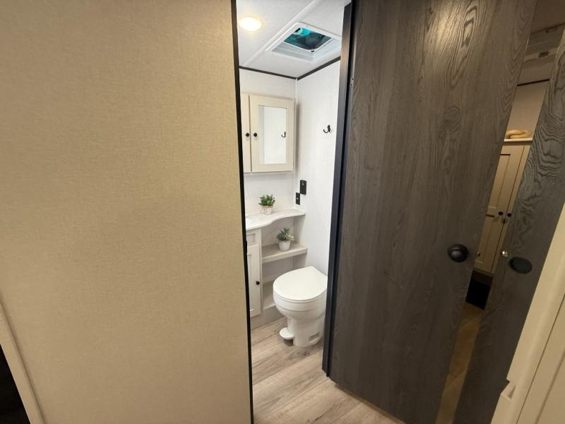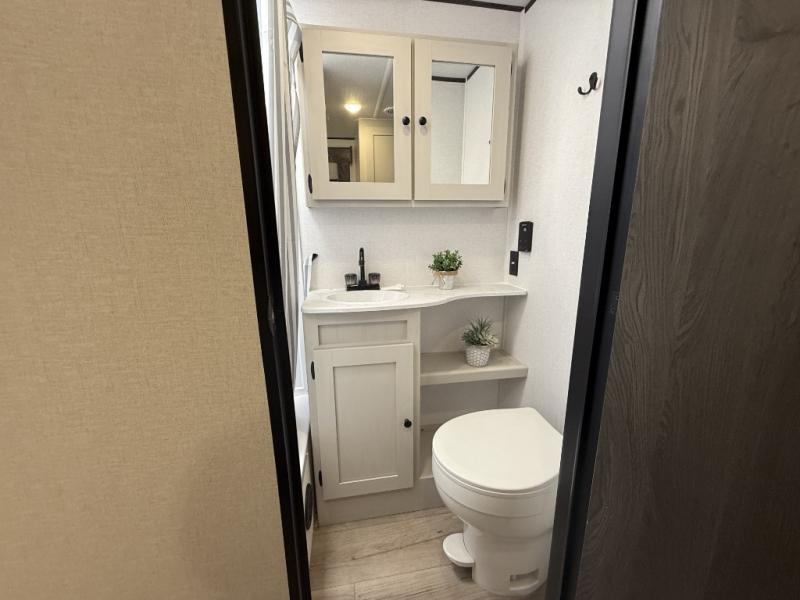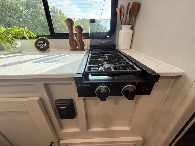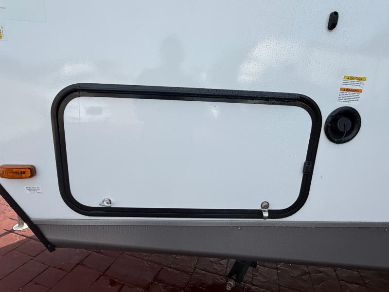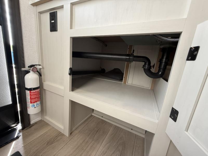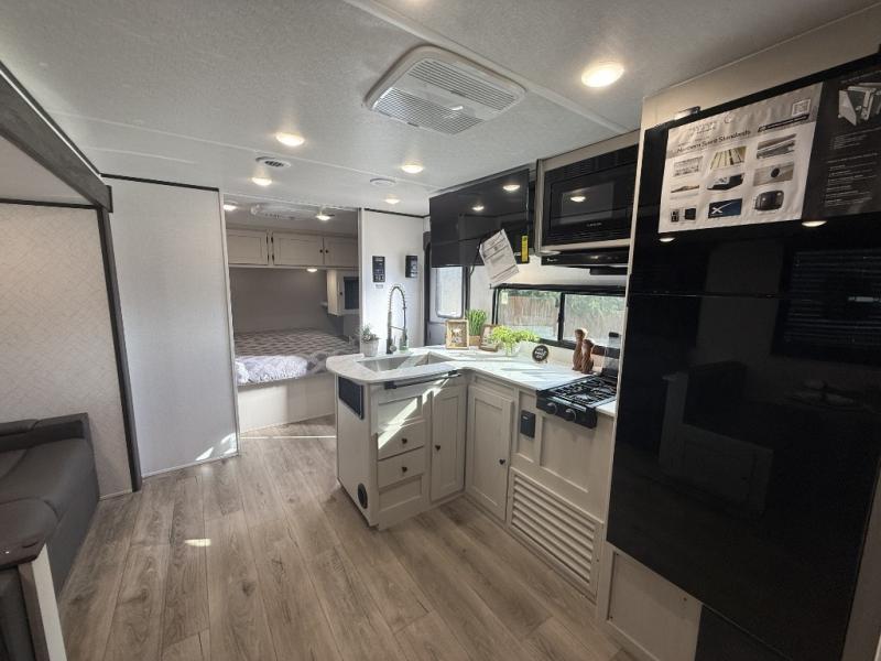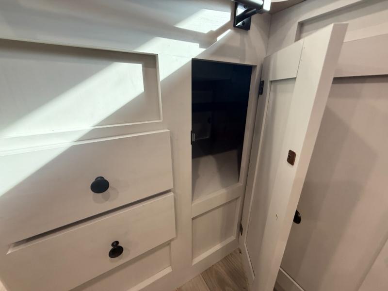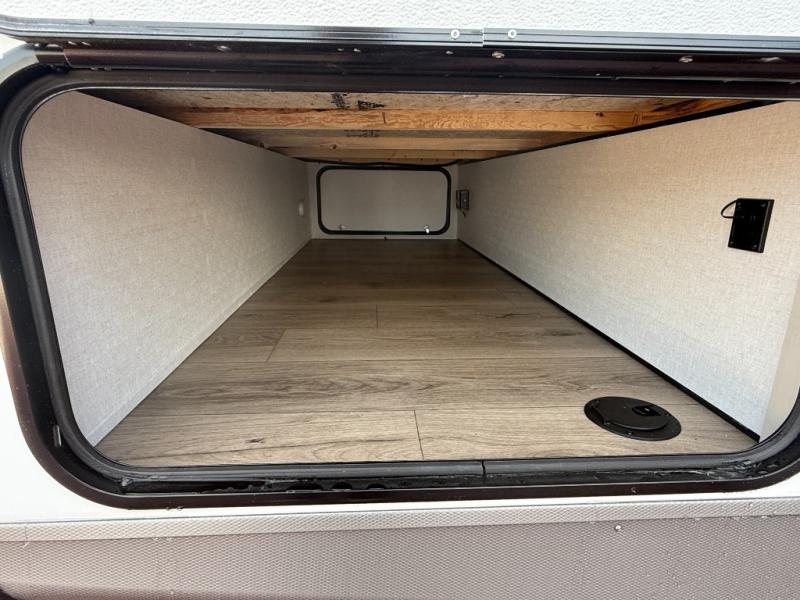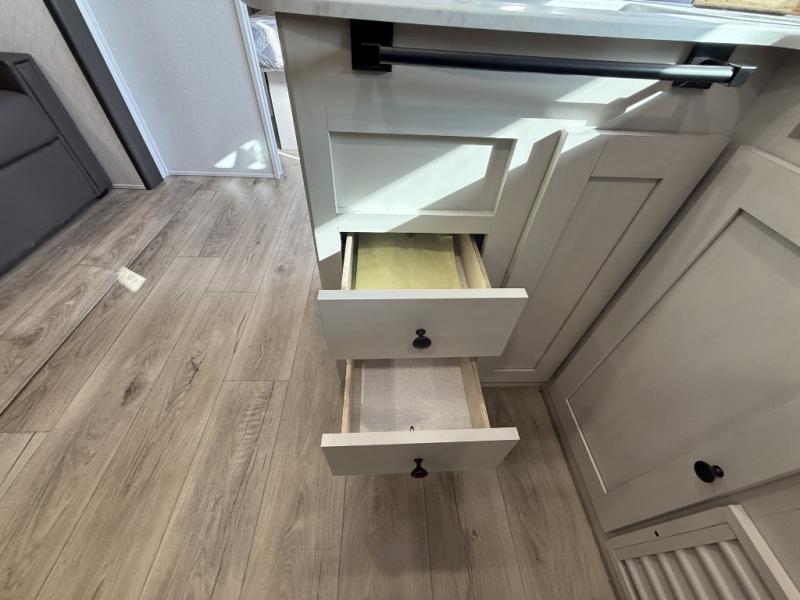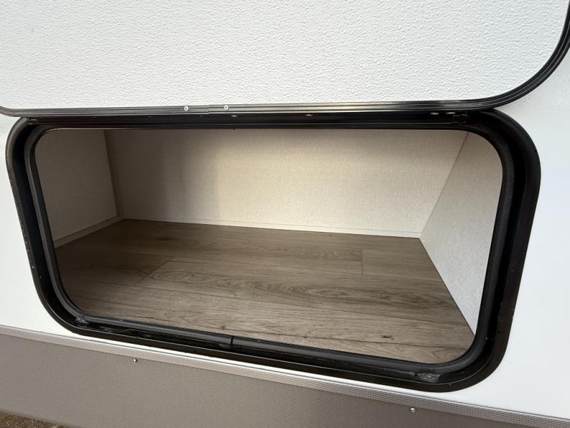 If you enjoy camping with a larger group, this travel trailer will be the perfect fit! There are quad bunks in the rear bunkhouse plus washer and dryer prep if you choose to add these appliances. You'll enjoy your own space up front in the private bedroom, which features a walk-around queen bed, dual bedside wardrobes and nightstands, plus underbed storage for extra blankets! Everyone can meet in the combined kitchen and living area while the chef makes breakfast on the two burner cooktop. There is also a microwave here, plus a 12V refrigerator and large pantry for food storage. Your crew can dine at the booth dinette, relax on the sofa with a theater seating option, or head outdoors to sit under the 16' power awning!