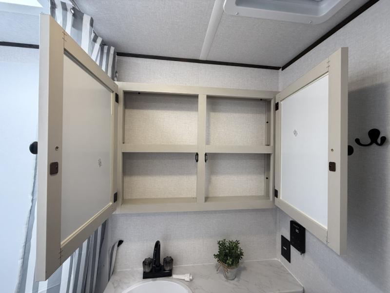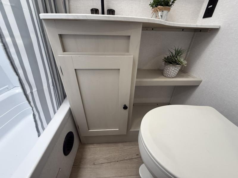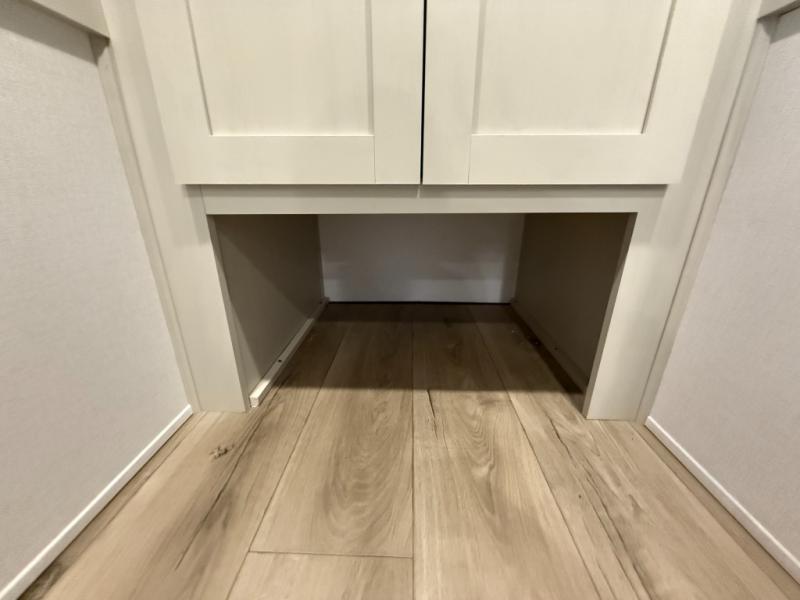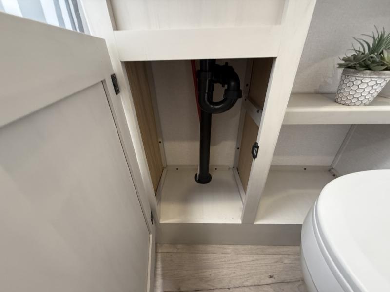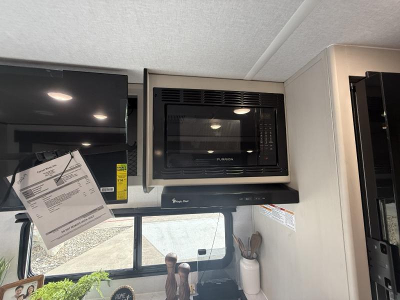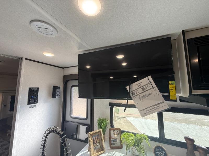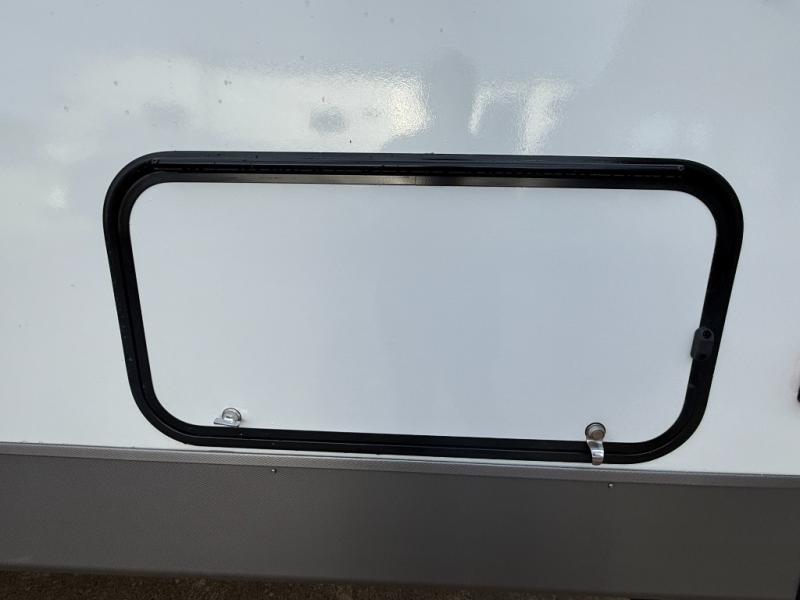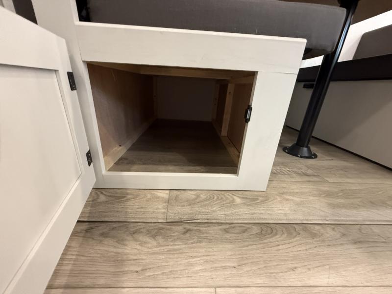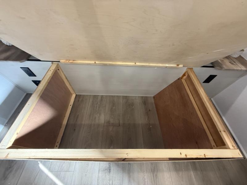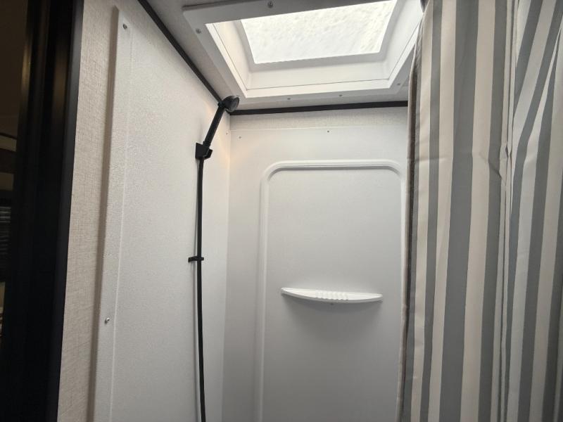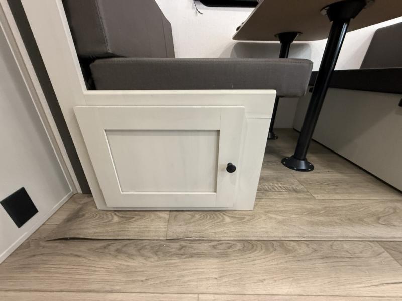 If you enjoy camping with a larger group, this travel trailer will be the perfect fit! There are quad bunks in the rear bunkhouse plus washer and dryer prep if you choose to add these appliances. You'll enjoy your own space up front in the private bedroom, which features a walk-around queen bed, dual bedside wardrobes and nightstands, plus underbed storage for extra blankets! Everyone can meet in the combined kitchen and living area while the chef makes breakfast on the two burner cooktop. There is also a microwave here, plus a 12V refrigerator and large pantry for food storage. Your crew can dine at the booth dinette, relax on the sofa with a theater seating option, or head outdoors to sit under the 16' power awning!