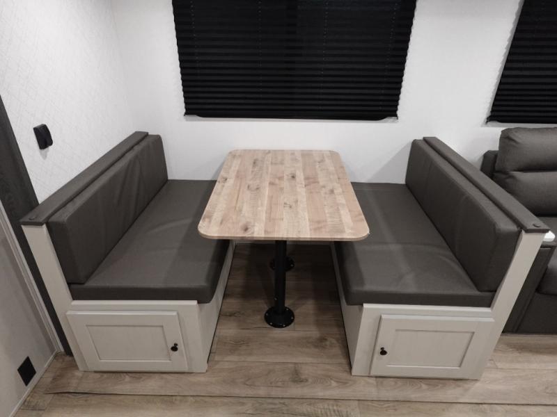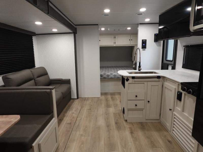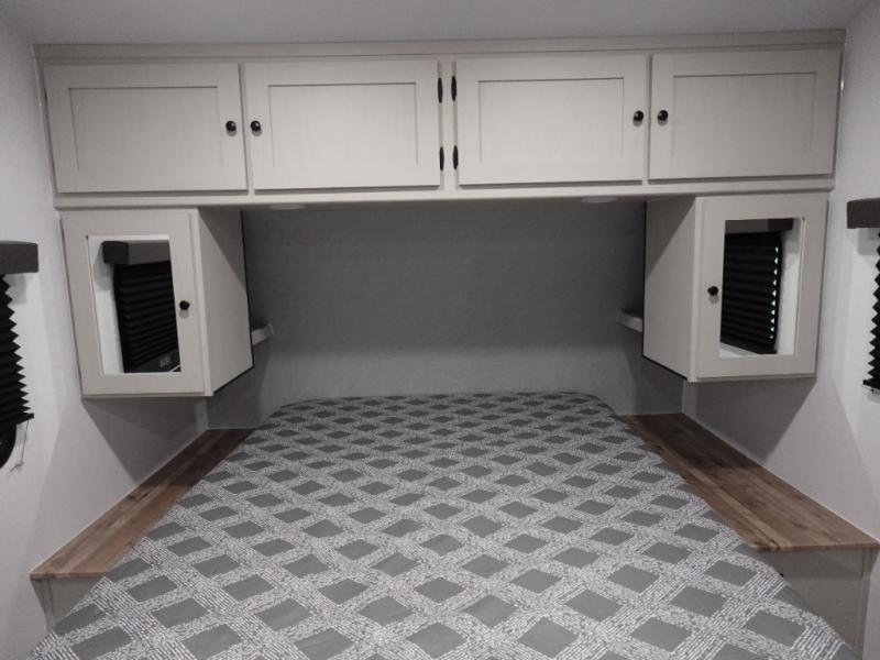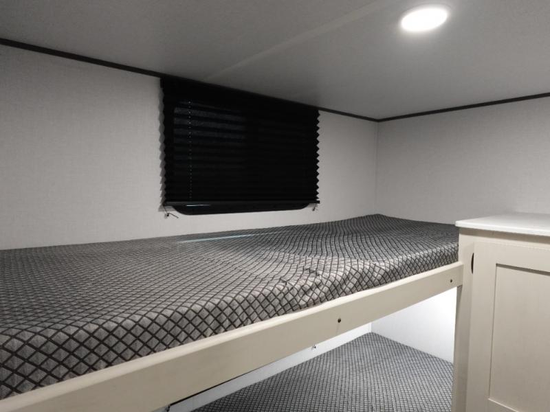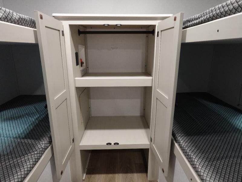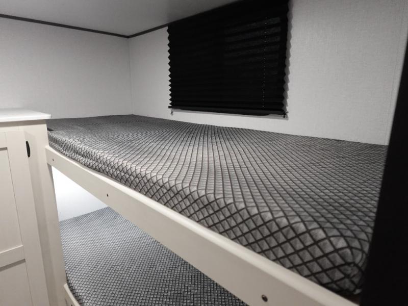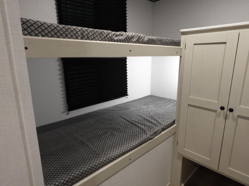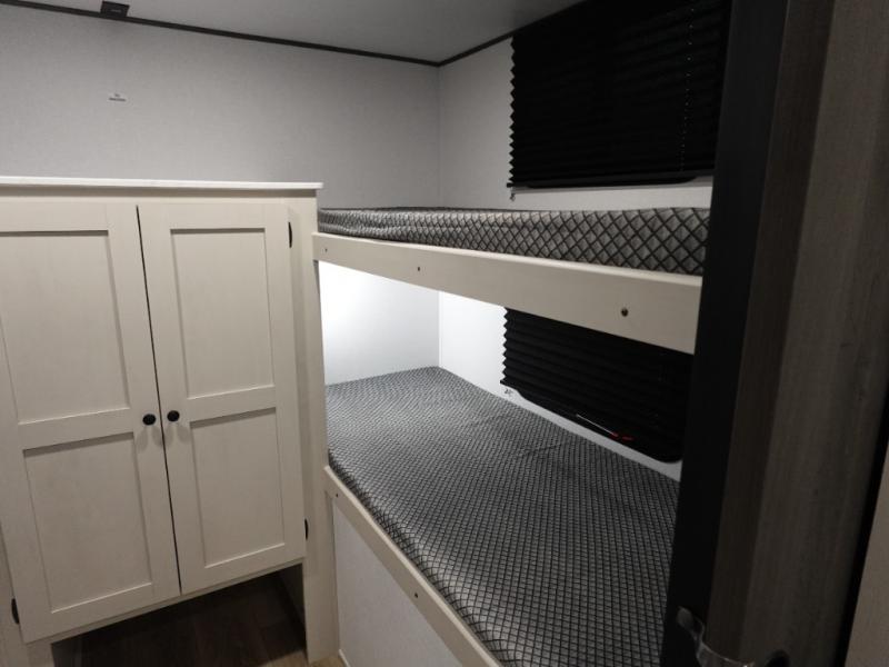 If you enjoy camping with a larger group, this travel trailer will be the perfect fit! There are quad bunks in the rear bunkhouse plus washer and dryer prep if you choose to add these appliances. You'll enjoy your own space up front in the private bedroom, which features a walk-around queen bed, dual bedside wardrobes and nightstands, plus underbed storage for extra blankets! Everyone can meet in the combined kitchen and living area while the chef makes breakfast on the two burner cooktop. There is also a microwave here, plus a 12V refrigerator and large pantry for food storage. Your crew can dine at the booth dinette, relax on the sofa or head outdoors to sit under the 16' power awning!