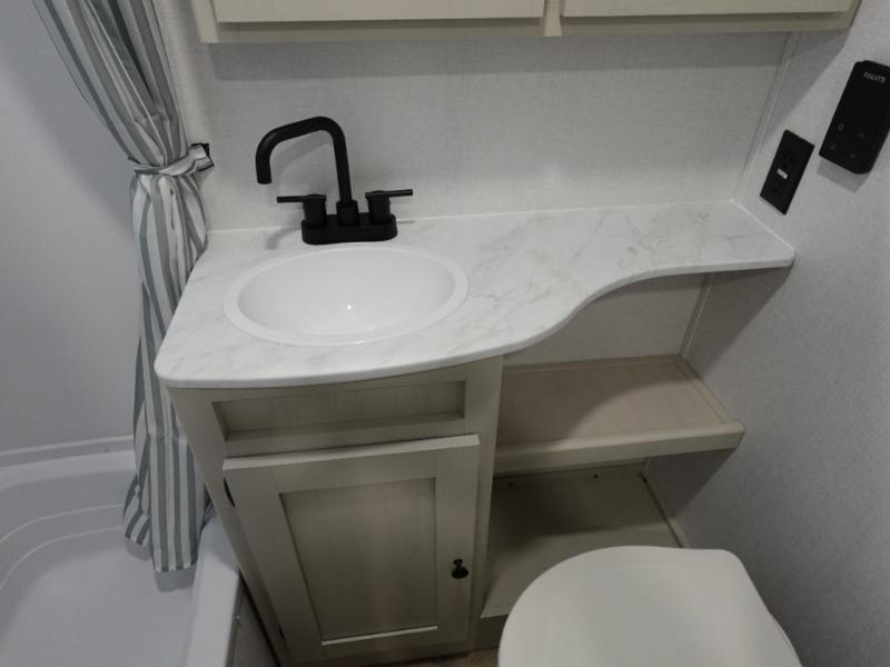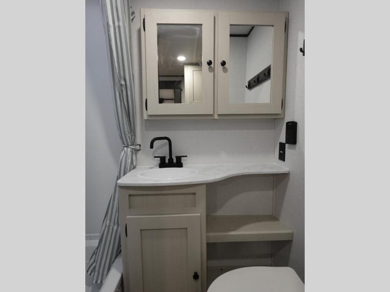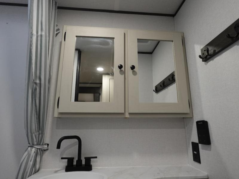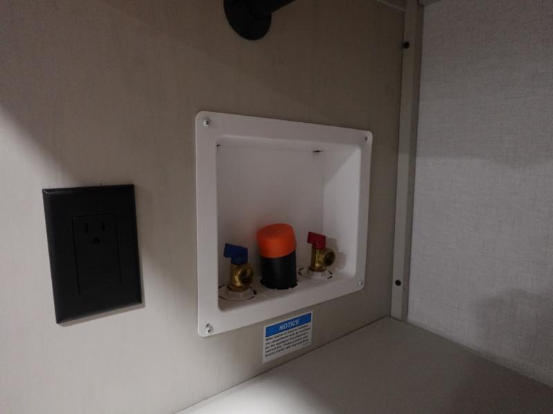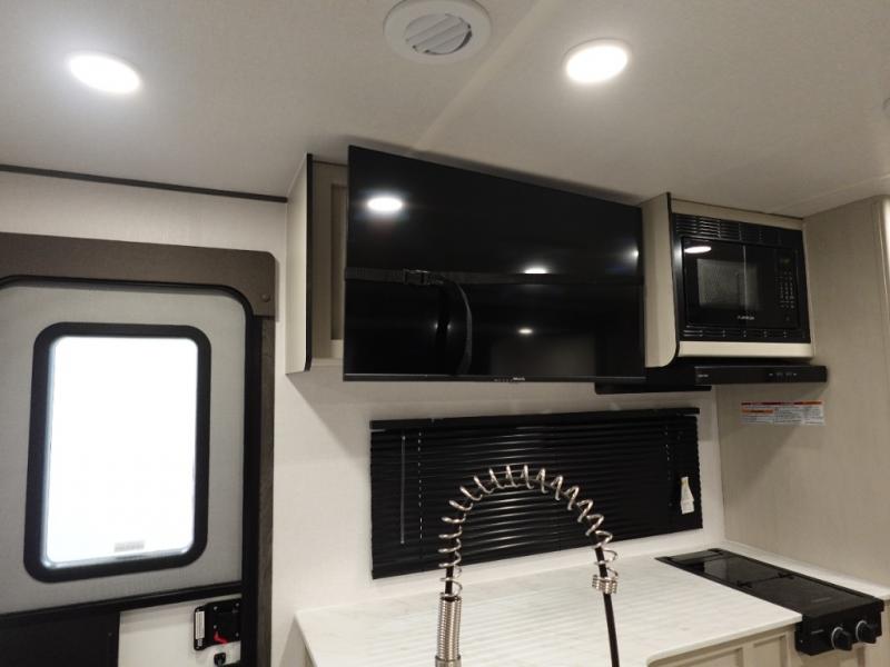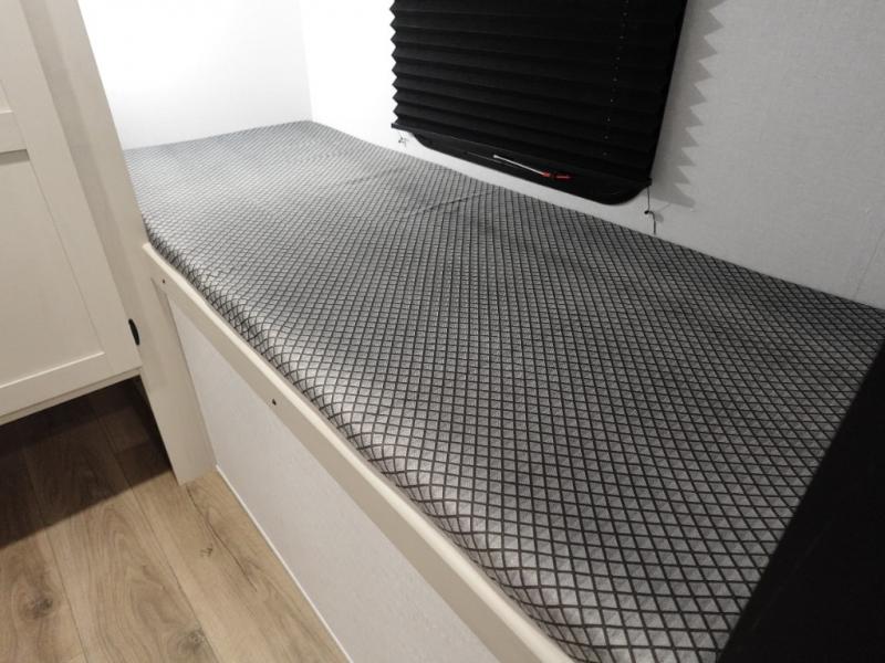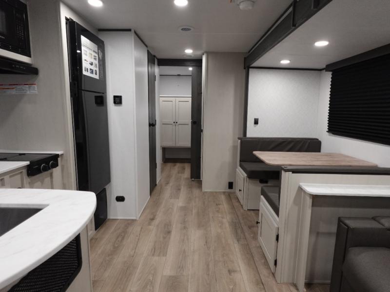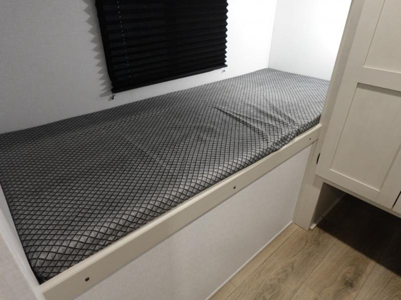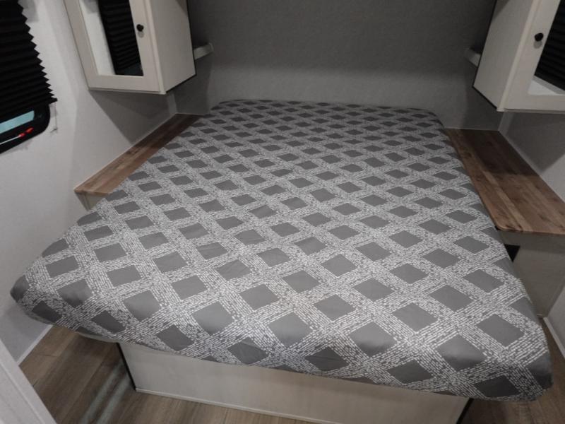 If you enjoy camping with a larger group, this travel trailer will be the perfect fit! There are quad bunks in the rear bunkhouse plus washer and dryer prep if you choose to add these appliances. You'll enjoy your own space up front in the private bedroom, which features a walk-around queen bed, dual bedside wardrobes and nightstands, plus underbed storage for extra blankets! Everyone can meet in the combined kitchen and living area while the chef makes breakfast on the two burner cooktop. There is also a microwave here, plus a 12V refrigerator and large pantry for food storage. Your crew can dine at the booth dinette, relax on the sofa or head outdoors to sit under the 16' power awning!