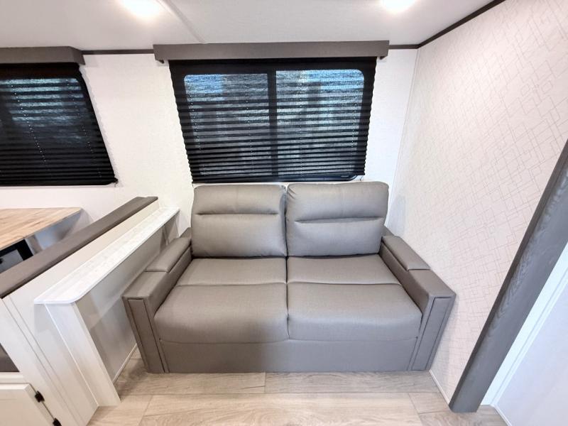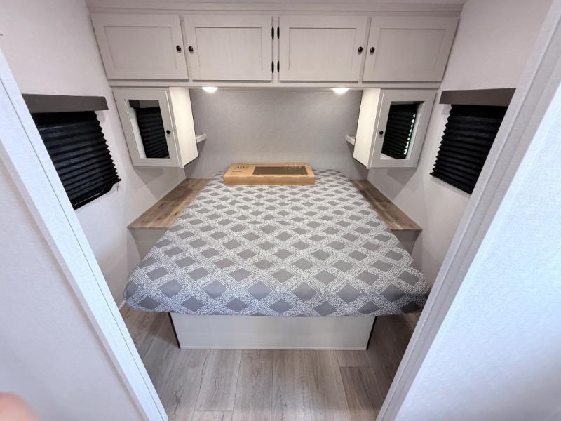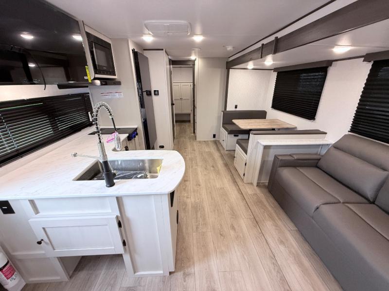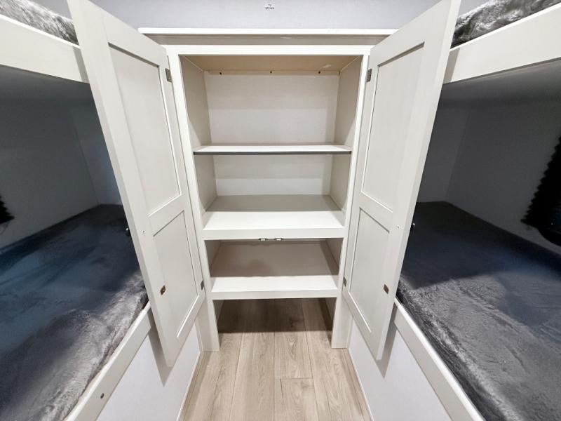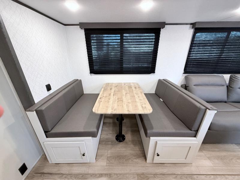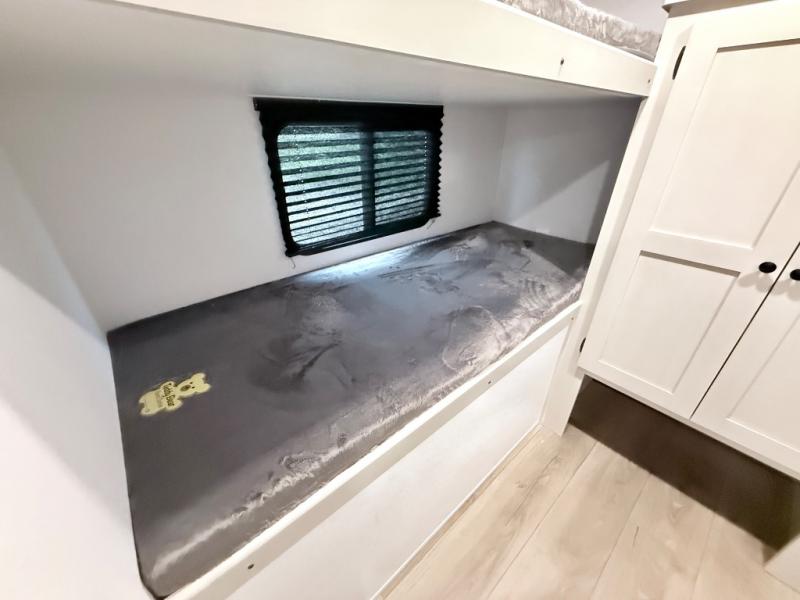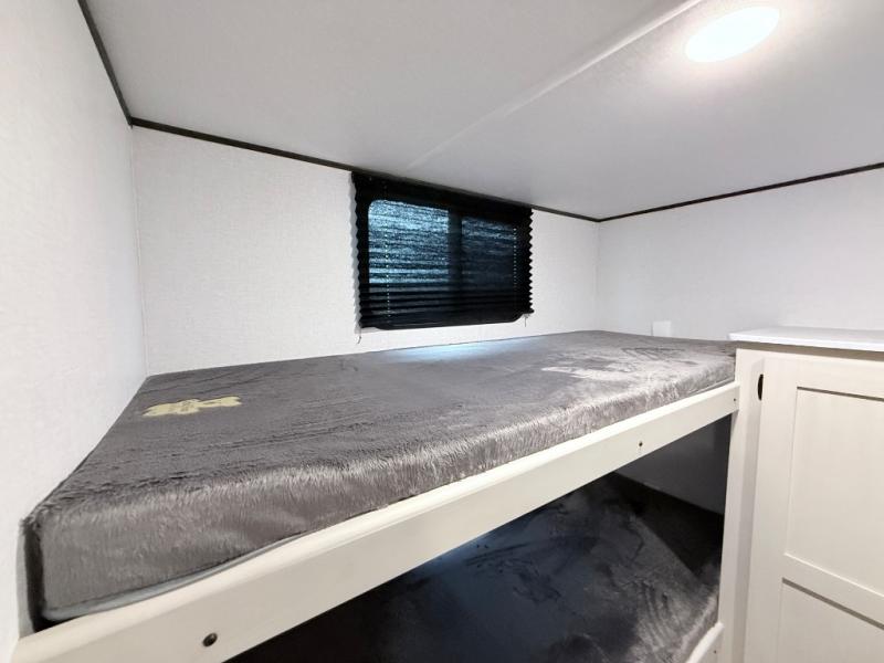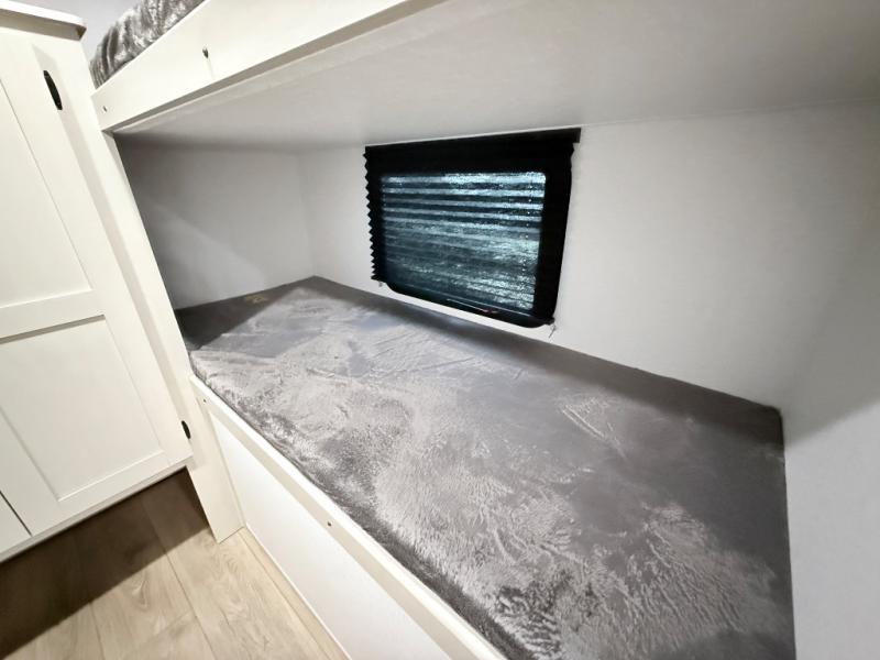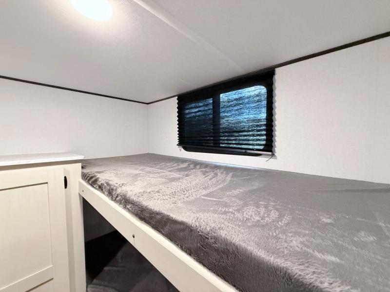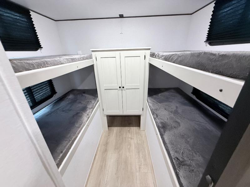 If you enjoy camping with a larger group, this travel trailer will be the perfect fit! There are quad bunks in the rear bunkhouse plus washer and dryer prep if you choose to add these appliances. You'll enjoy your own space up front in the private bedroom, which features a walk-around queen bed, dual bedside wardrobes and nightstands, plus underbed storage for extra blankets! Everyone can meet in the combined kitchen and living area while the chef makes breakfast on the two burner cooktop. There is also a microwave here, plus a 12V refrigerator and large pantry for food storage. Your crew can dine at the booth dinette, relax on the sofa with a theater seating option, or head outdoors to sit under the 16' power awning!