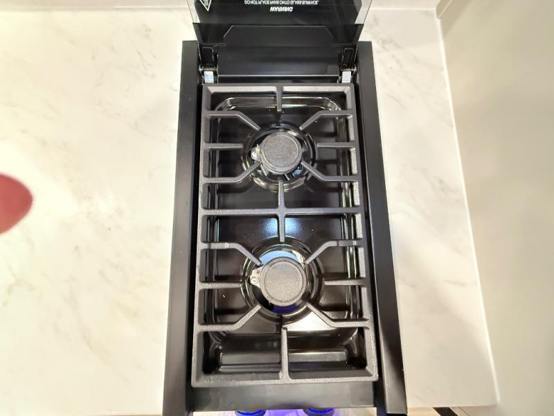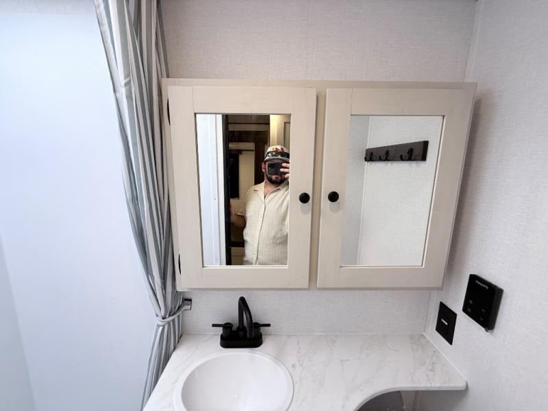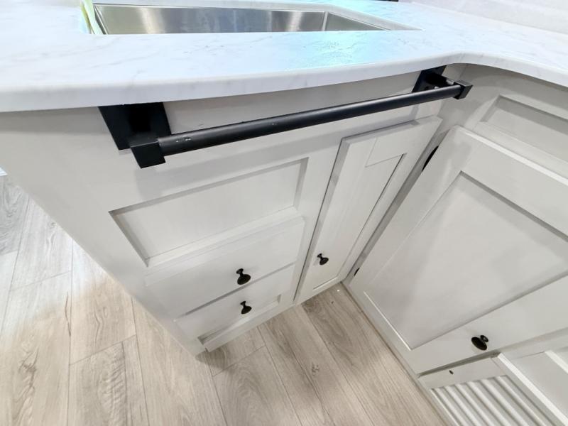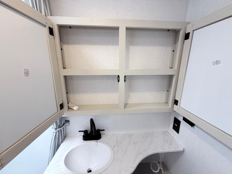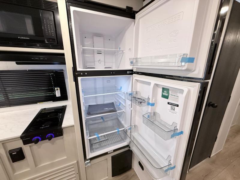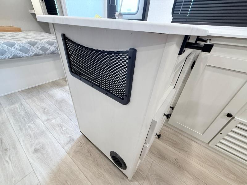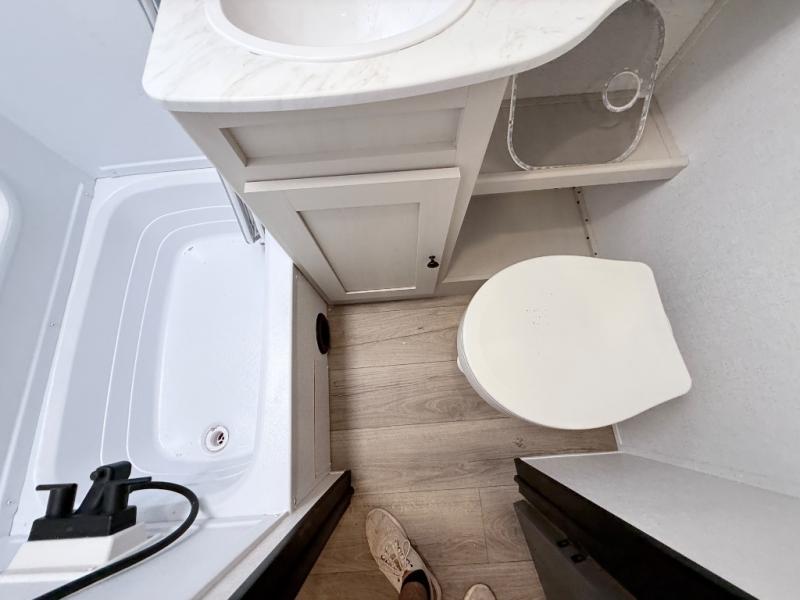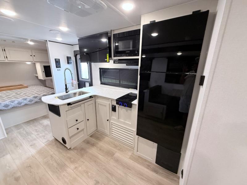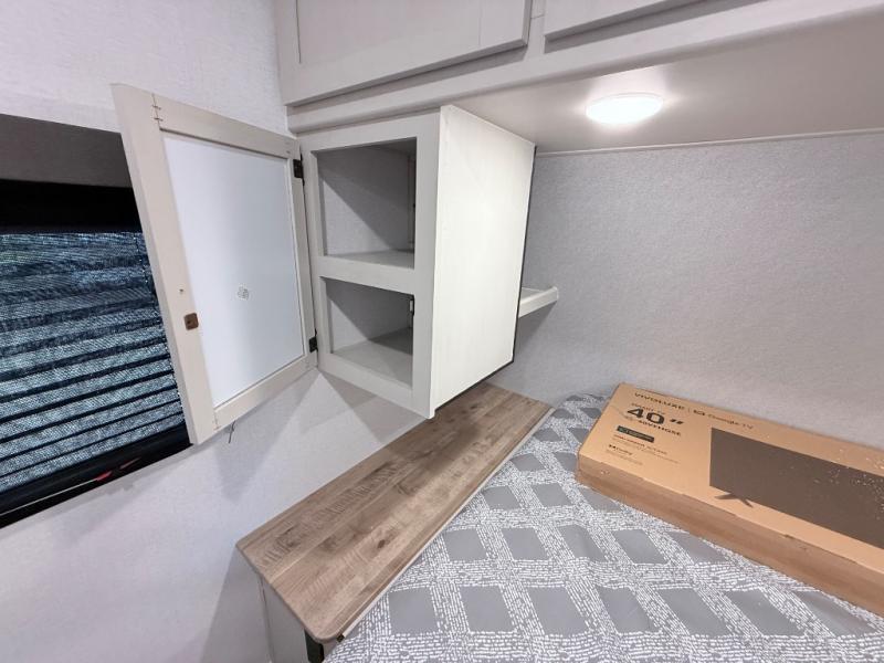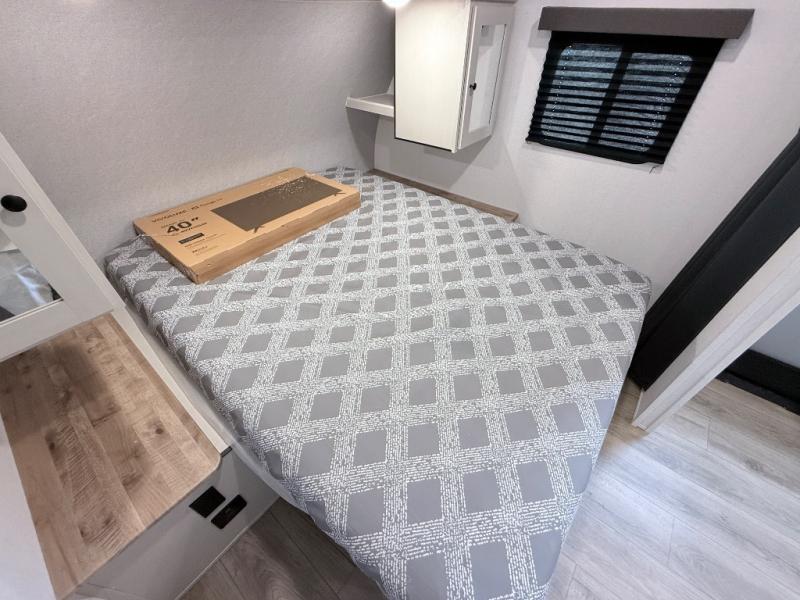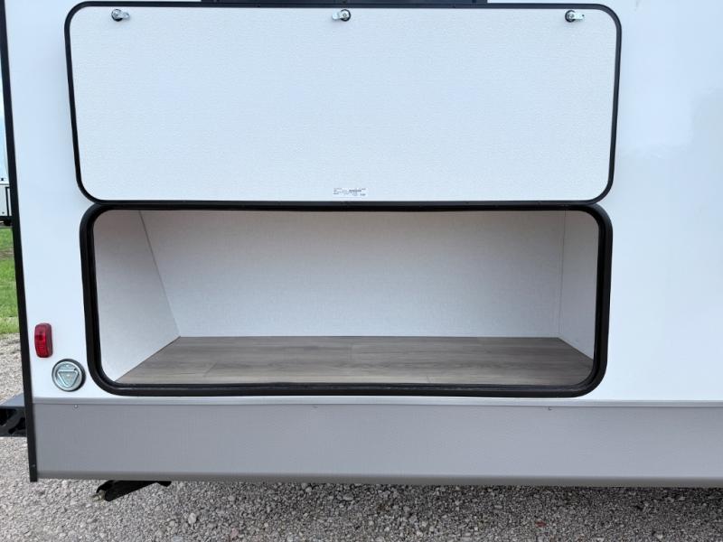 If you enjoy camping with a larger group, this travel trailer will be the perfect fit! There are quad bunks in the rear bunkhouse plus washer and dryer prep if you choose to add these appliances. You'll enjoy your own space up front in the private bedroom, which features a walk-around queen bed, dual bedside wardrobes and nightstands, plus underbed storage for extra blankets! Everyone can meet in the combined kitchen and living area while the chef makes breakfast on the two burner cooktop. There is also a microwave here, plus a 12V refrigerator and large pantry for food storage. Your crew can dine at the booth dinette, relax on the sofa with a theater seating option, or head outdoors to sit under the 16' power awning!