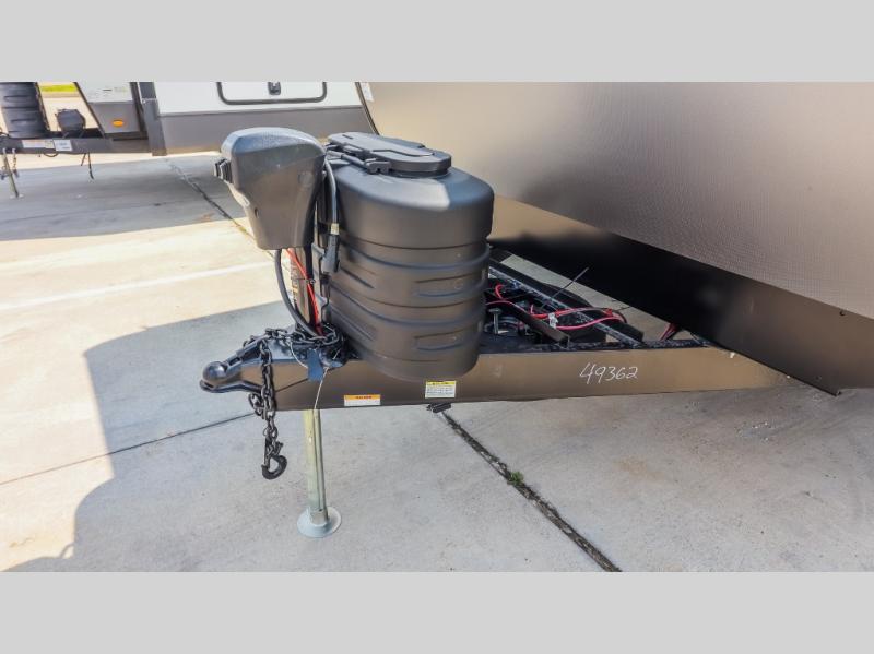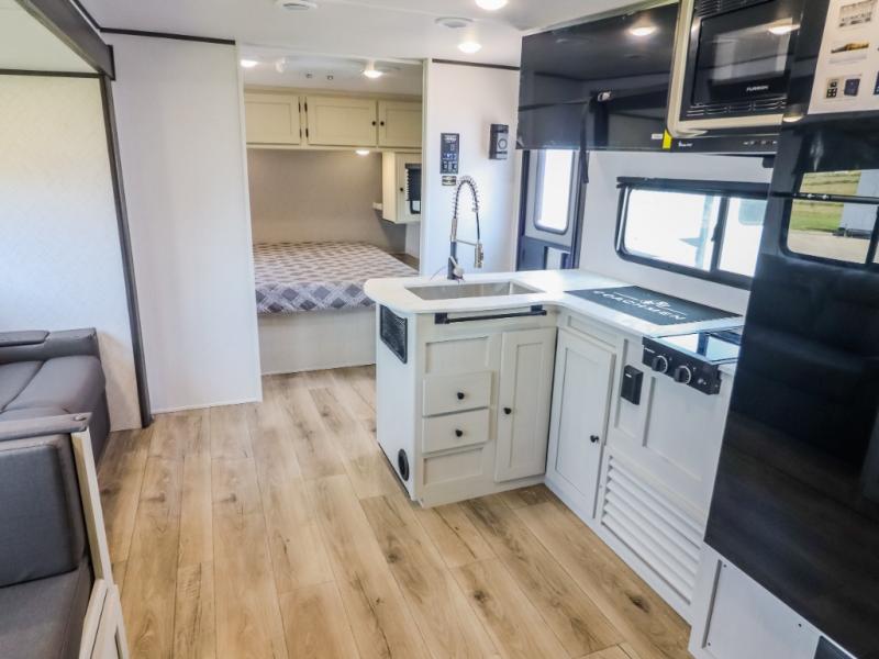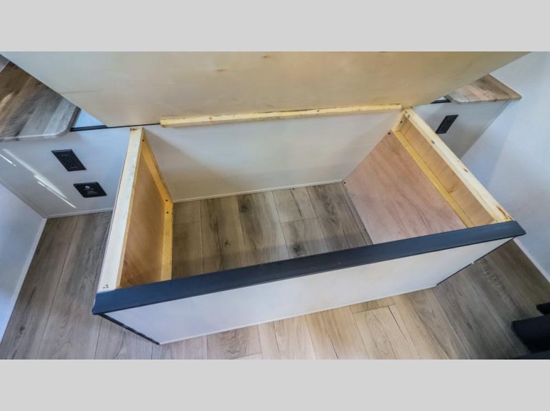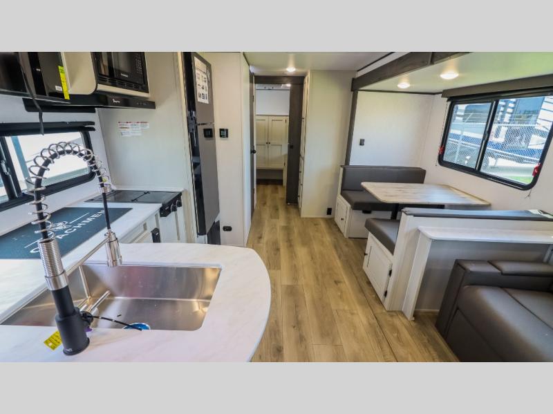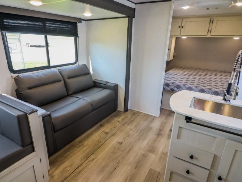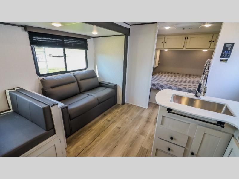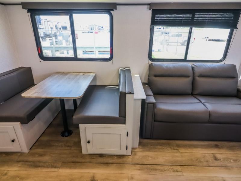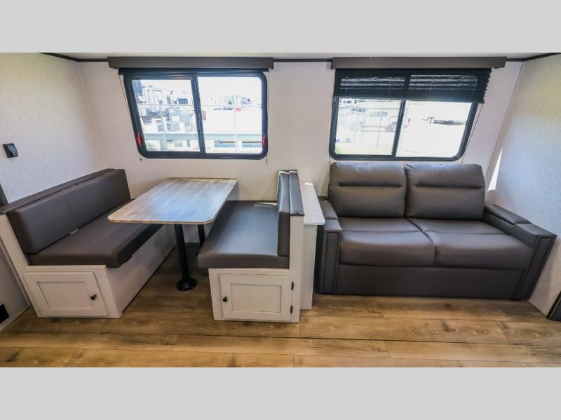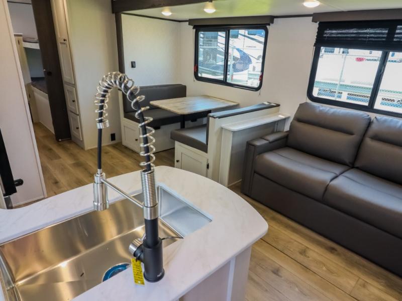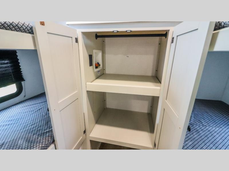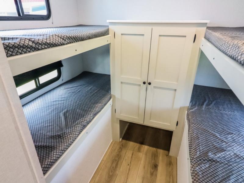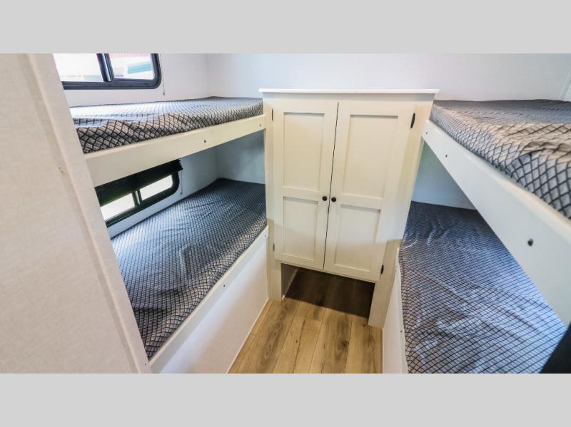 If you enjoy camping with a larger group, this travel trailer will be the perfect fit! There are quad bunks in the rear bunkhouse plus washer and dryer prep if you choose to add these appliances. You'll enjoy your own space up front in the private bedroom, which features a walk-around queen bed, dual bedside wardrobes and nightstands, plus underbed storage for extra blankets! Everyone can meet in the combined kitchen and living area while the chef makes breakfast on the two burner cooktop. There is also a microwave here, plus a 12V refrigerator and large pantry for food storage. Your crew can dine at the booth dinette, relax on the sofa with a theater seating option, or head outdoors to sit under the 16' power awning!