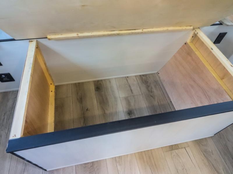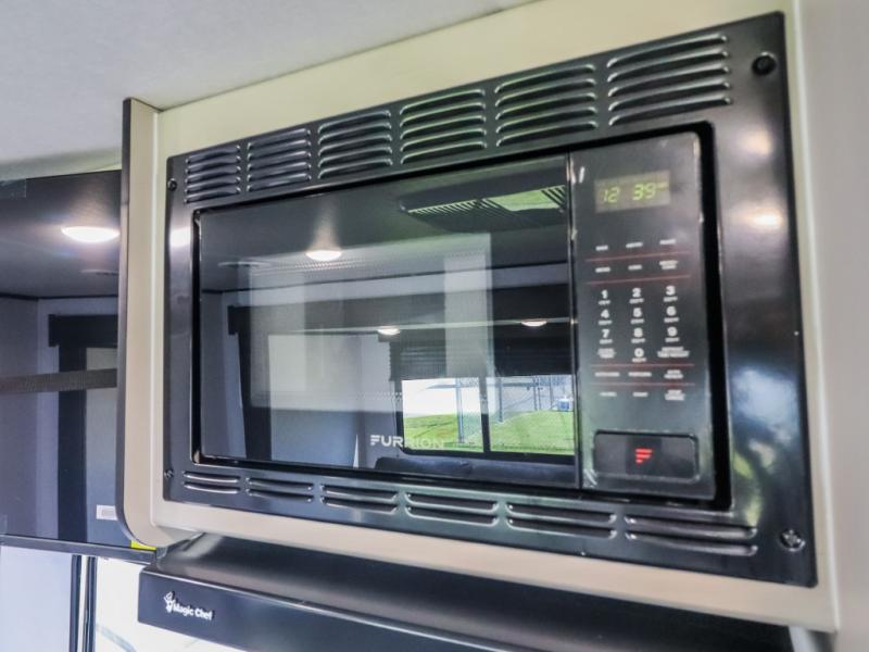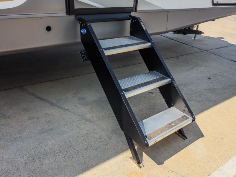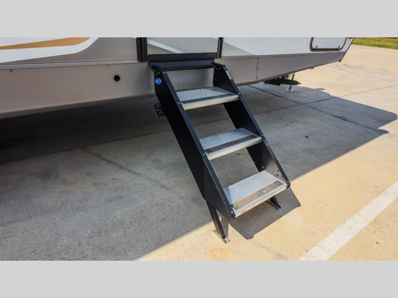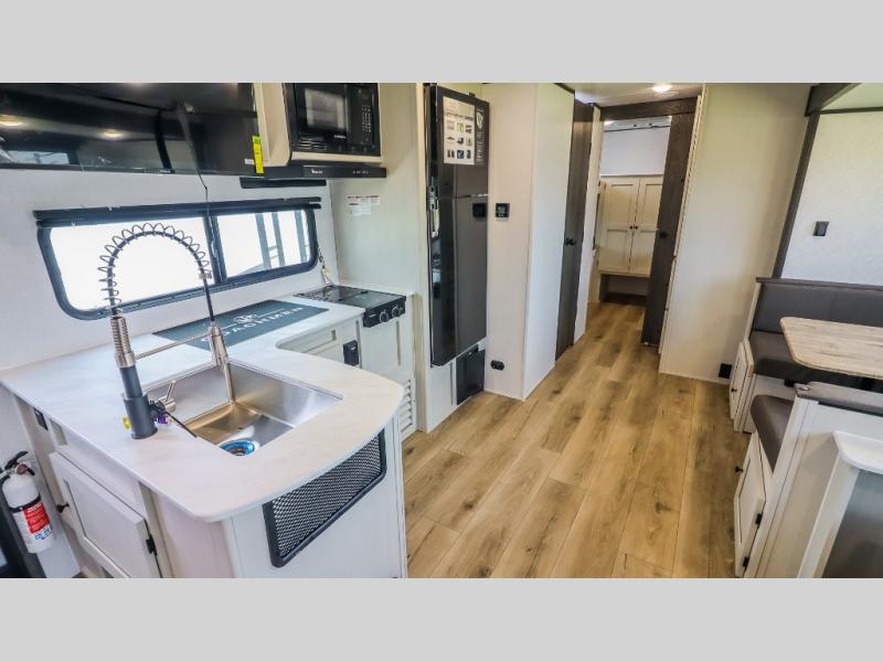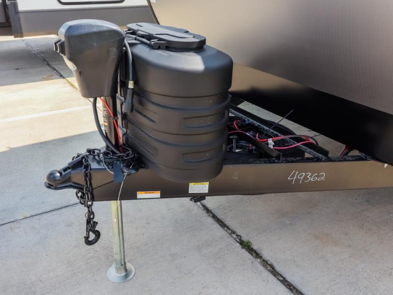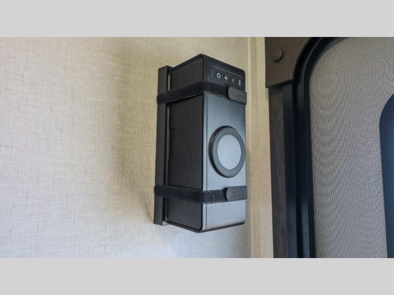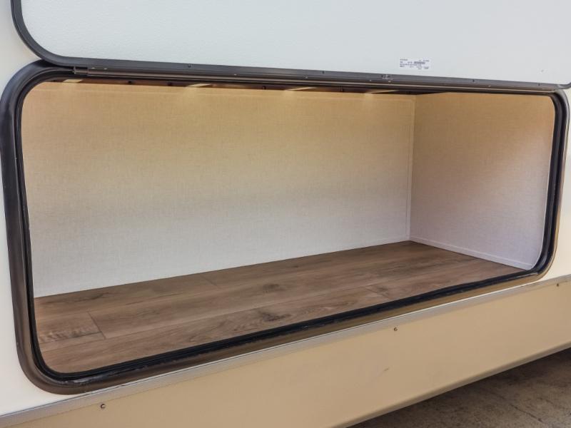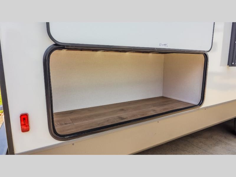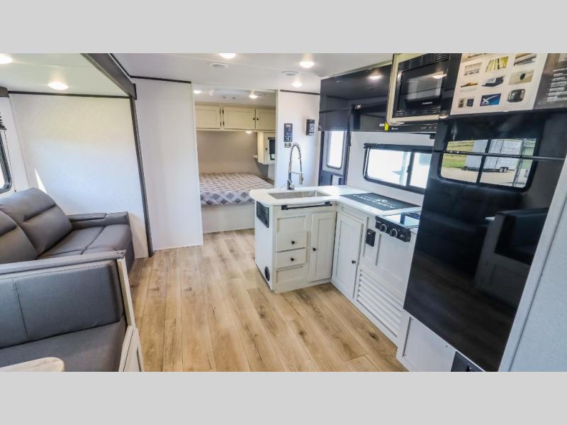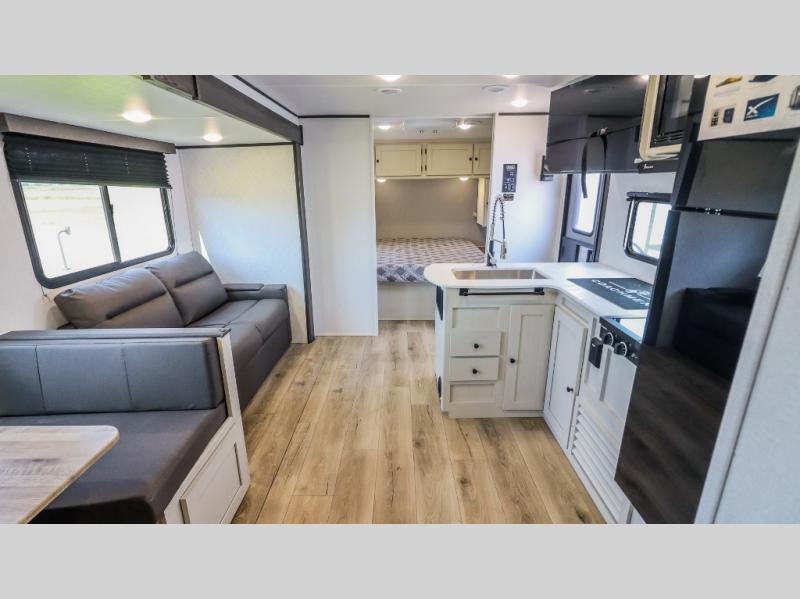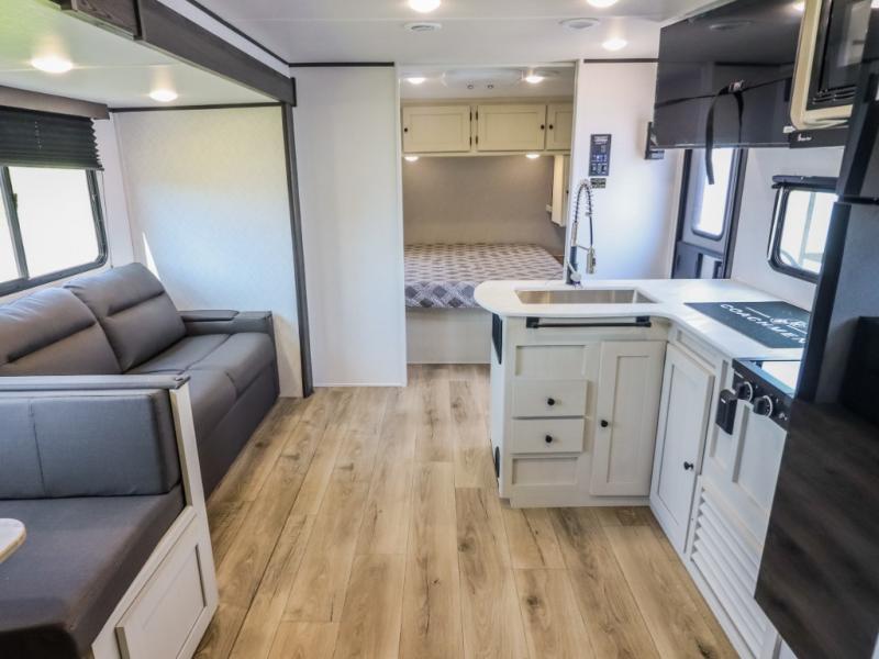 If you enjoy camping with a larger group, this travel trailer will be the perfect fit! There are quad bunks in the rear bunkhouse plus washer and dryer prep if you choose to add these appliances. You'll enjoy your own space up front in the private bedroom, which features a walk-around queen bed, dual bedside wardrobes and nightstands, plus underbed storage for extra blankets! Everyone can meet in the combined kitchen and living area while the chef makes breakfast on the two burner cooktop. There is also a microwave here, plus a 12V refrigerator and large pantry for food storage. Your crew can dine at the booth dinette, relax on the sofa with a theater seating option, or head outdoors to sit under the 16' power awning!