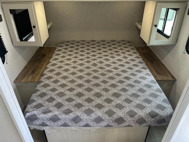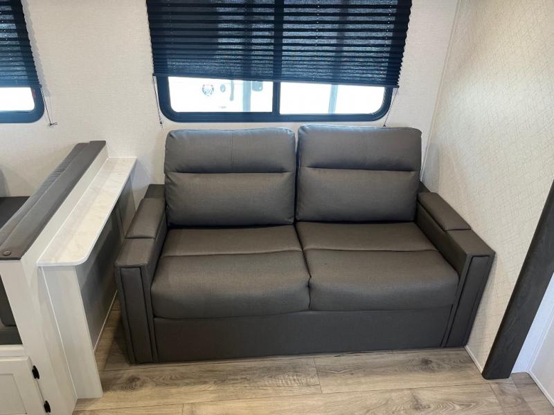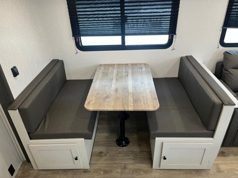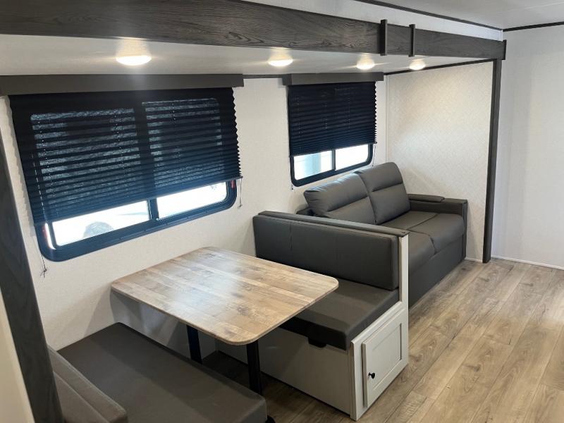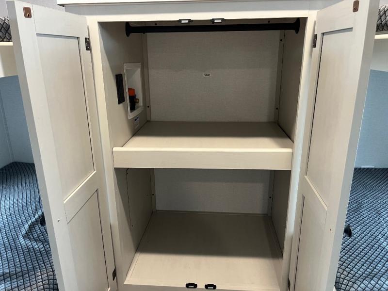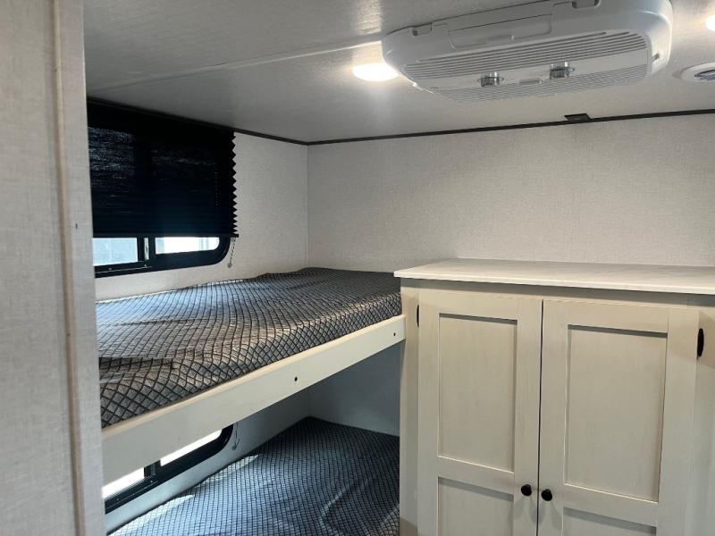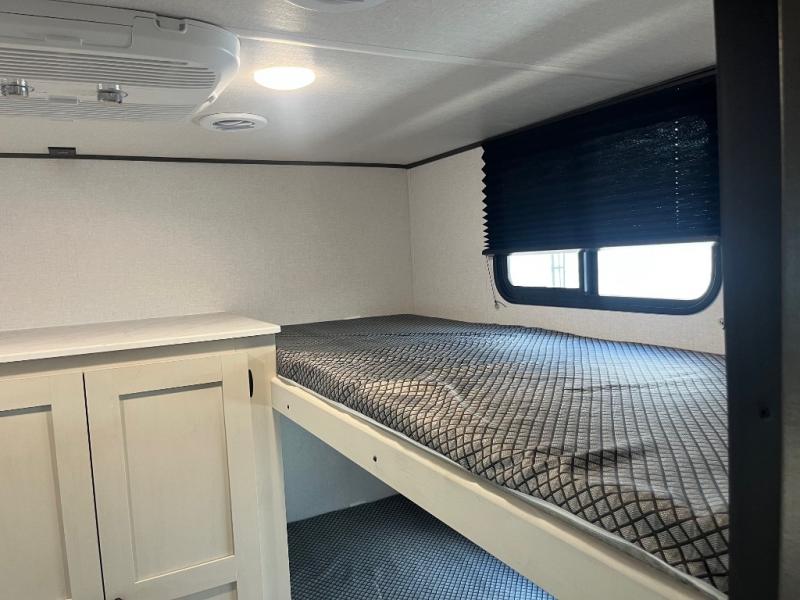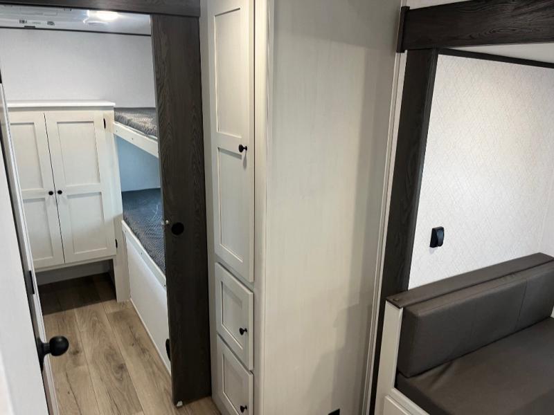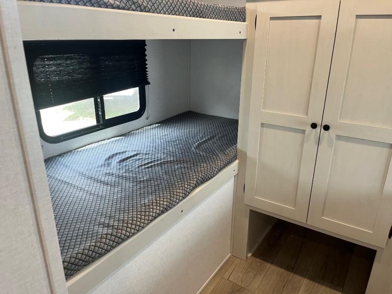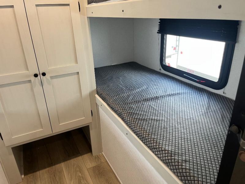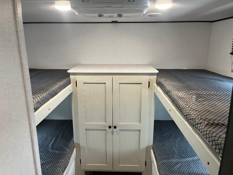If you enjoy camping with a larger group, this travel trailer will be the perfect fit! There are quad bunks in the rear bunkhouse plus washer and dryer prep if you choose to add these appliances. You'll enjoy your own space up front in the private bedroom, which features a walk-around queen bed, dual bedside wardrobes and nightstands, plus underbed storage for extra blankets! Everyone can meet in the combined kitchen and living area while the chef makes breakfast on the two burner cooktop. There is also a microwave here, plus a 12V refrigerator and large pantry for food storage. Your crew can dine at the booth dinette, relax on the sofa with a theater seating option, or head outdoors to sit under the 16' power awning!
