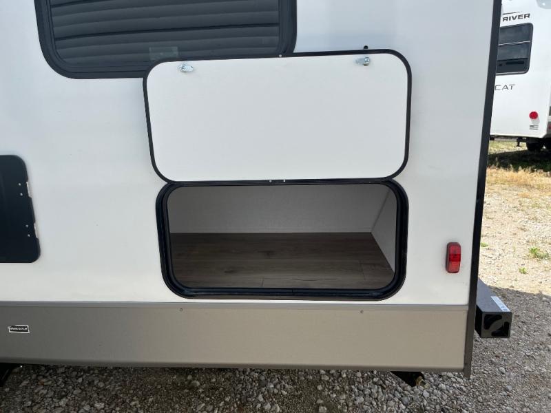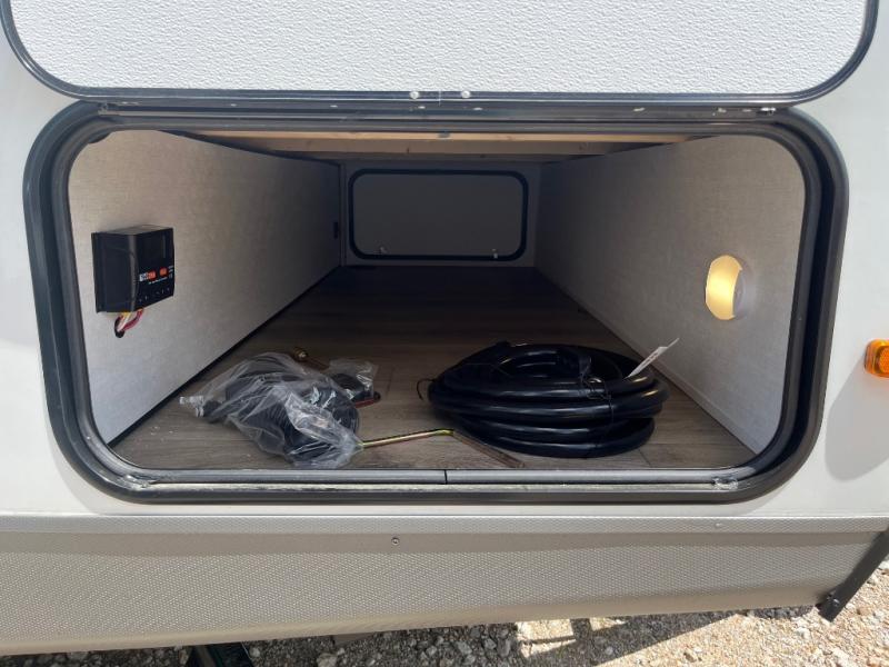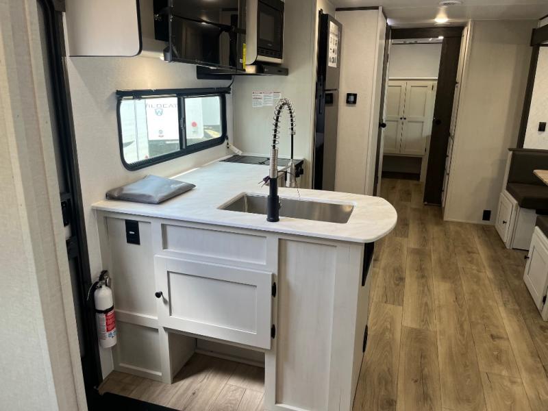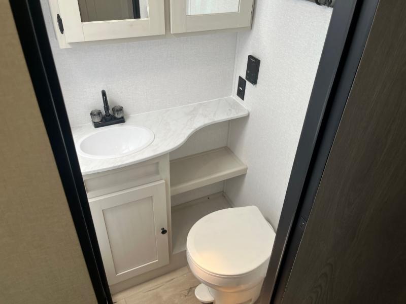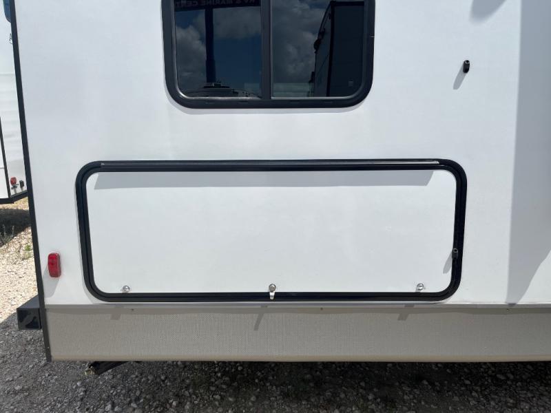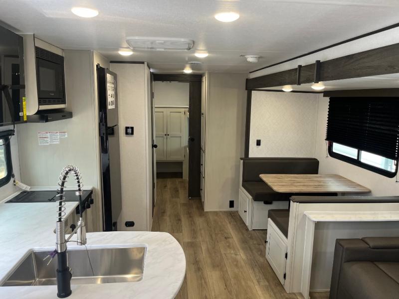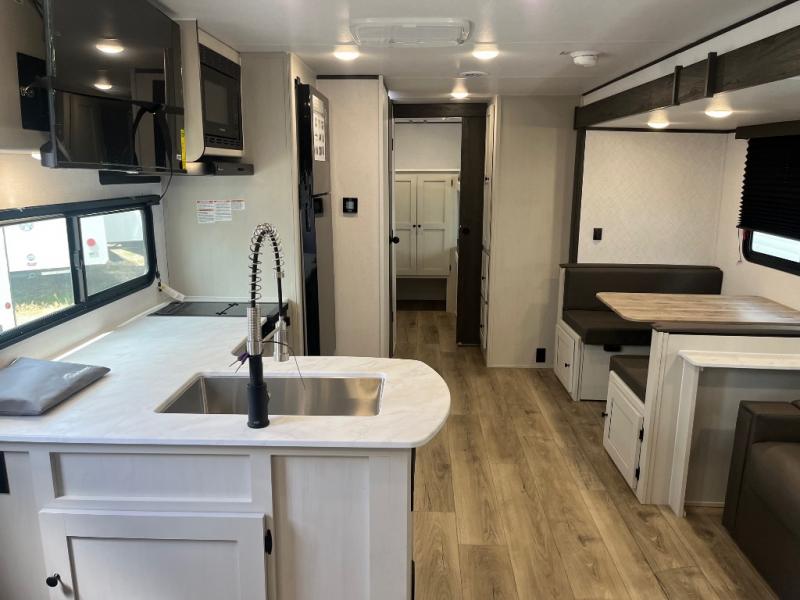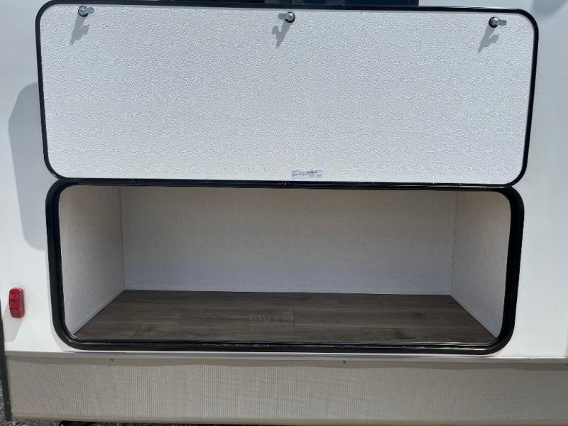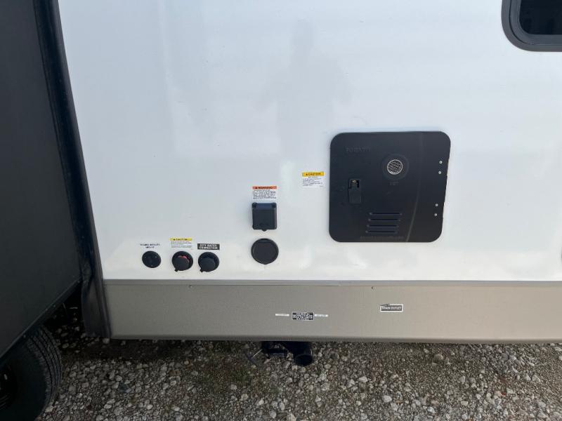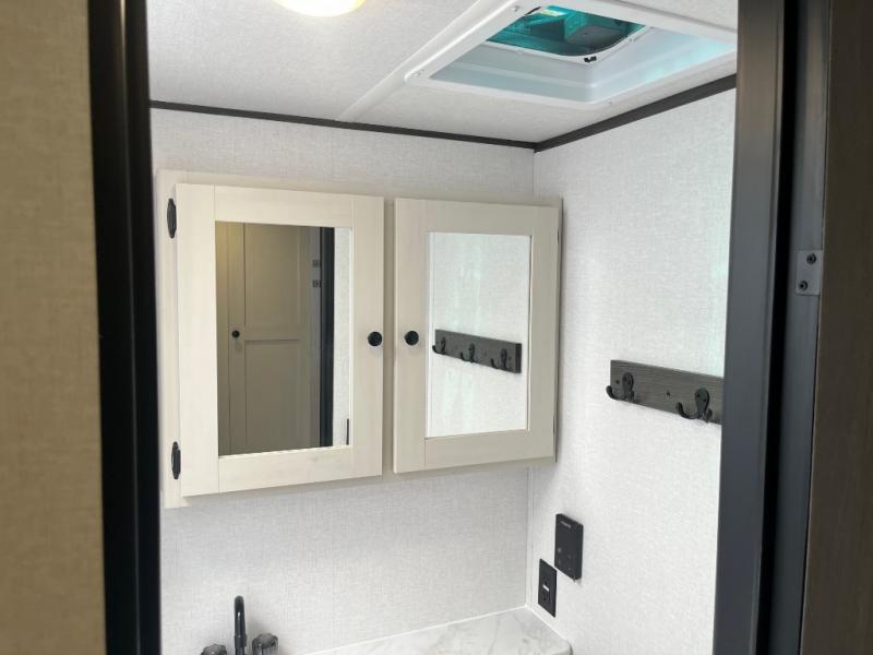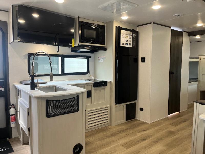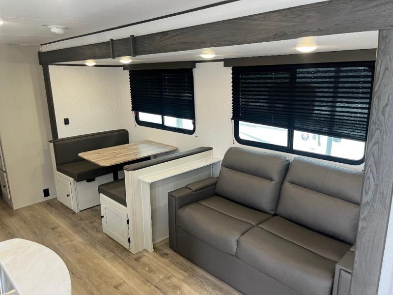 If you enjoy camping with a larger group, this travel trailer will be the perfect fit! There are quad bunks in the rear bunkhouse plus washer and dryer prep if you choose to add these appliances. You'll enjoy your own space up front in the private bedroom, which features a walk-around queen bed, dual bedside wardrobes and nightstands, plus underbed storage for extra blankets! Everyone can meet in the combined kitchen and living area while the chef makes breakfast on the two burner cooktop. There is also a microwave here, plus a 12V refrigerator and large pantry for food storage. Your crew can dine at the booth dinette, relax on the sofa with a theater seating option, or head outdoors to sit under the 16' power awning!