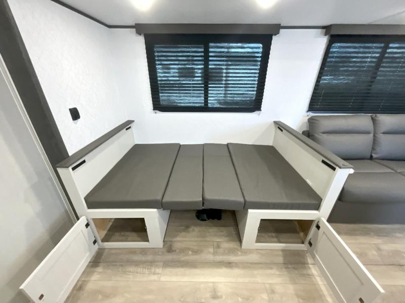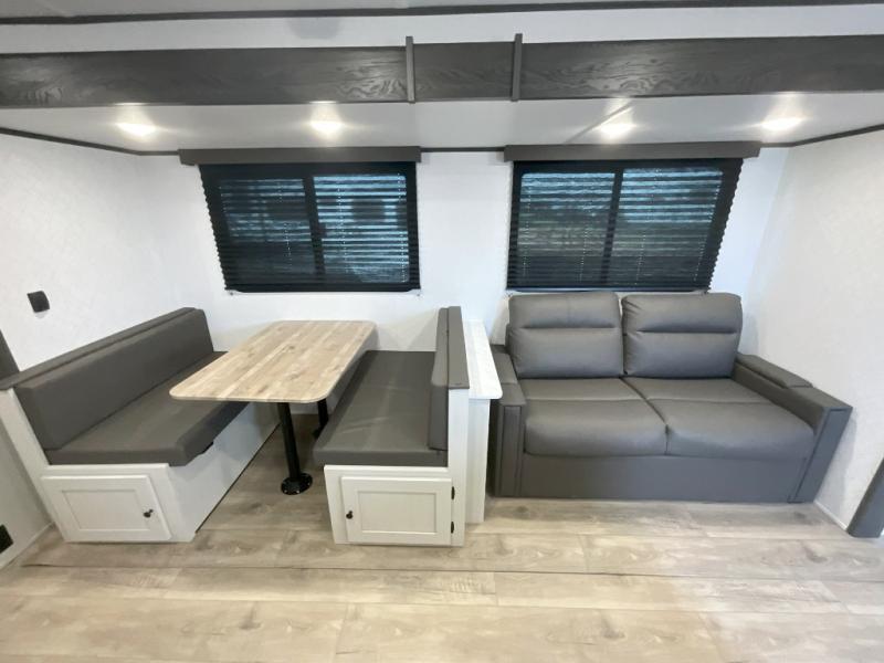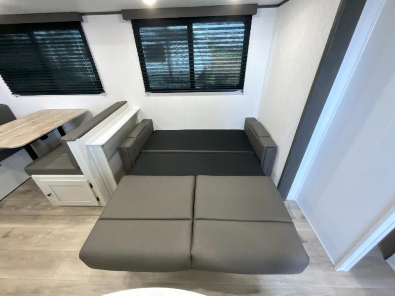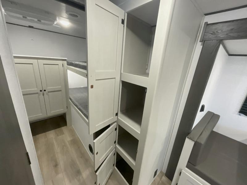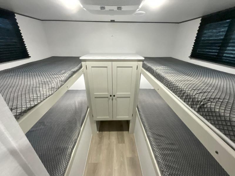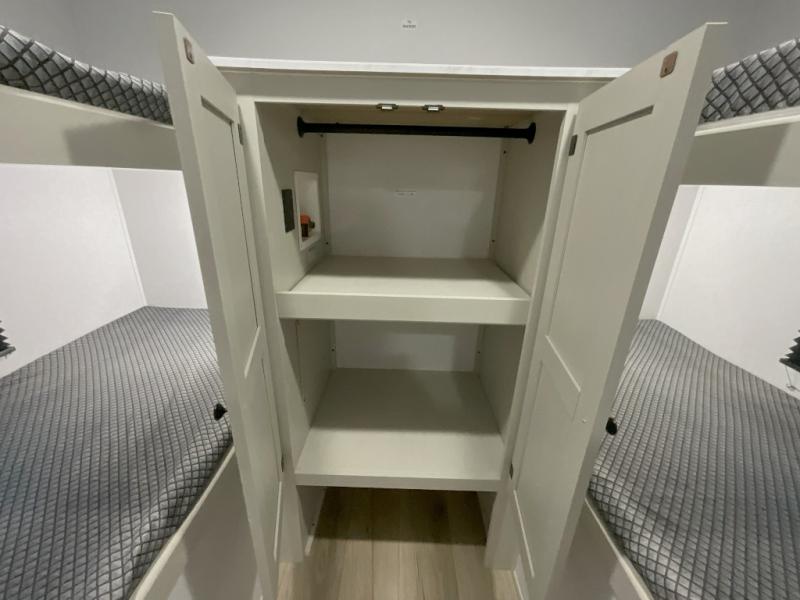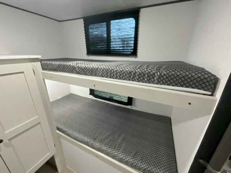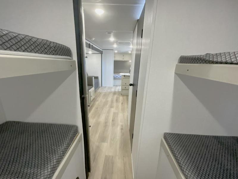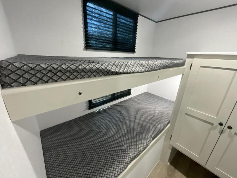 If you enjoy camping with a larger group, this travel trailer will be the perfect fit! There are quad bunks in the rear bunkhouse plus washer and dryer prep if you choose to add these appliances. You'll enjoy your own space up front in the private bedroom, which features a walk-around queen bed, dual bedside wardrobes and nightstands, plus underbed storage for extra blankets! Everyone can meet in the combined kitchen and living area while the chef makes breakfast on the two burner cooktop. There is also a microwave here, plus a 12V refrigerator and large pantry for food storage. Your crew can dine at the booth dinette, relax on the sofa with a theater seating option, or head outdoors to sit under the 16' power awning!