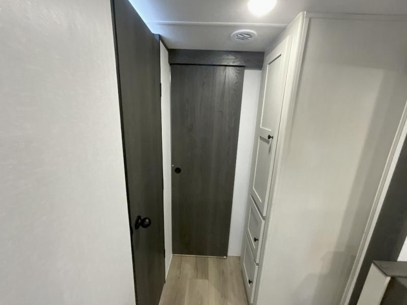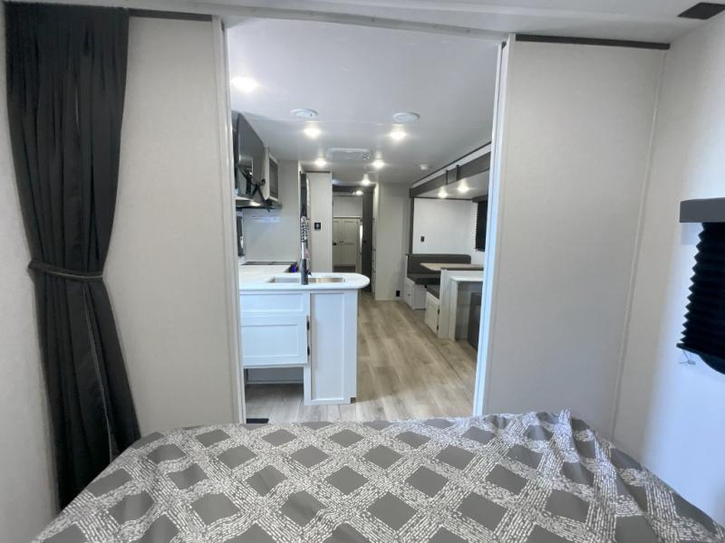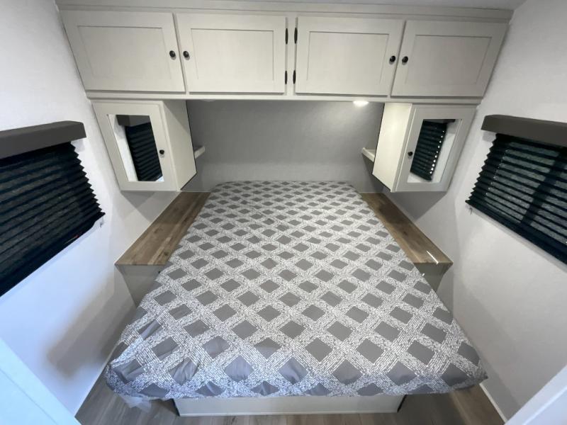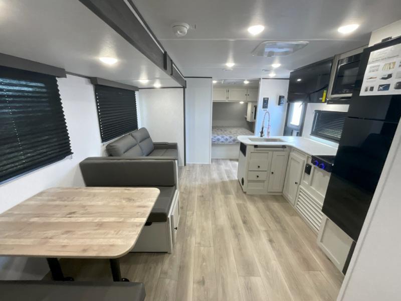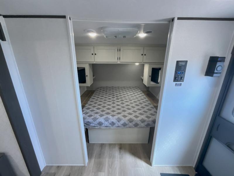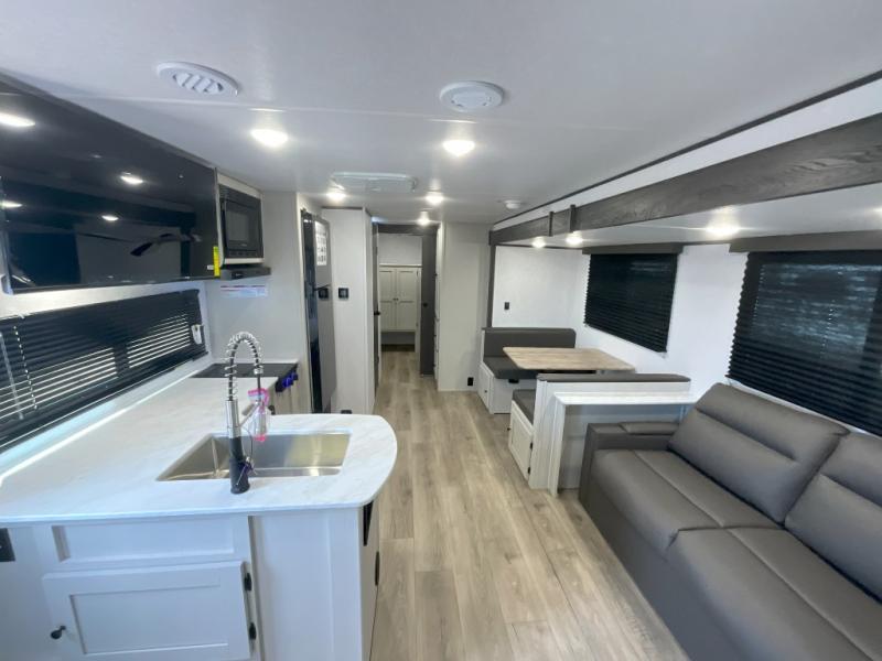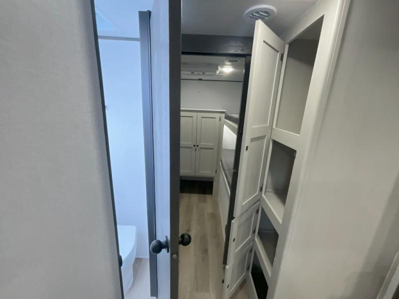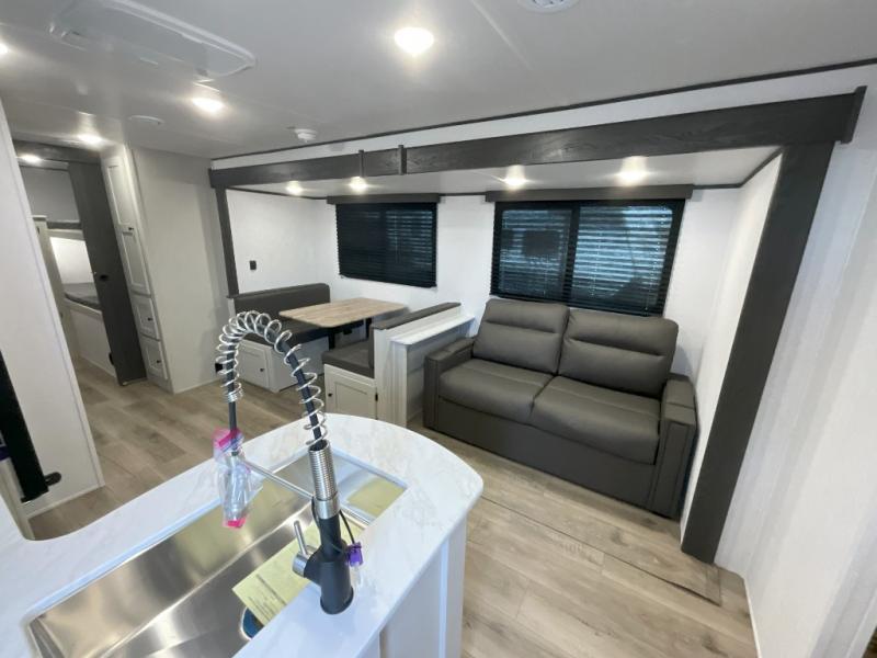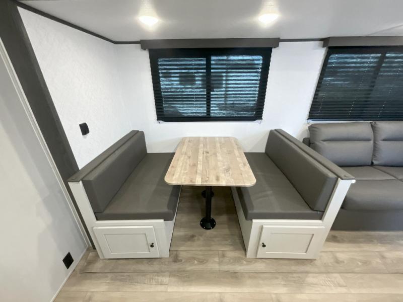 If you enjoy camping with a larger group, this travel trailer will be the perfect fit! There are quad bunks in the rear bunkhouse plus washer and dryer prep if you choose to add these appliances. You'll enjoy your own space up front in the private bedroom, which features a walk-around queen bed, dual bedside wardrobes and nightstands, plus underbed storage for extra blankets! Everyone can meet in the combined kitchen and living area while the chef makes breakfast on the two burner cooktop. There is also a microwave here, plus a 12V refrigerator and large pantry for food storage. Your crew can dine at the booth dinette, relax on the sofa with a theater seating option, or head outdoors to sit under the 16' power awning!