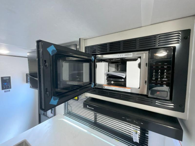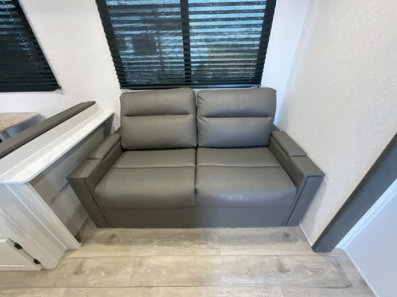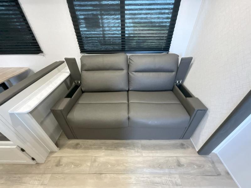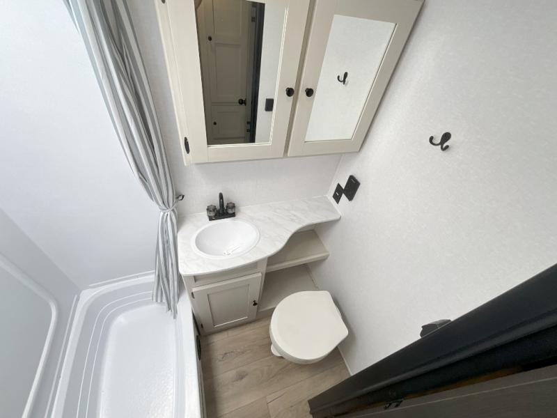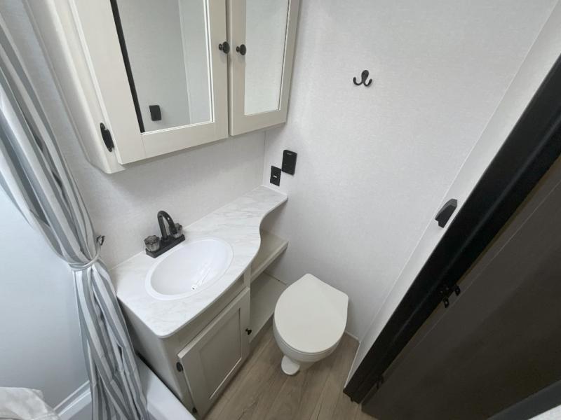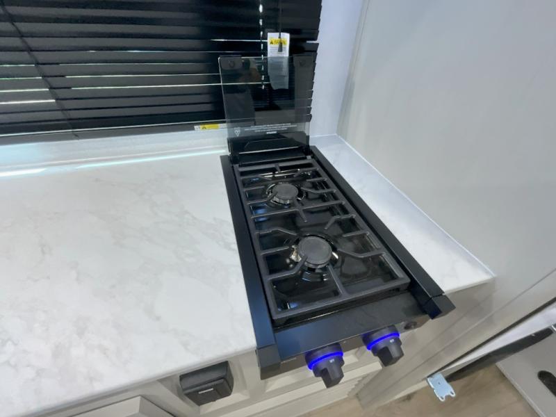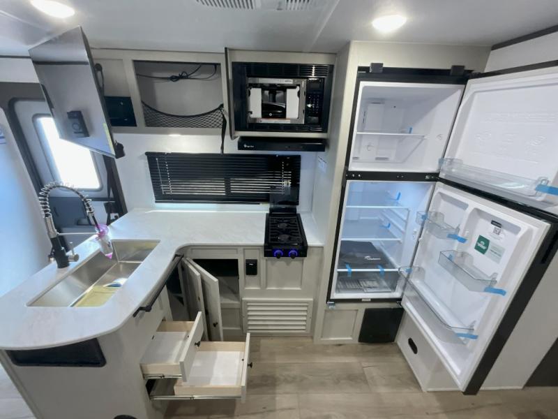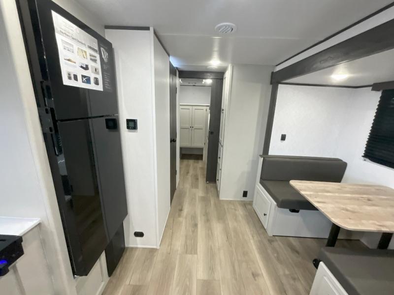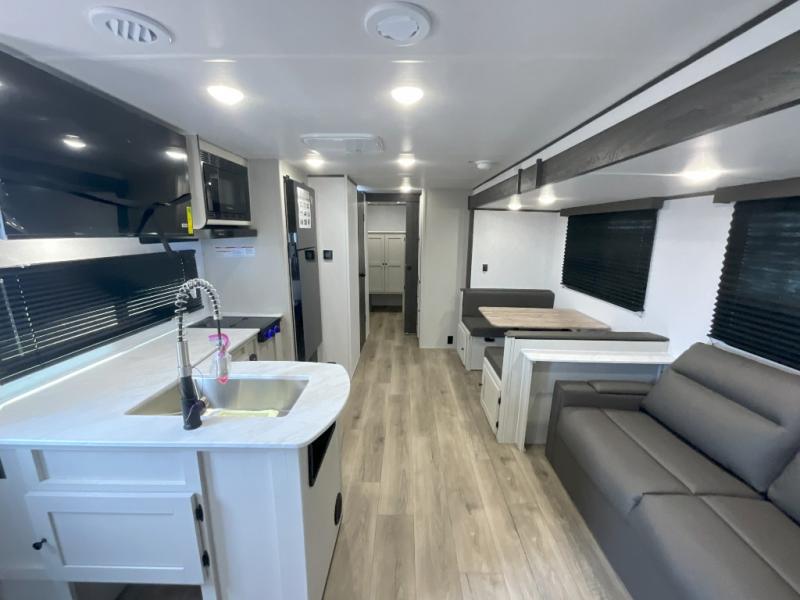 If you enjoy camping with a larger group, this travel trailer will be the perfect fit! There are quad bunks in the rear bunkhouse plus washer and dryer prep if you choose to add these appliances. You'll enjoy your own space up front in the private bedroom, which features a walk-around queen bed, dual bedside wardrobes and nightstands, plus underbed storage for extra blankets! Everyone can meet in the combined kitchen and living area while the chef makes breakfast on the two burner cooktop. There is also a microwave here, plus a 12V refrigerator and large pantry for food storage. Your crew can dine at the booth dinette, relax on the sofa with a theater seating option, or head outdoors to sit under the 16' power awning!